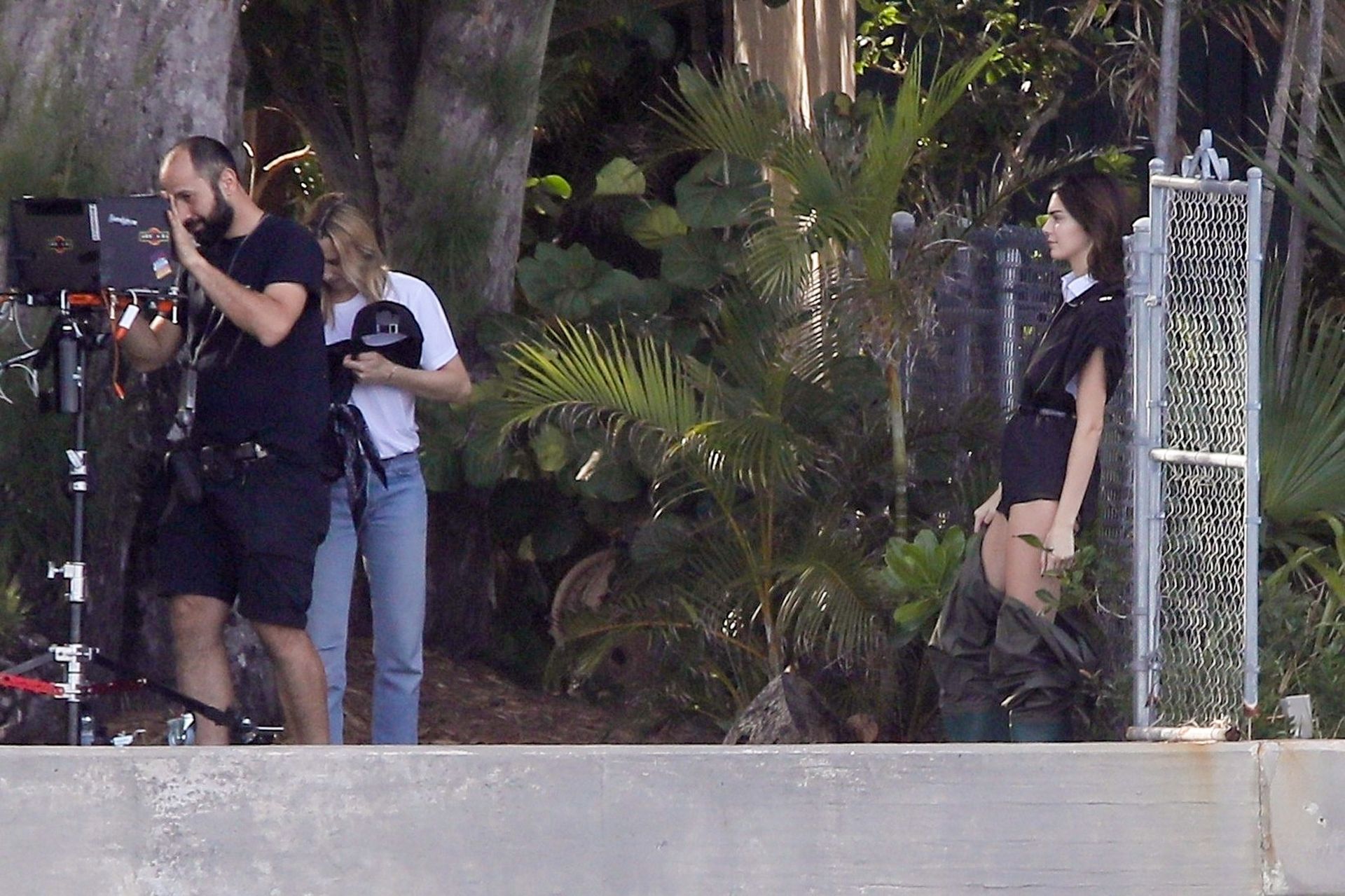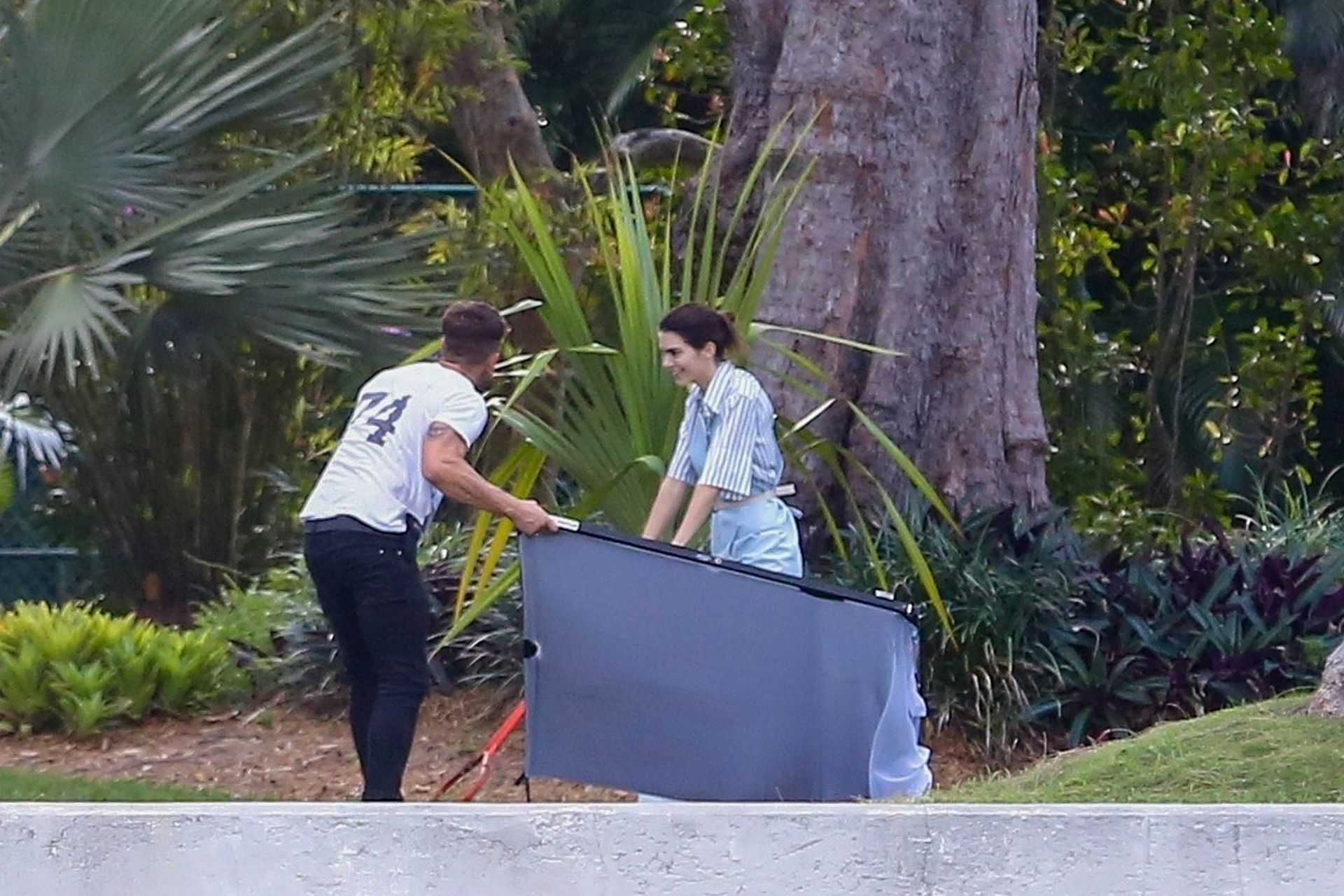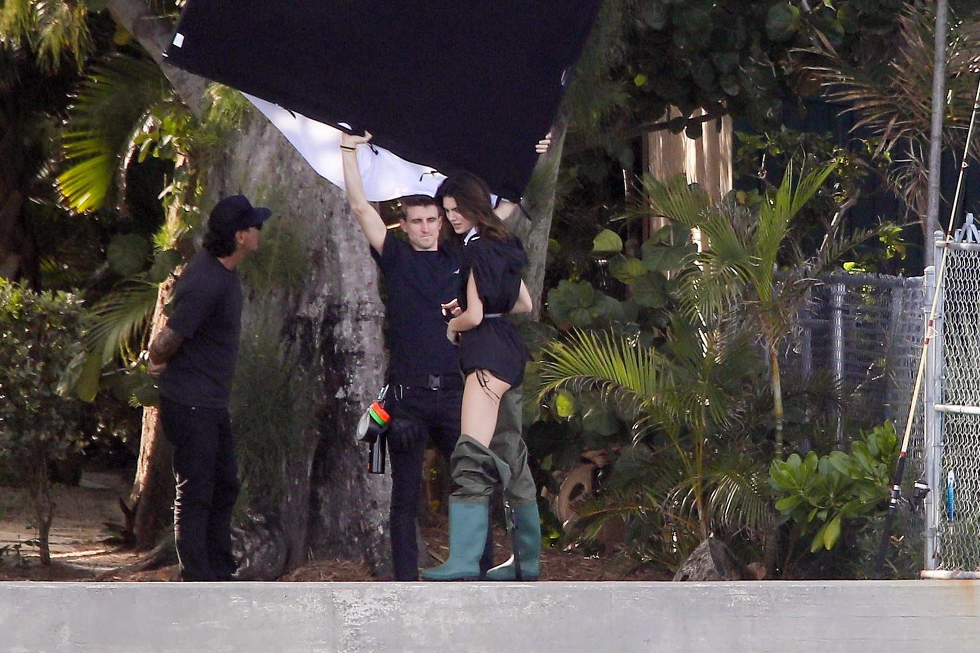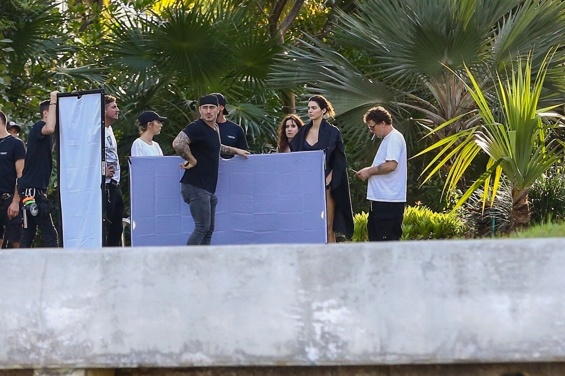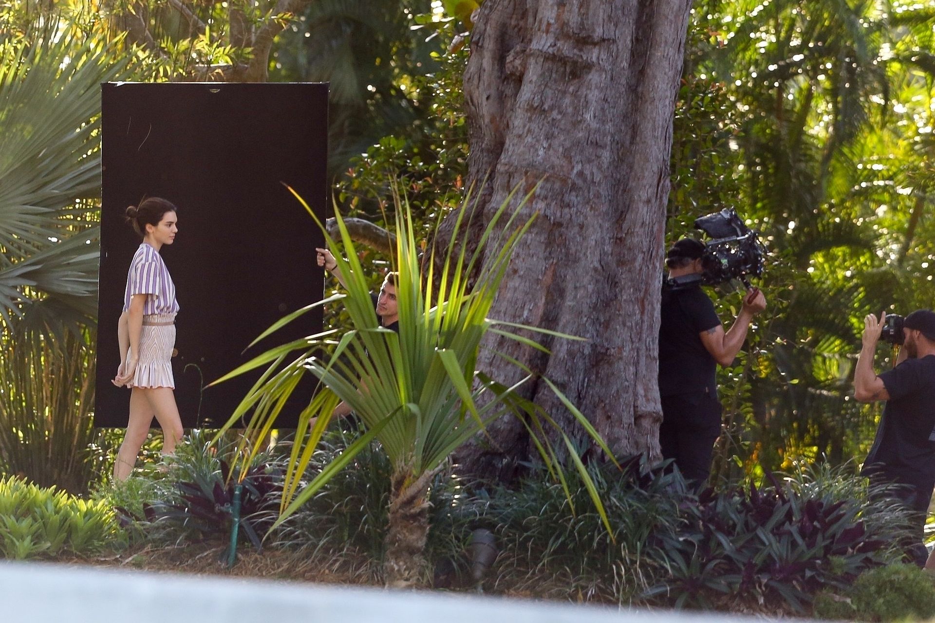 Kendall Jenner slips out of a baby blue outfit and changes into a black ensemble during a photoshoot. Kendall Jenner was wearing a bikini and spraying water out of a hose in Miami, 02/05/2020.