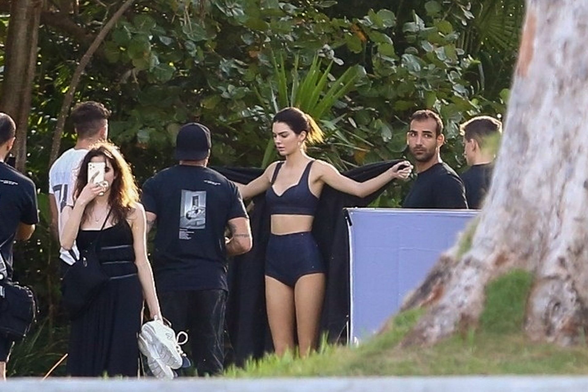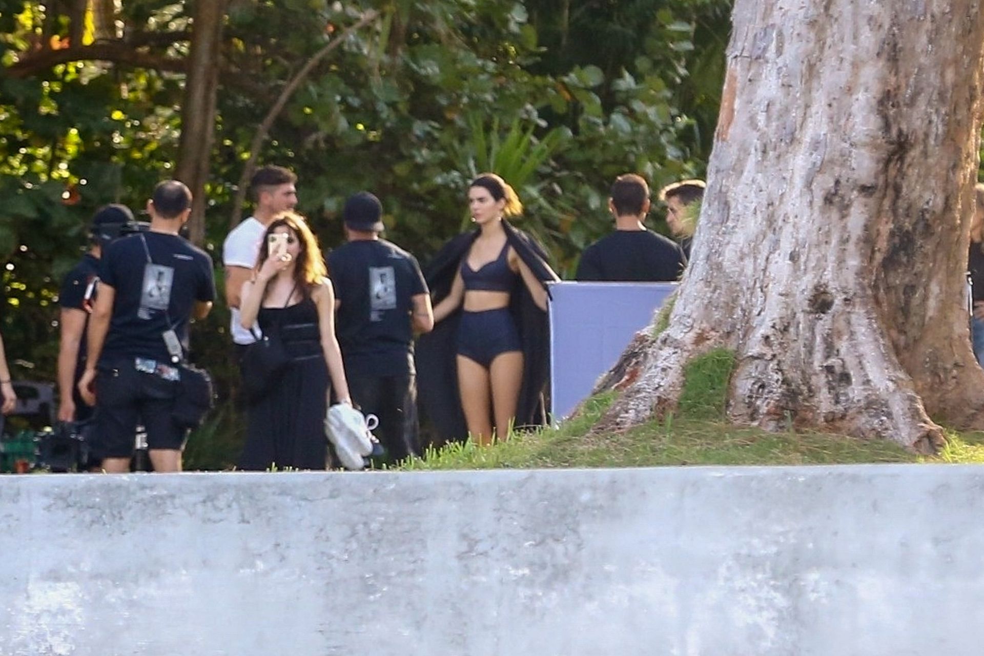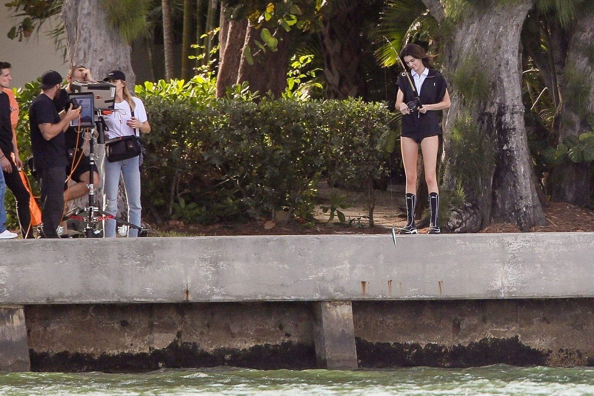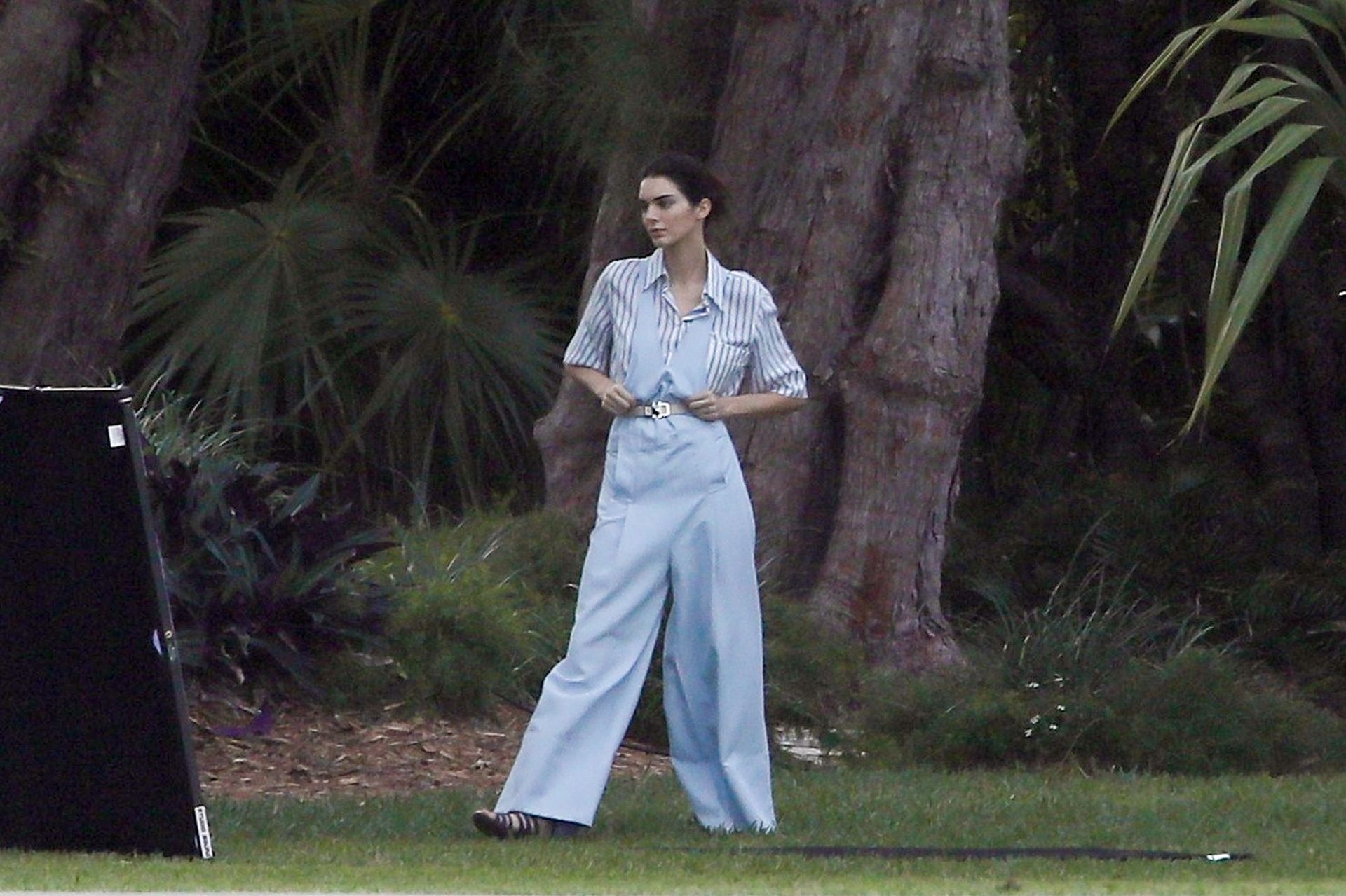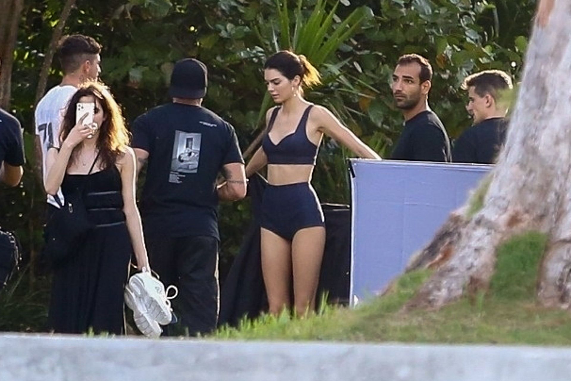 Kendall Jenner slips out of a baby blue outfit and changes into a black ensemble during a photoshoot. Kendall Jenner was wearing a bikini and spraying water out of a hose in Miami, 02/05/2020.
