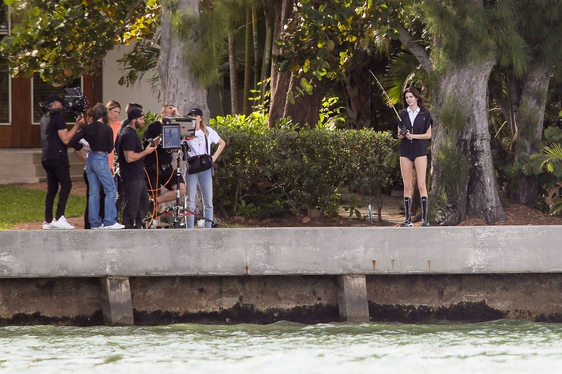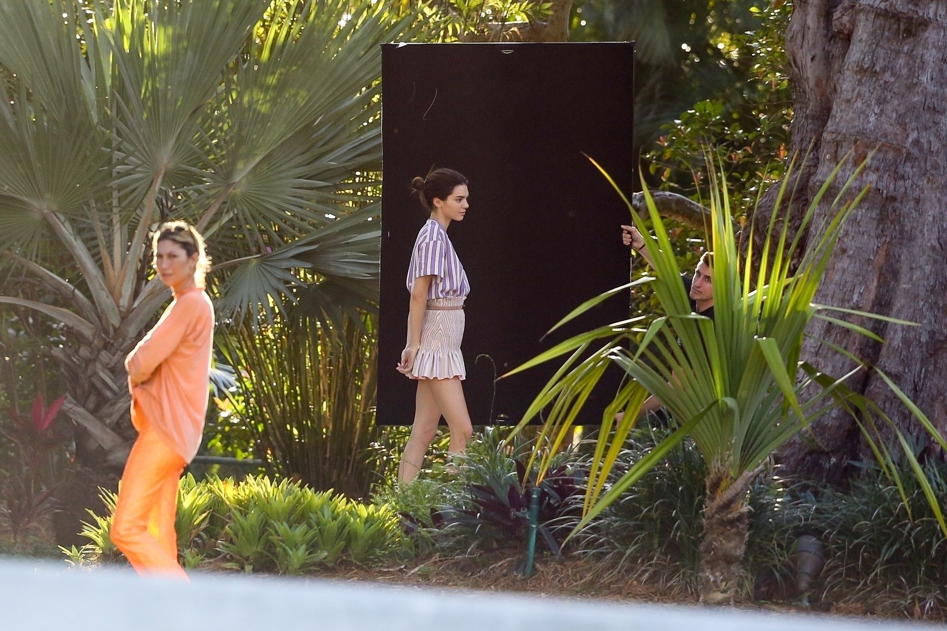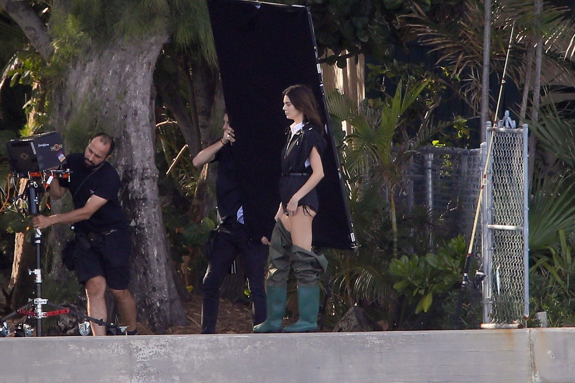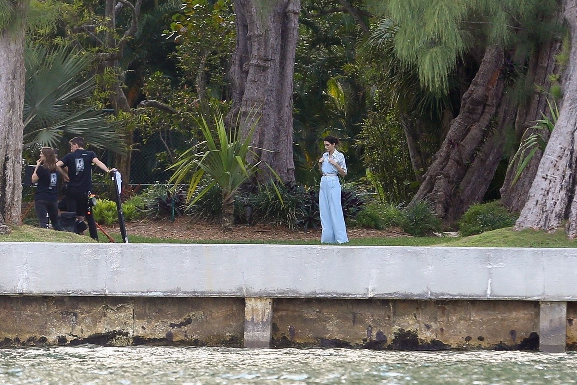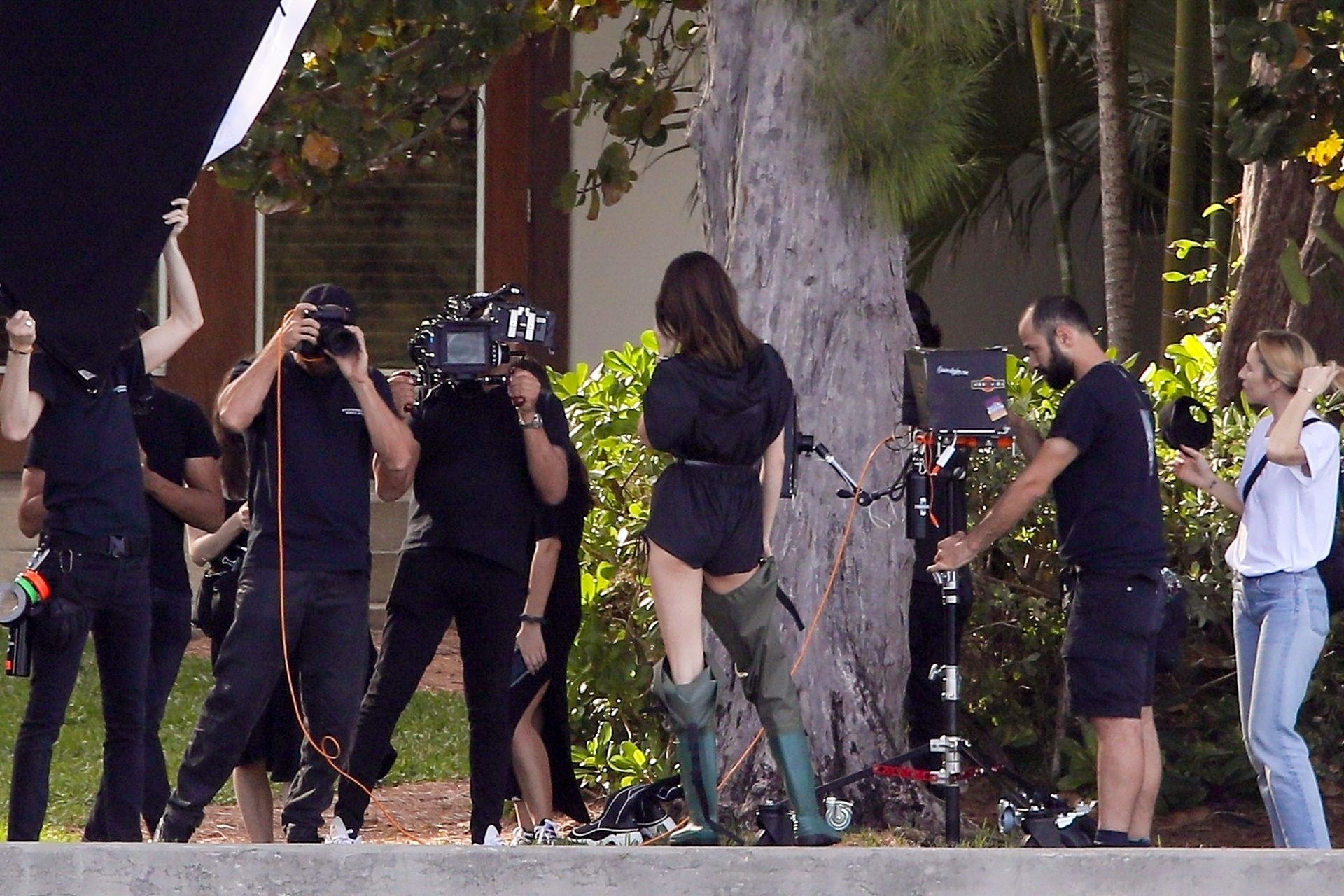 Kendall Jenner slips out of a baby blue outfit and changes into a black ensemble during a photoshoot. Kendall Jenner was wearing a bikini and spraying water out of a hose in Miami, 02/05/2020.