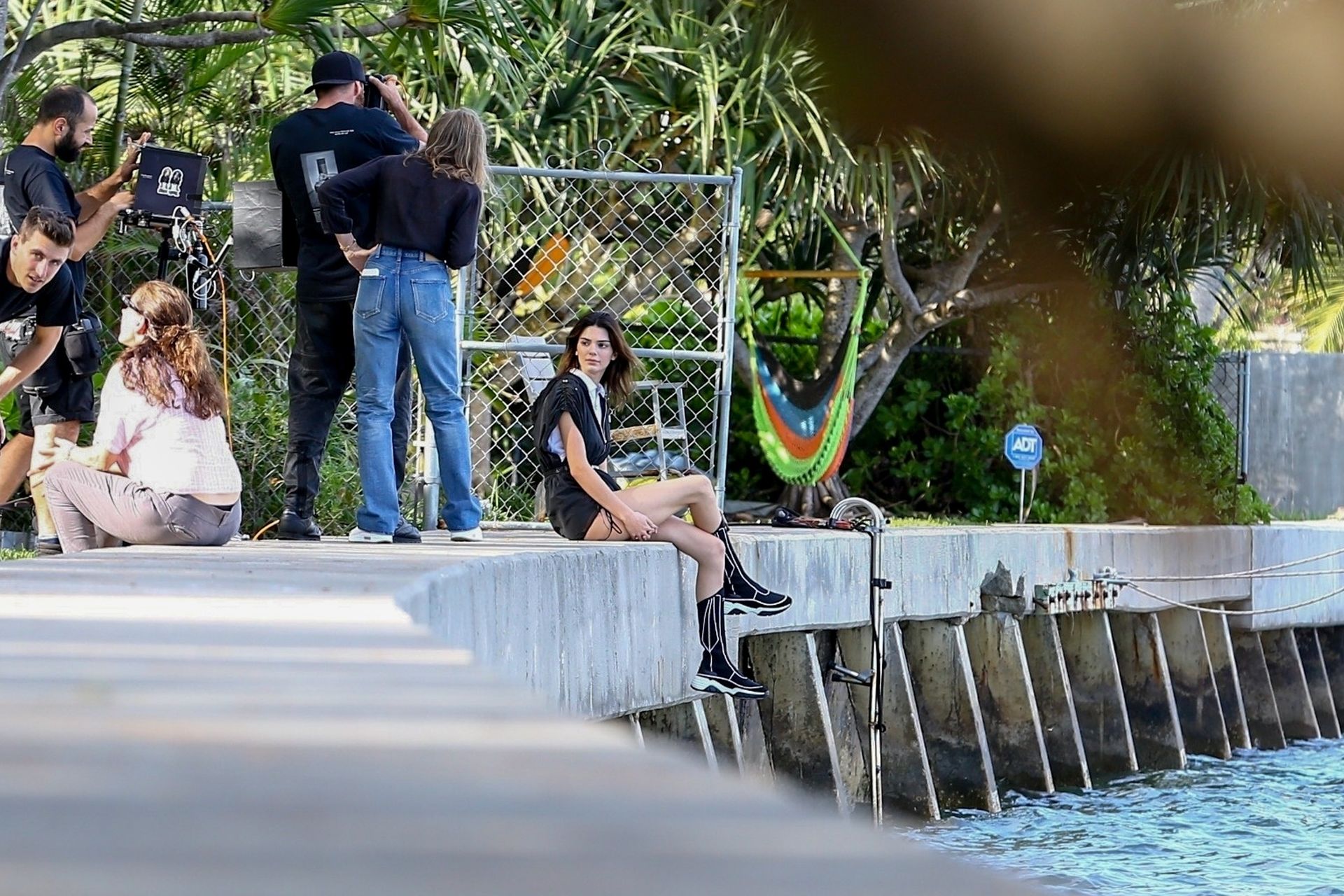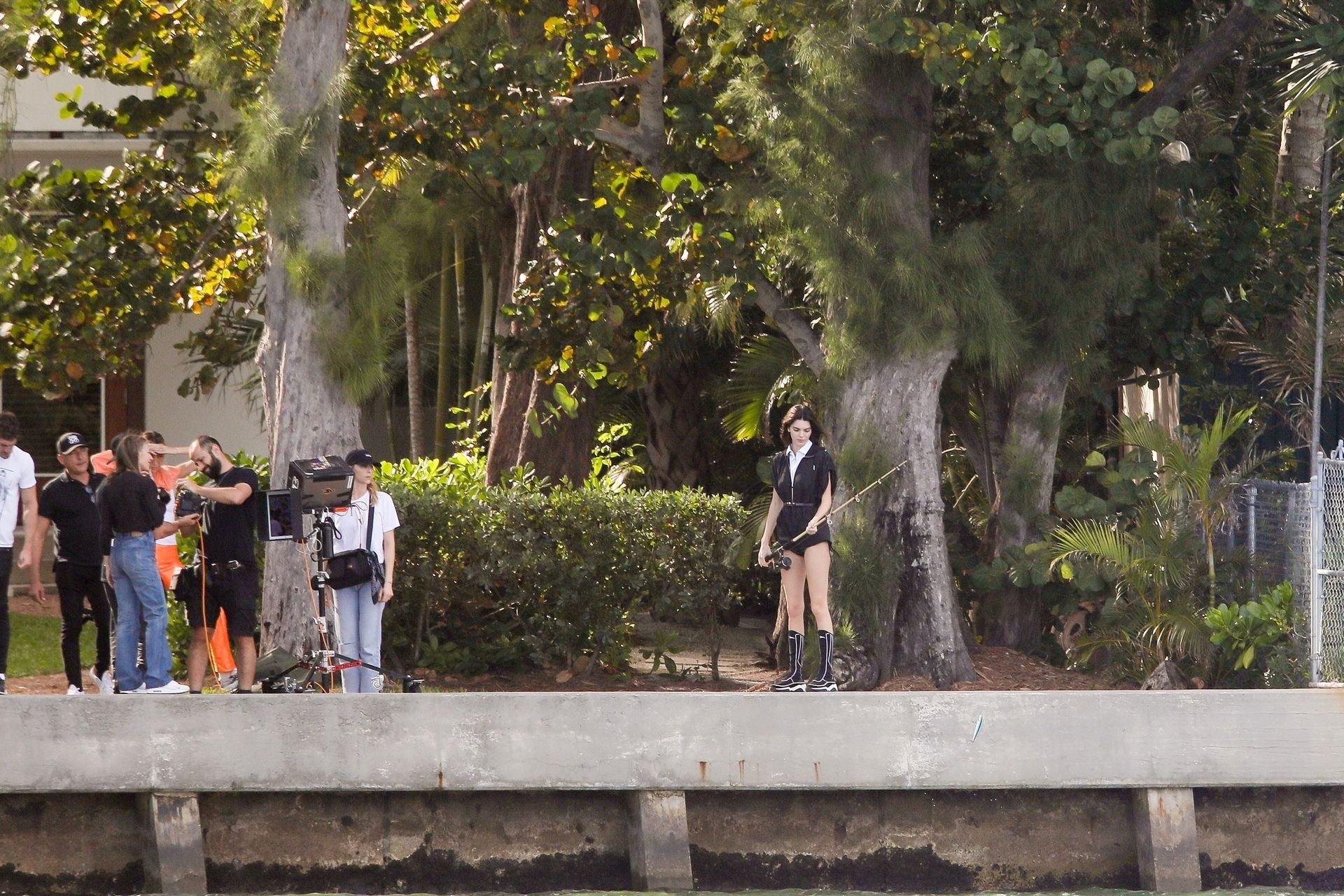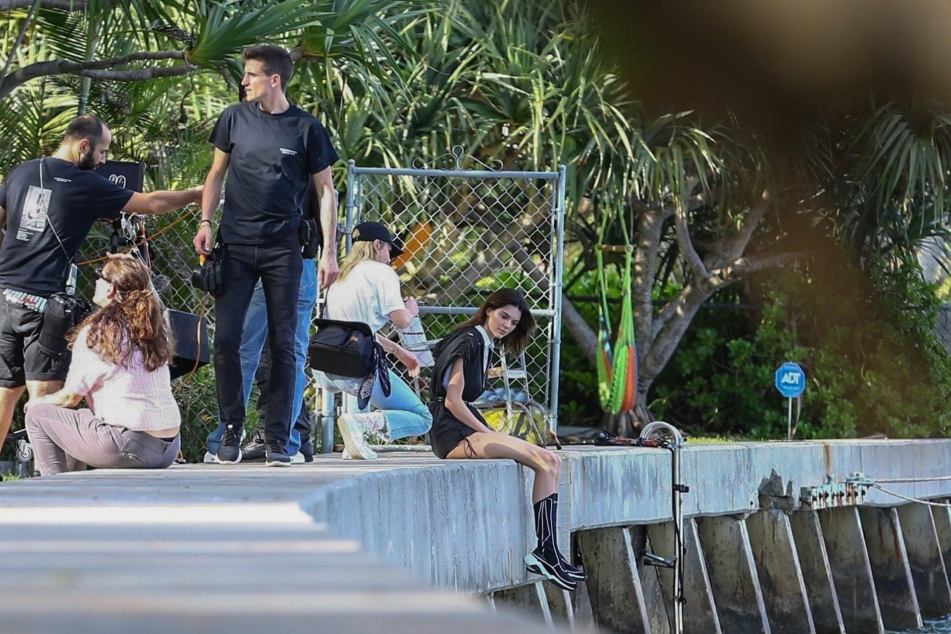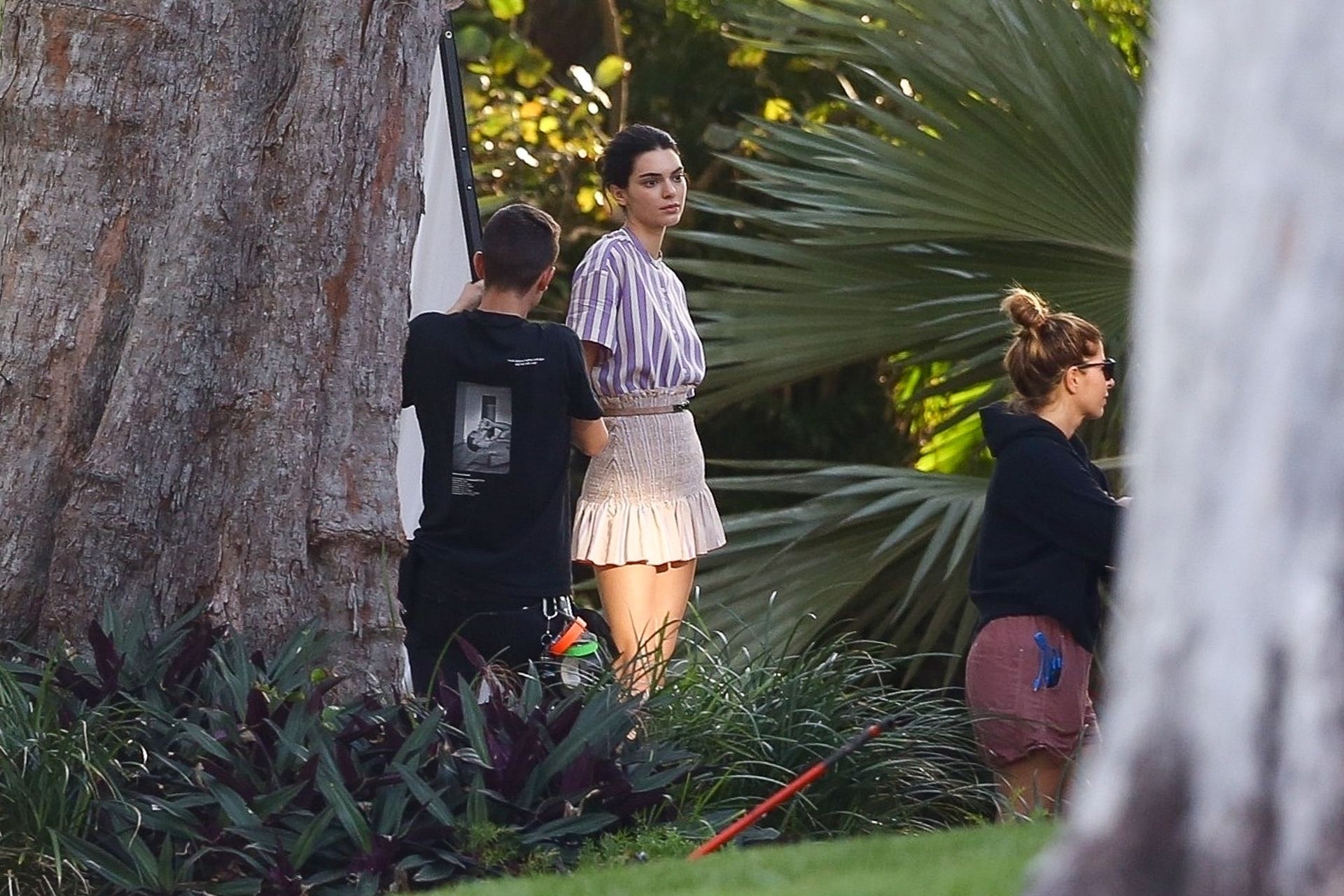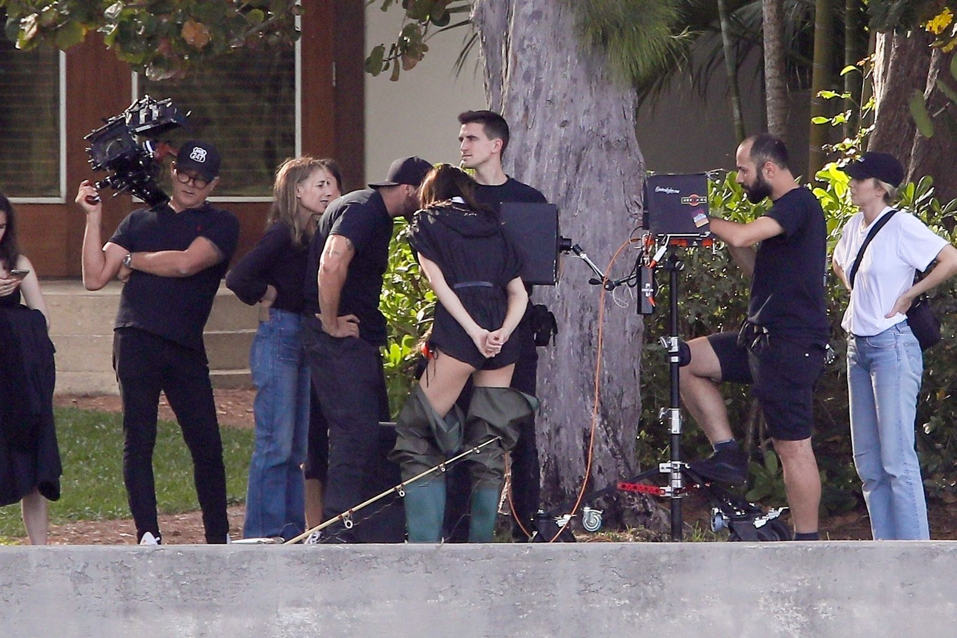 Kendall Jenner slips out of a baby blue outfit and changes into a black ensemble during a photoshoot. Kendall Jenner was wearing a bikini and spraying water out of a hose in Miami, 02/05/2020.