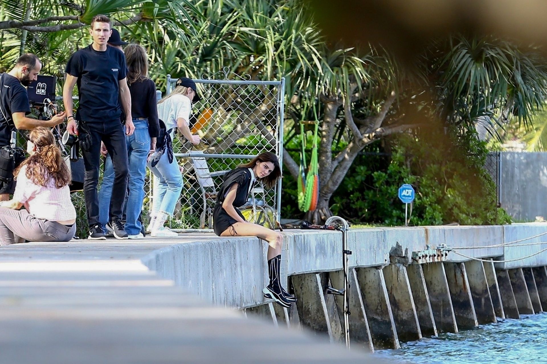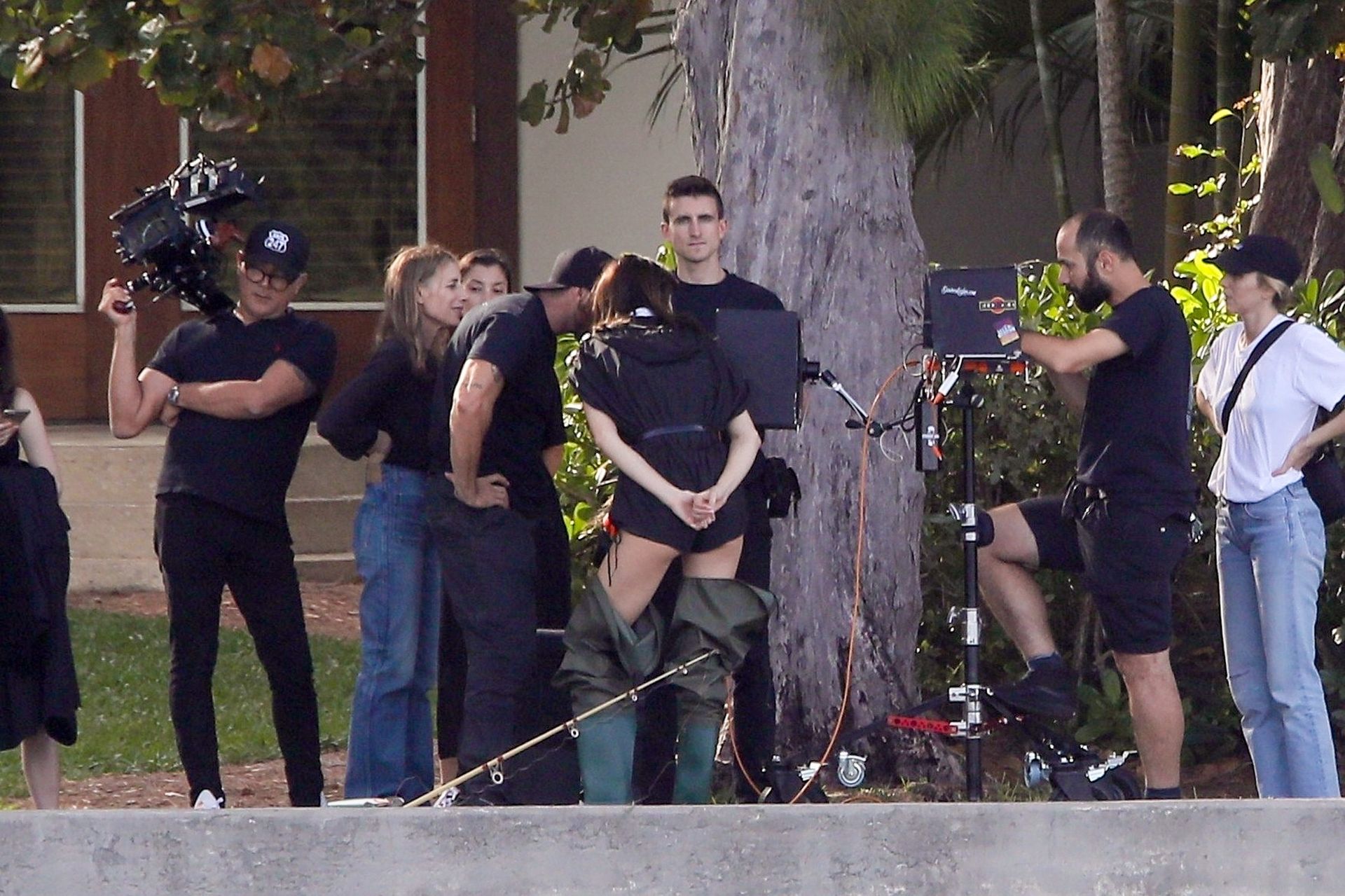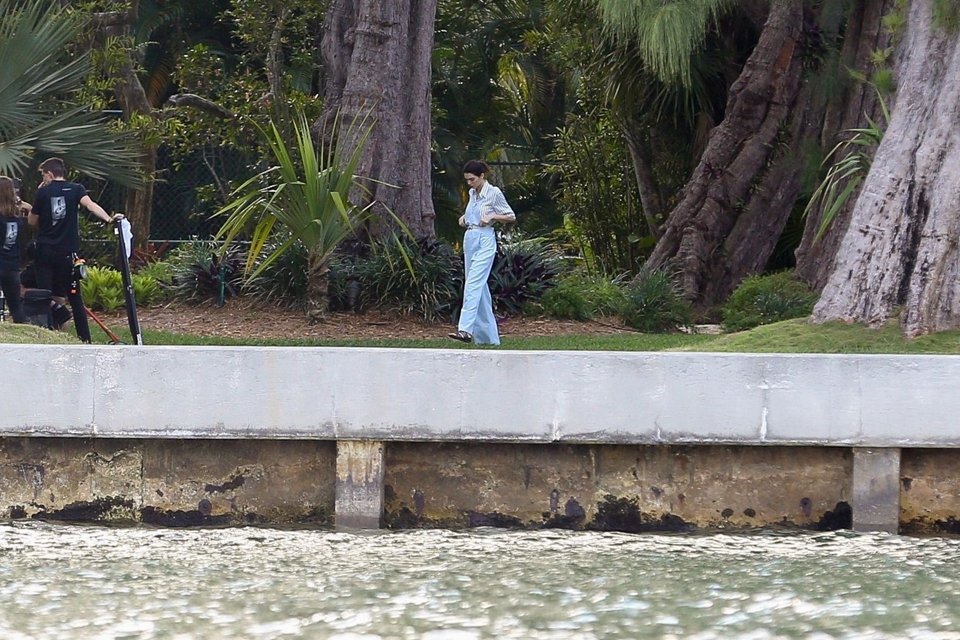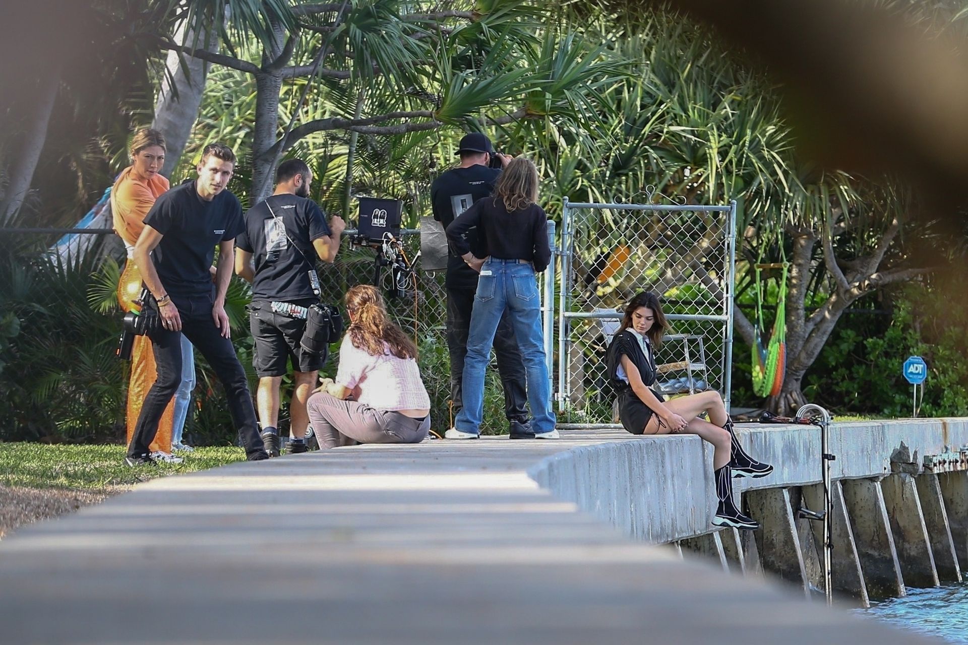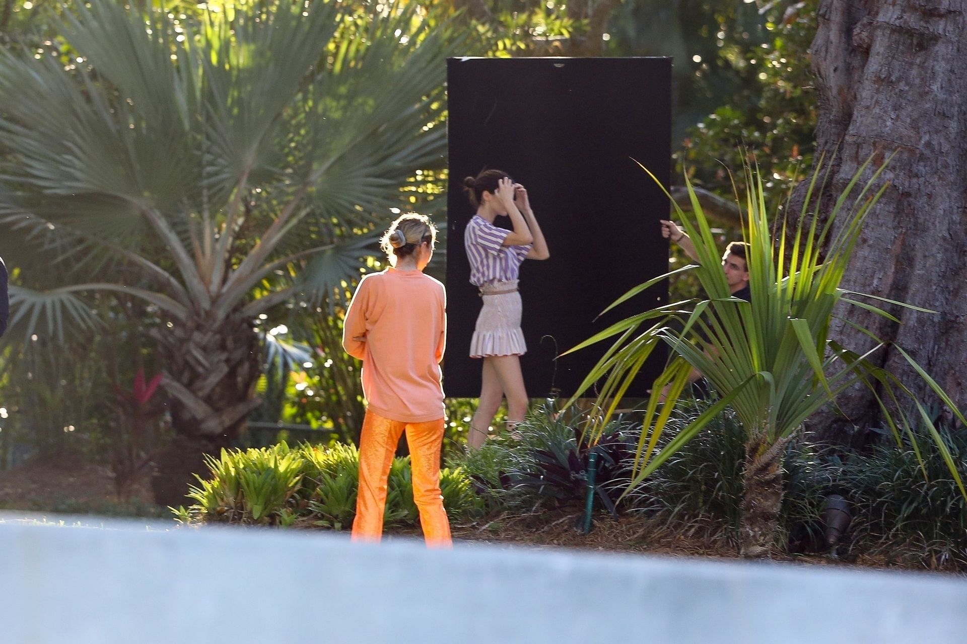 Kendall Jenner slips out of a baby blue outfit and changes into a black ensemble during a photoshoot. Kendall Jenner was wearing a bikini and spraying water out of a hose in Miami, 02/05/2020.