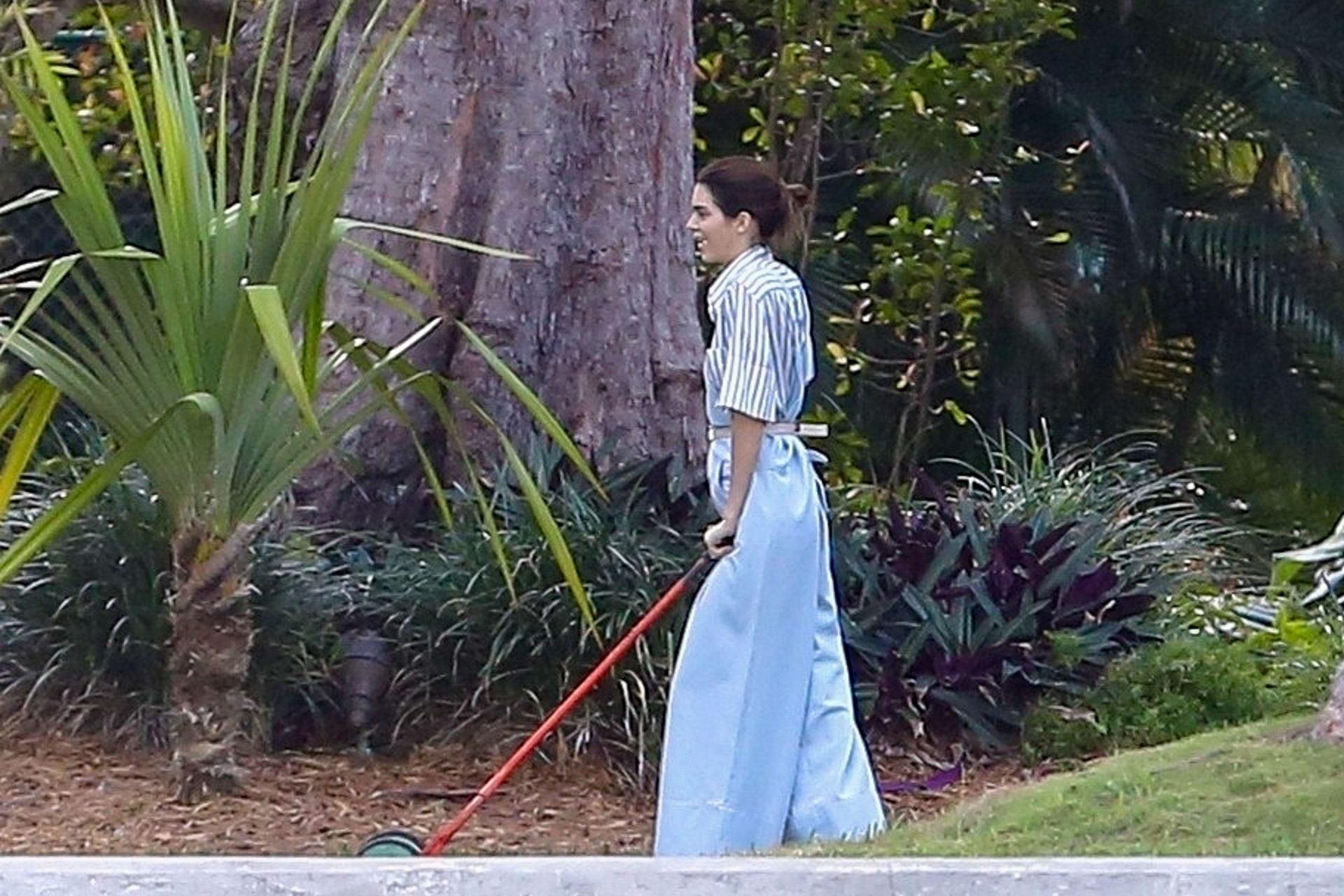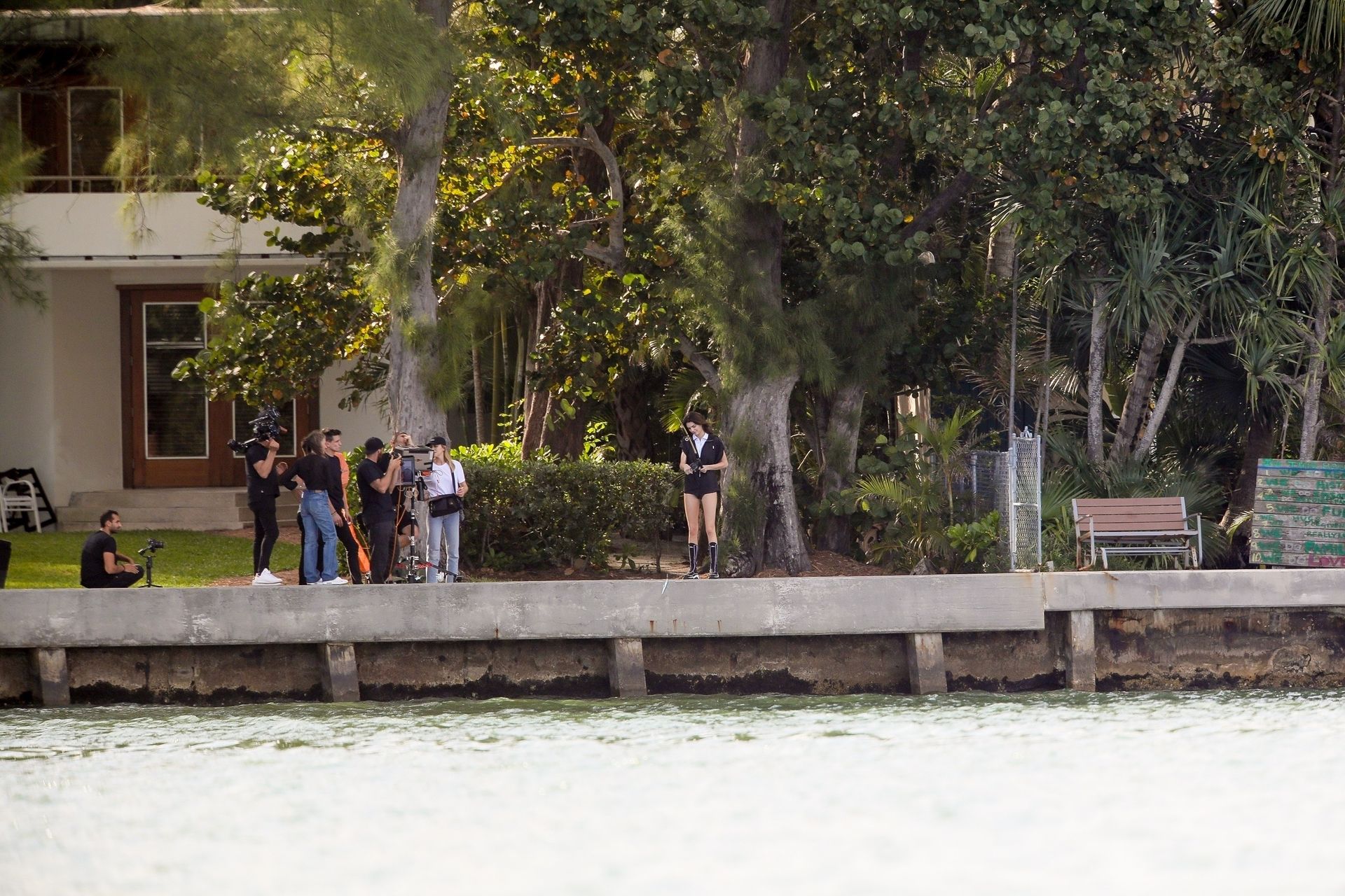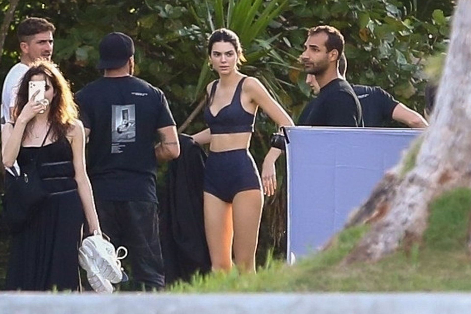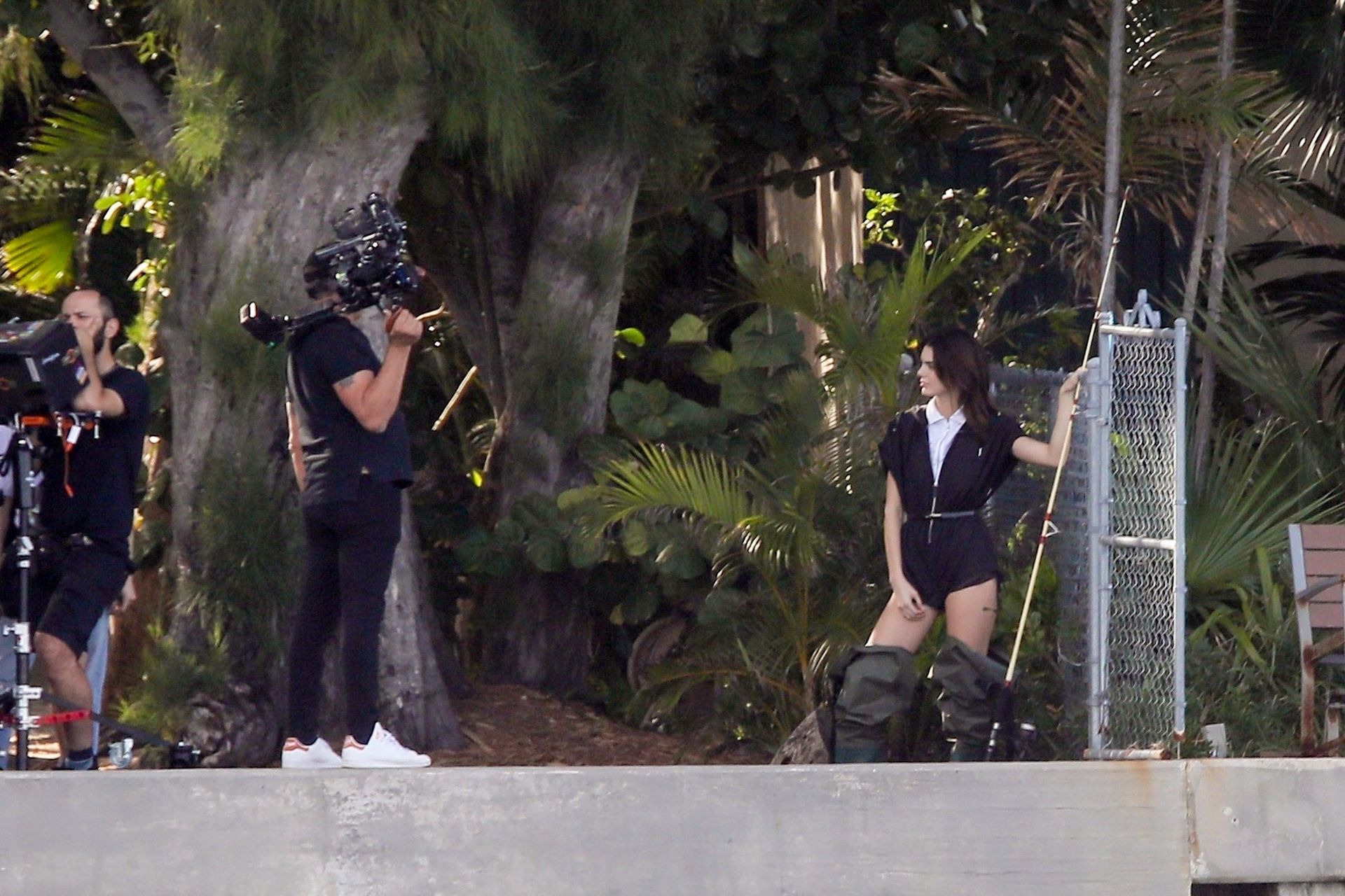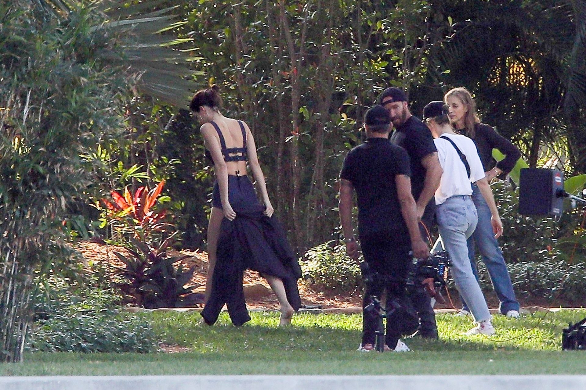 Kendall Jenner slips out of a baby blue outfit and changes into a black ensemble during a photoshoot. Kendall Jenner was wearing a bikini and spraying water out of a hose in Miami, 02/05/2020.