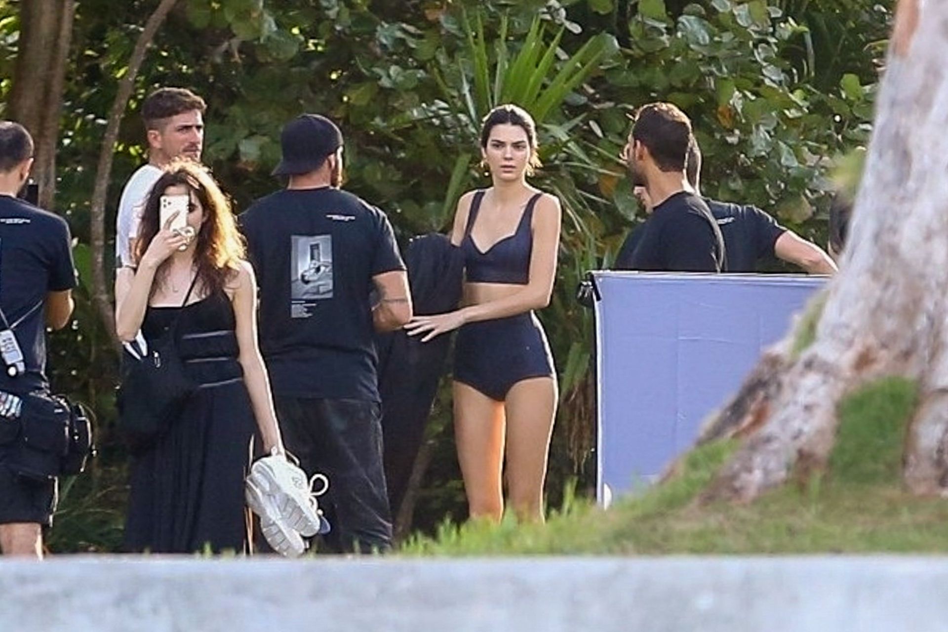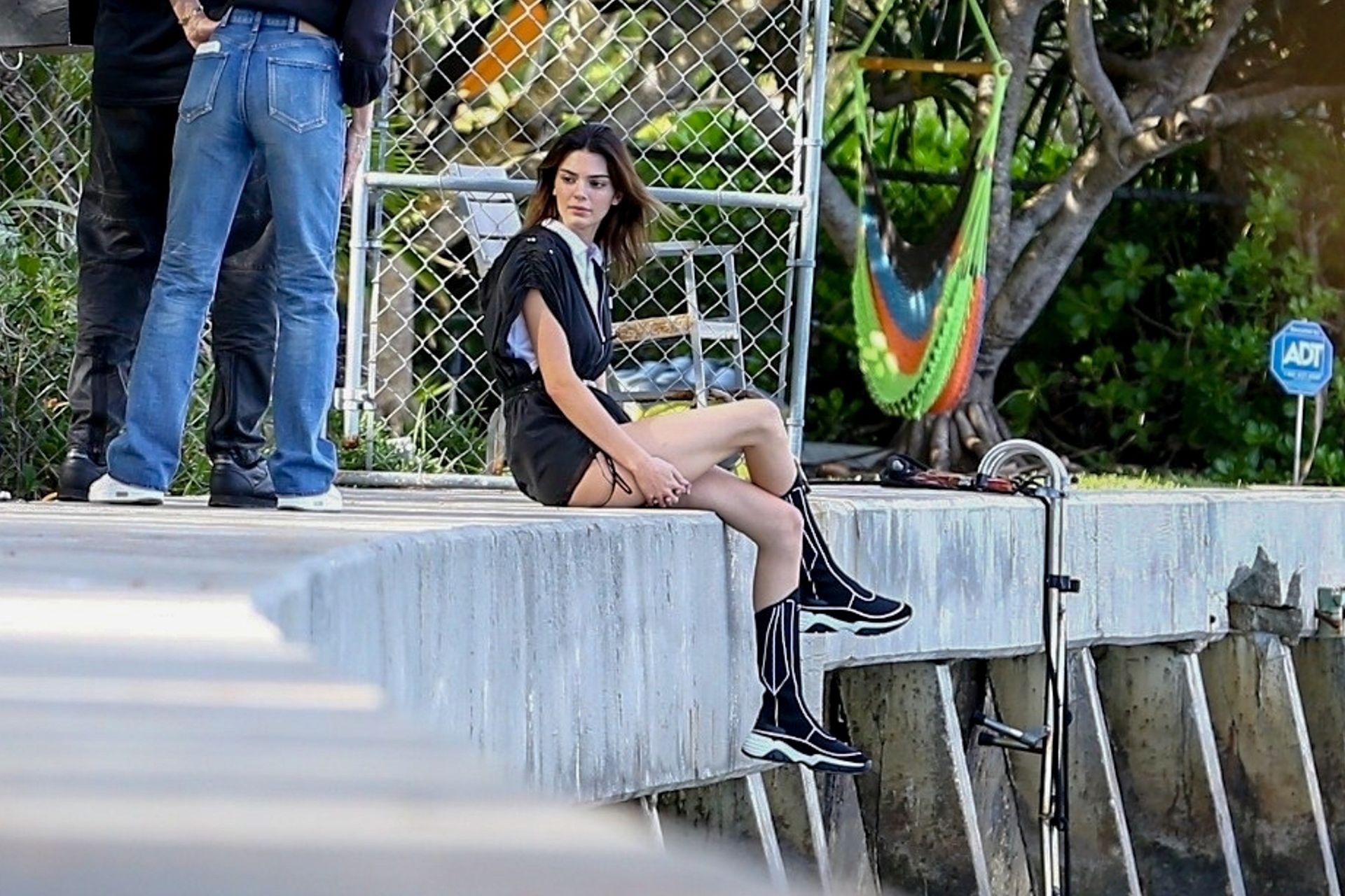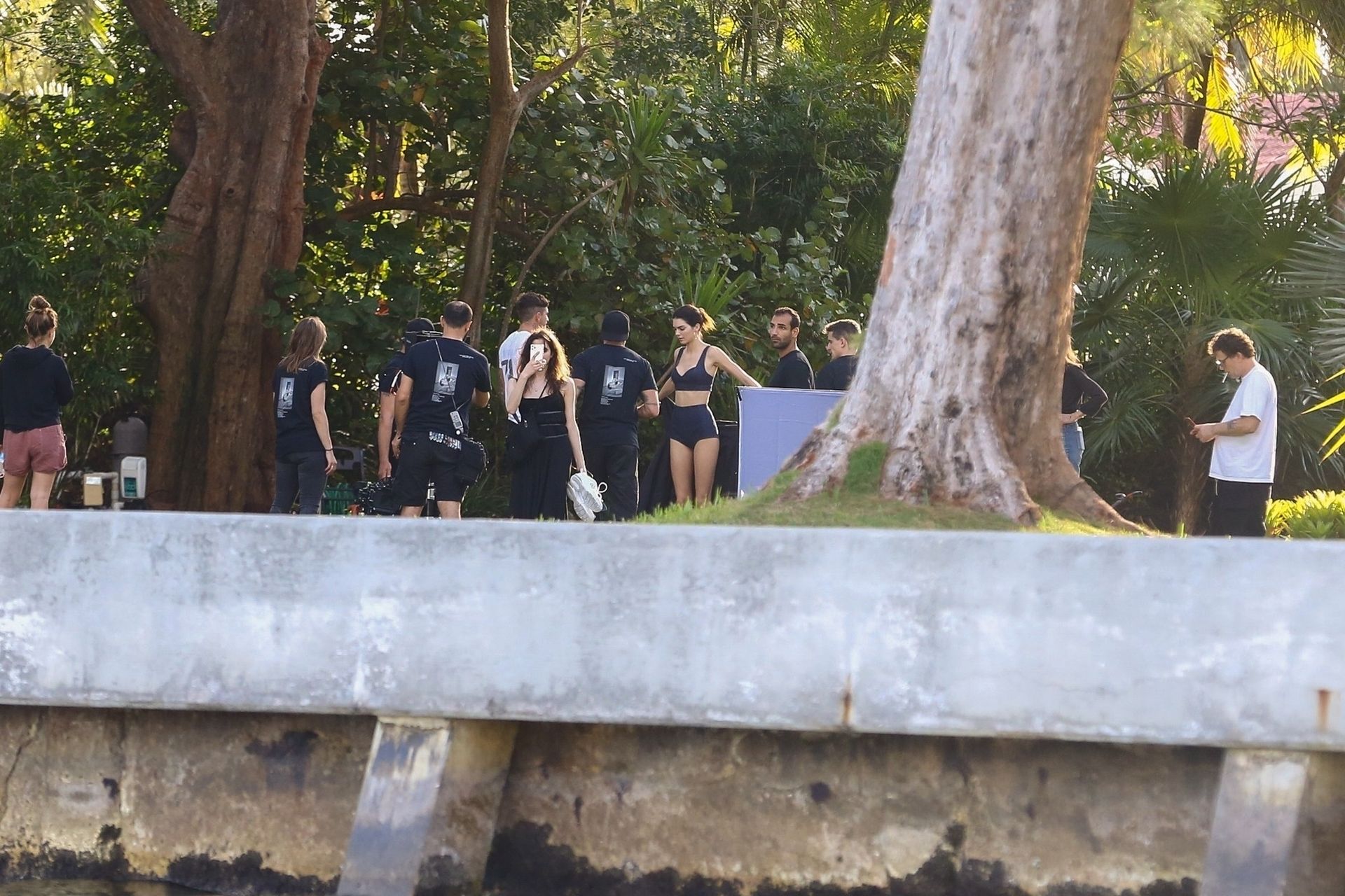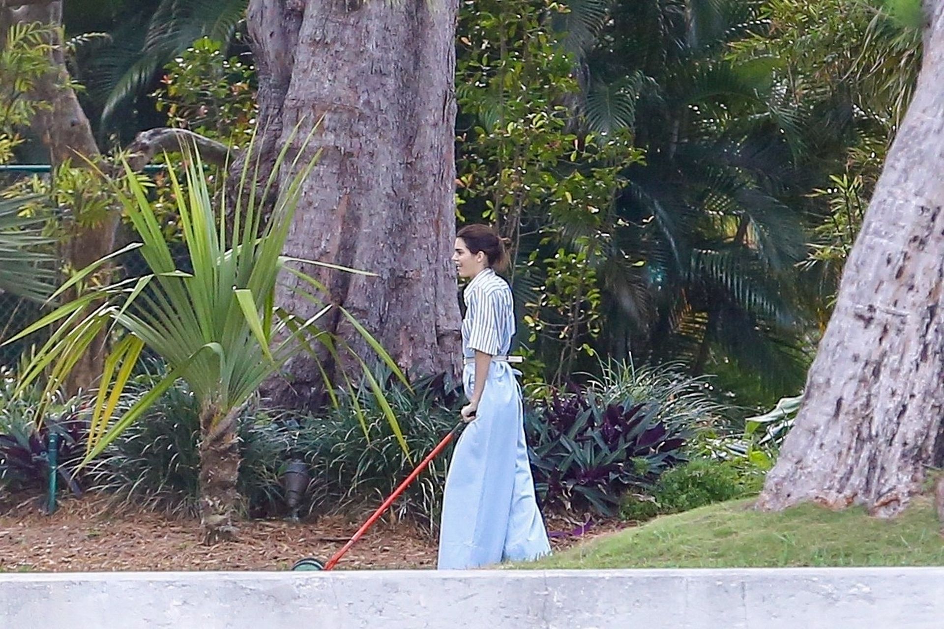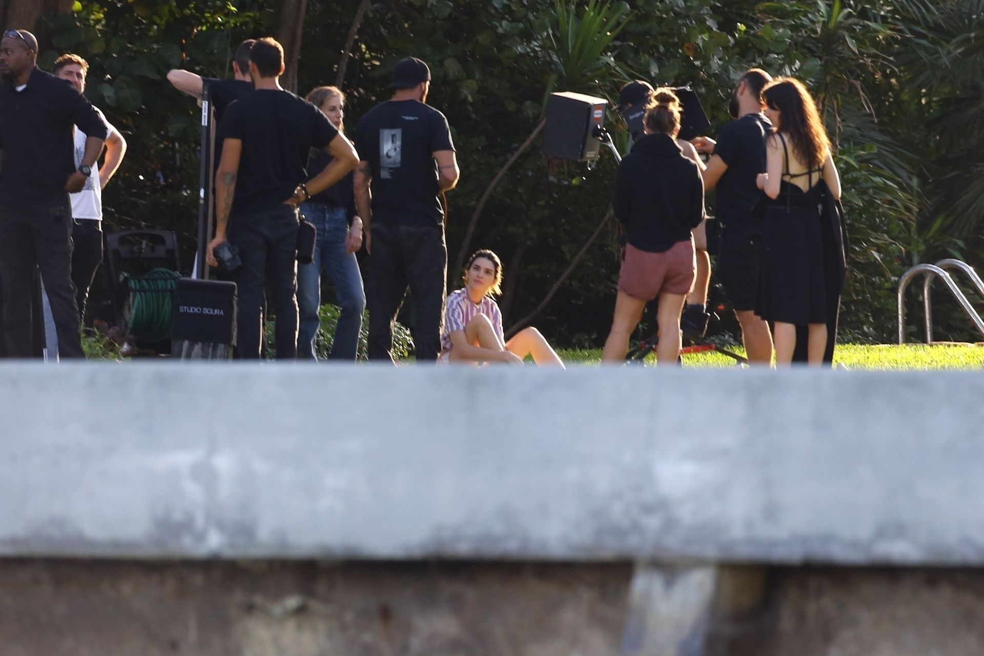Kendall Jenner slips out of a baby blue outfit and changes into a black ensemble during a photoshoot. Kendall Jenner was wearing a bikini and spraying water out of a hose in Miami, 02/05/2020.