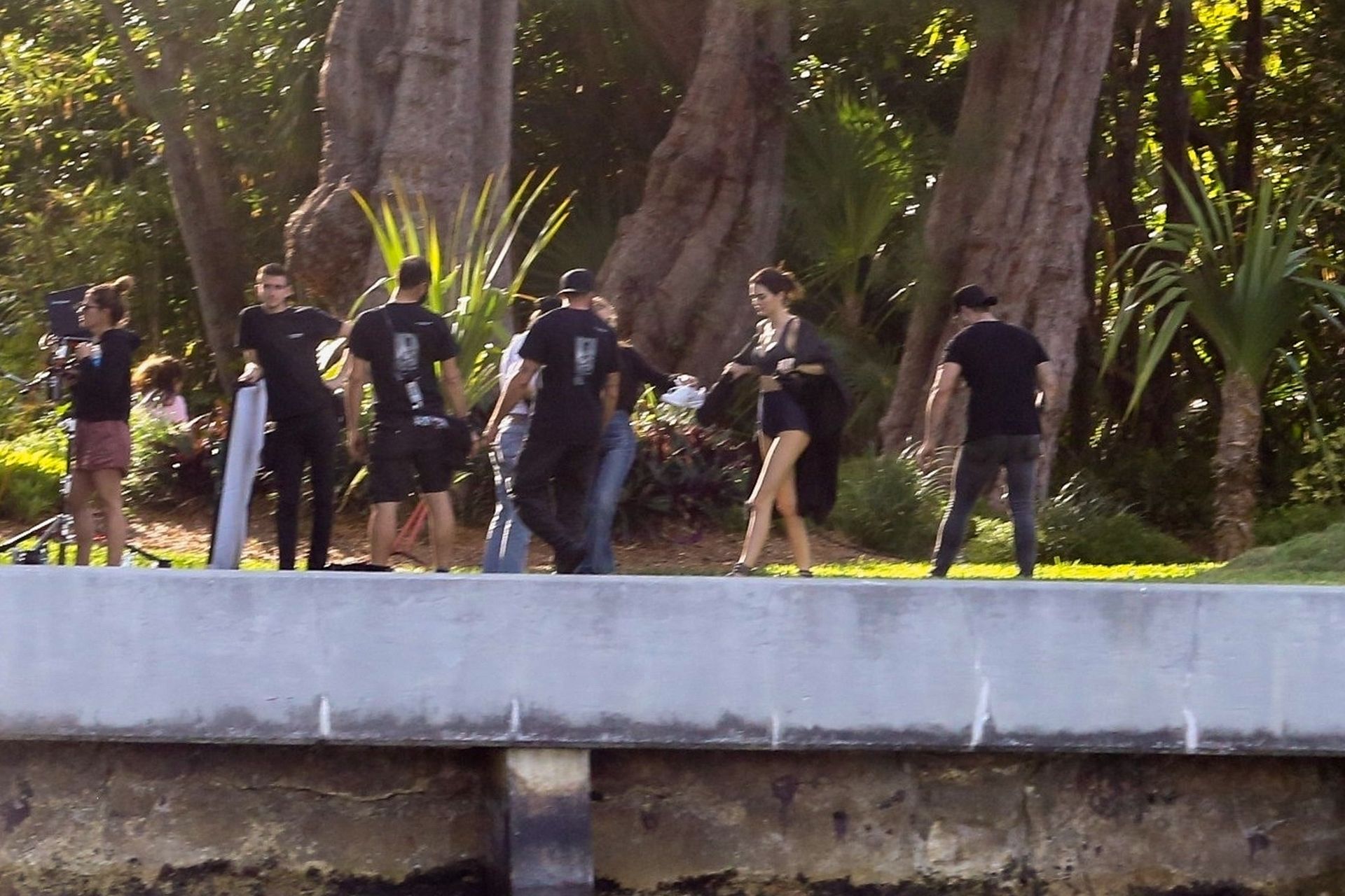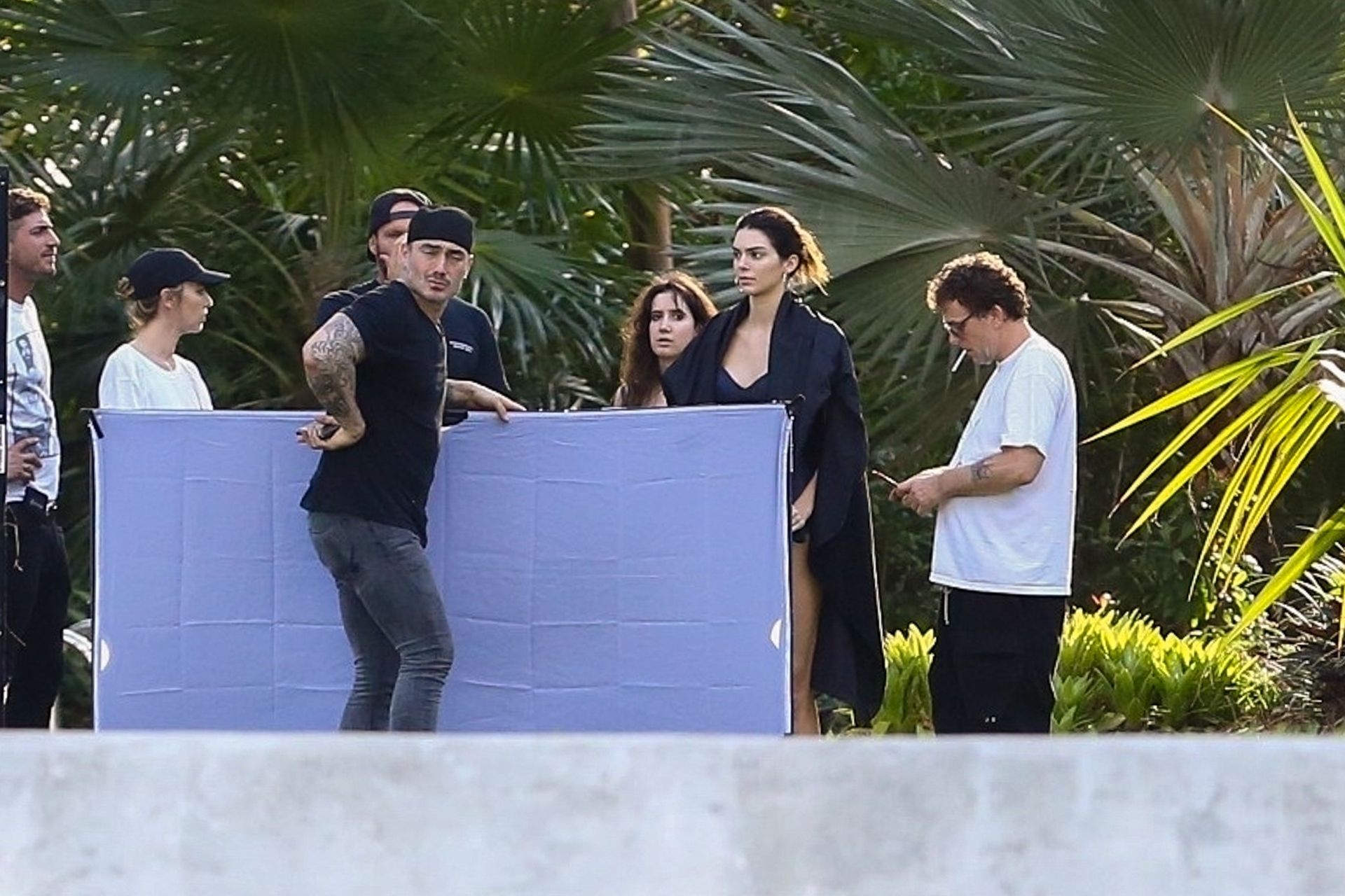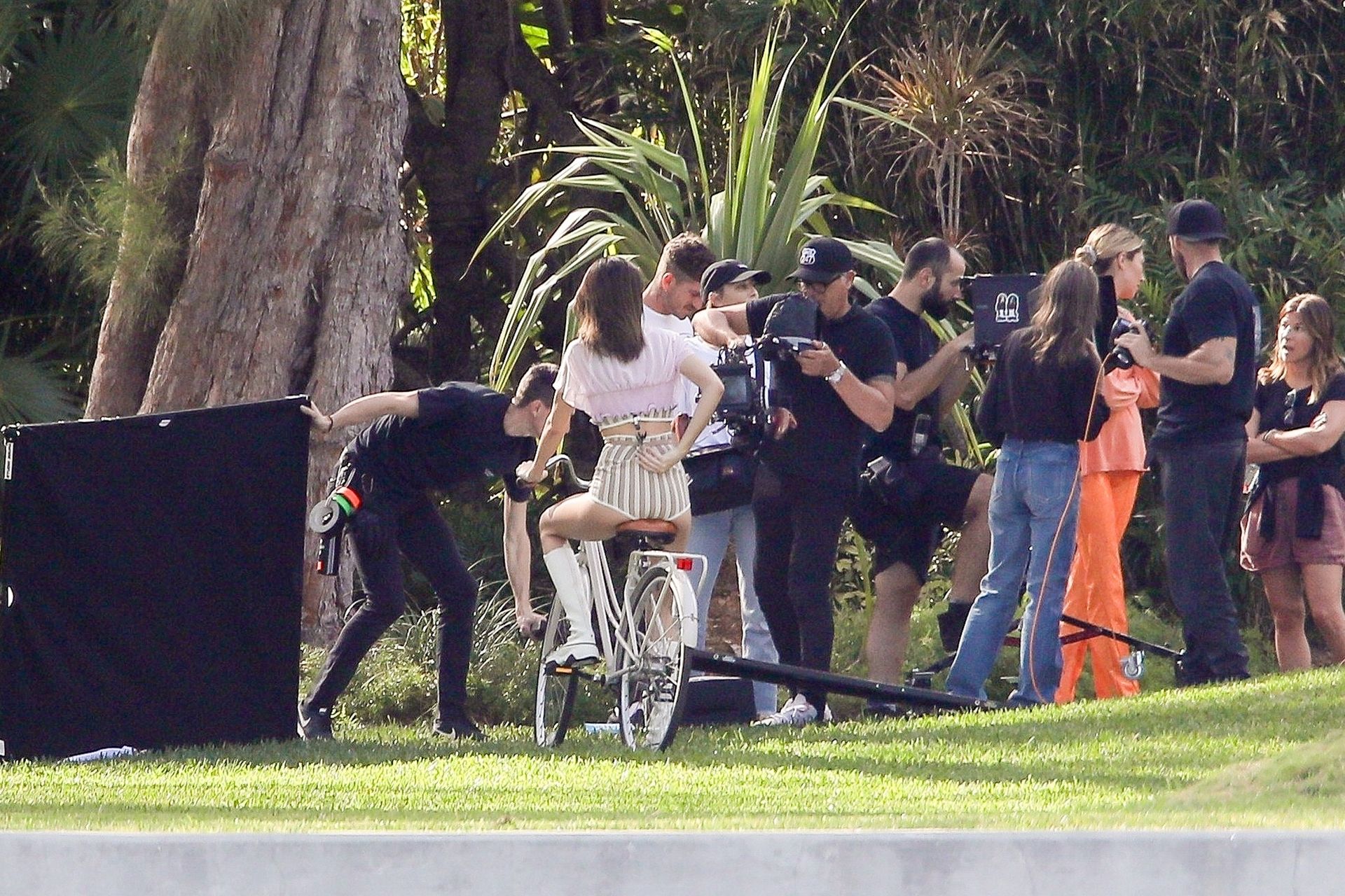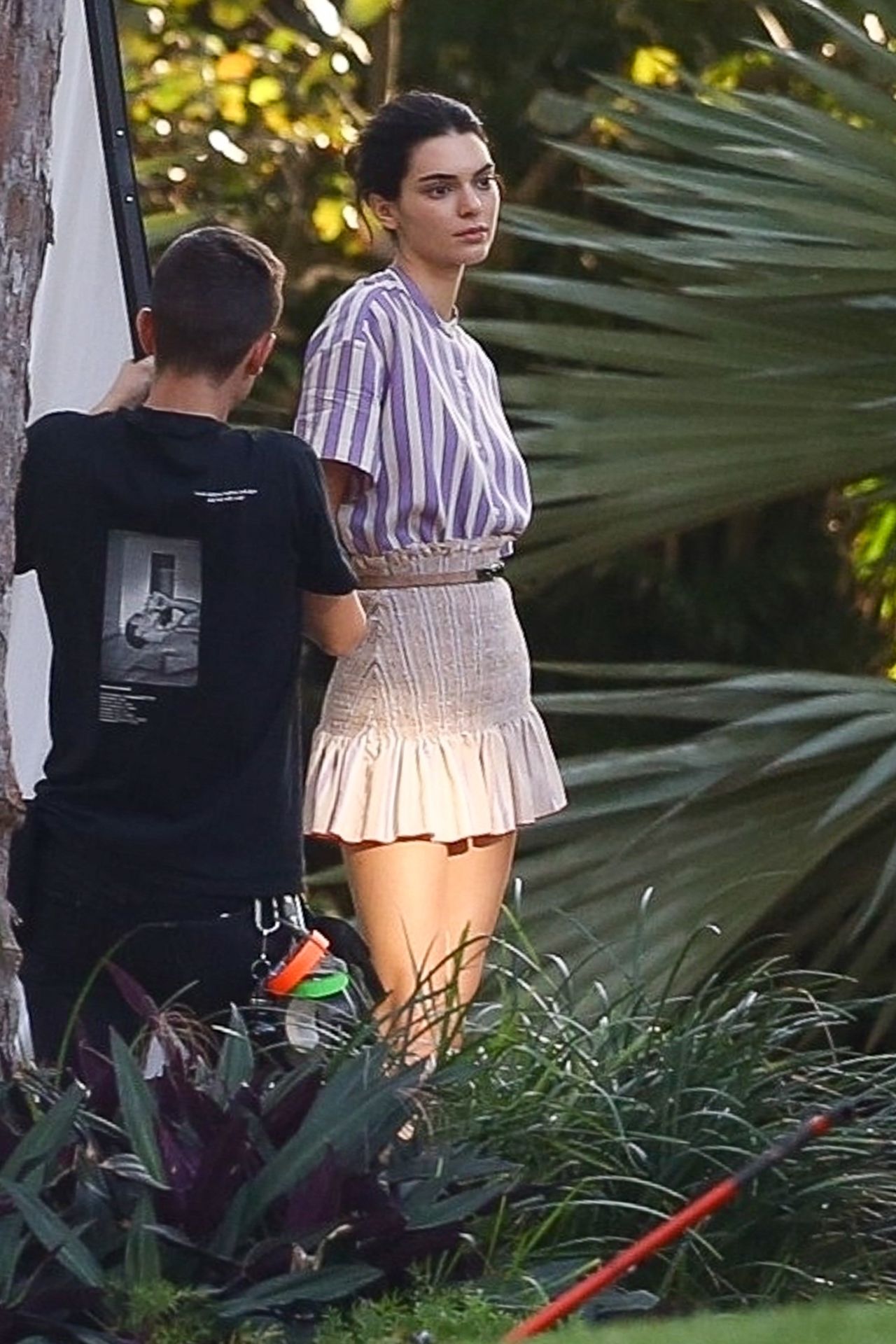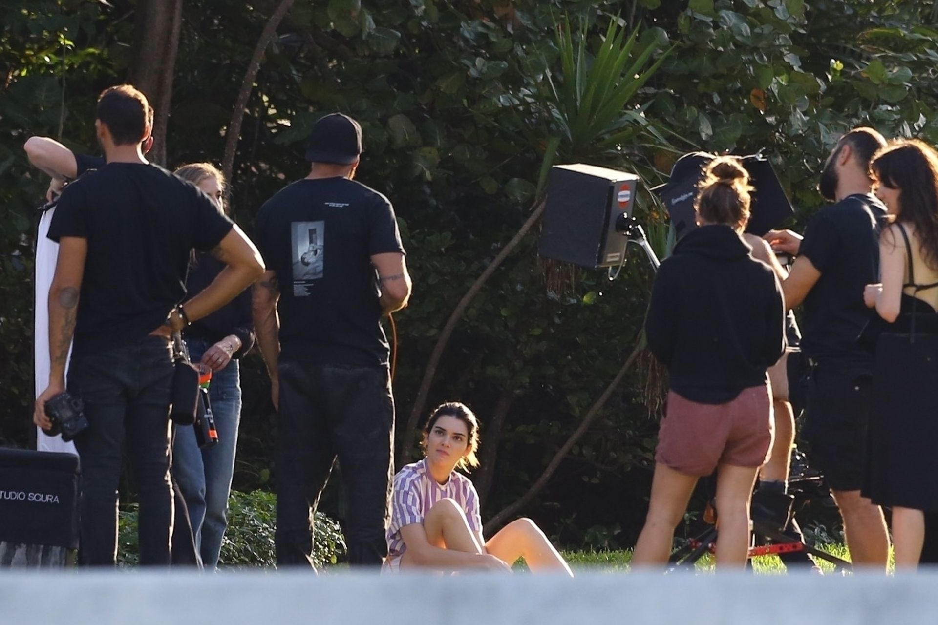 Kendall Jenner slips out of a baby blue outfit and changes into a black ensemble during a photoshoot. Kendall Jenner was wearing a bikini and spraying water out of a hose in Miami, 02/05/2020.