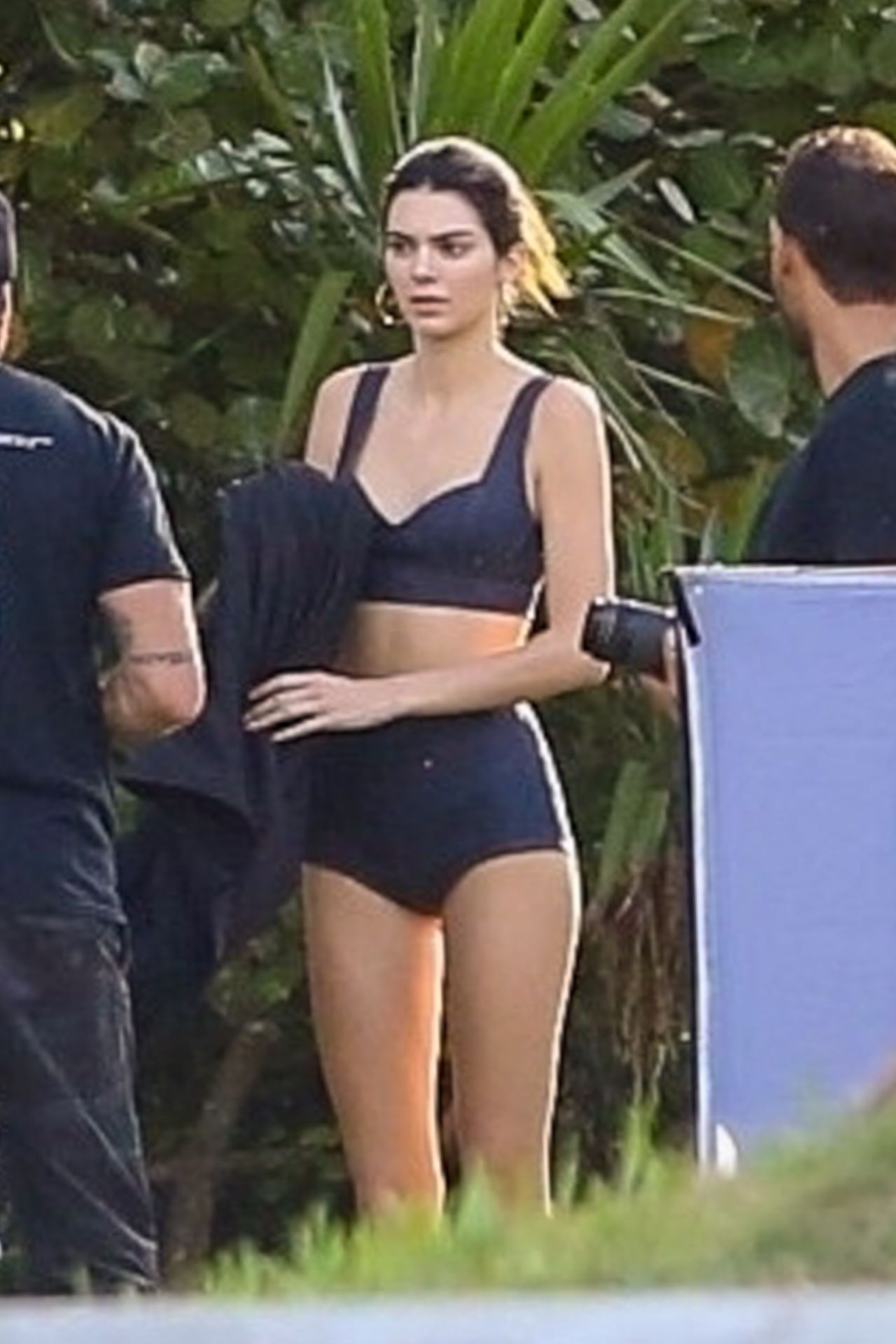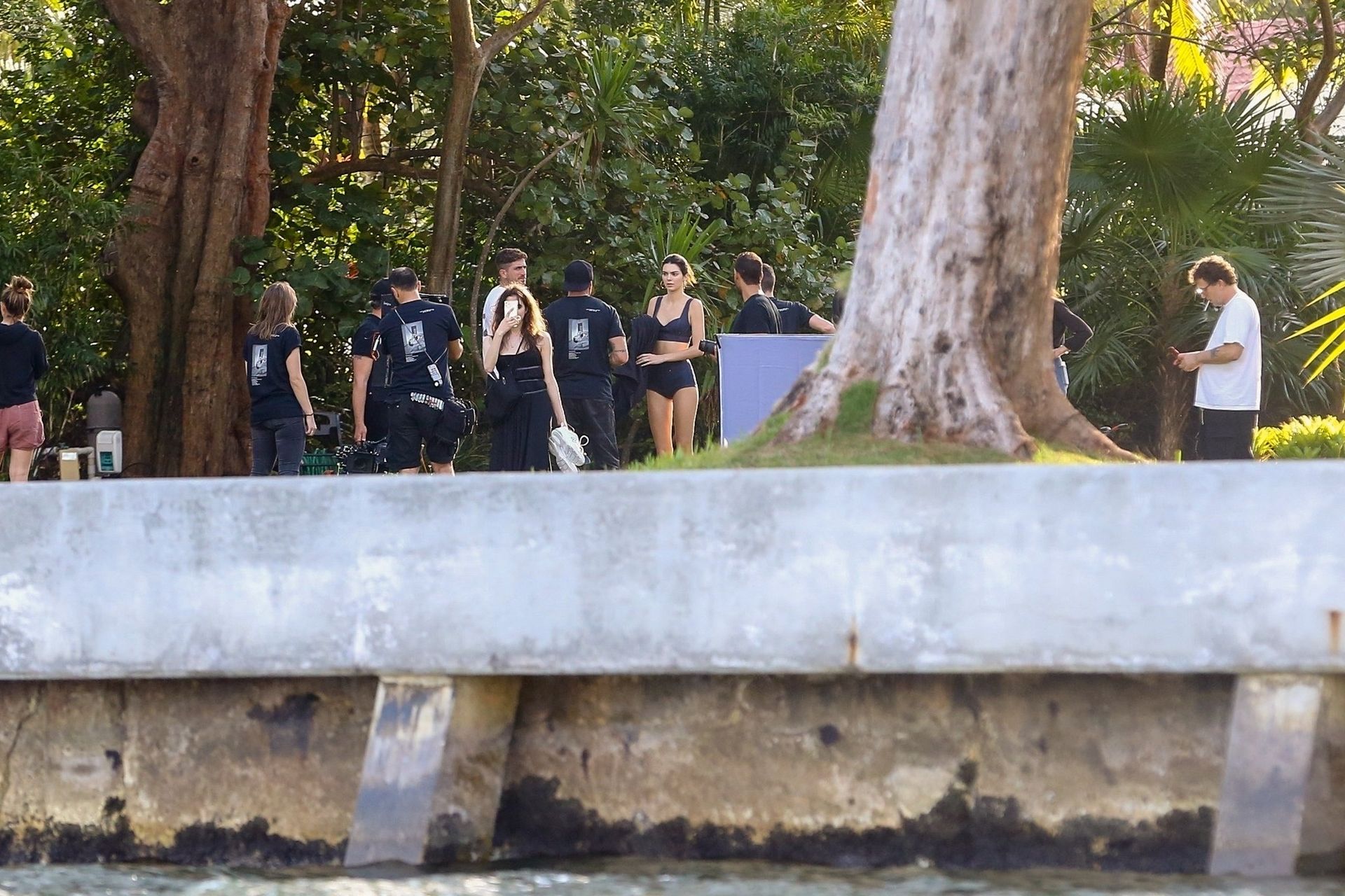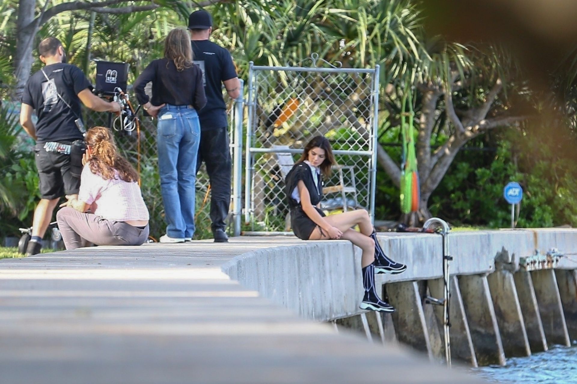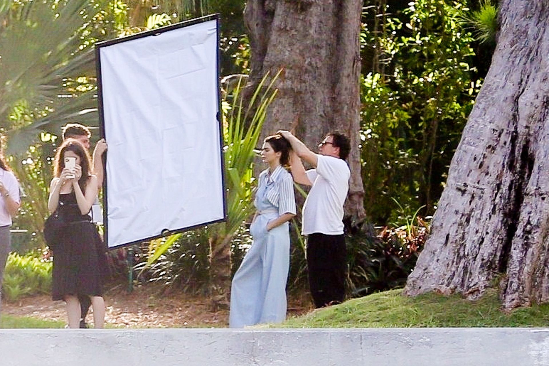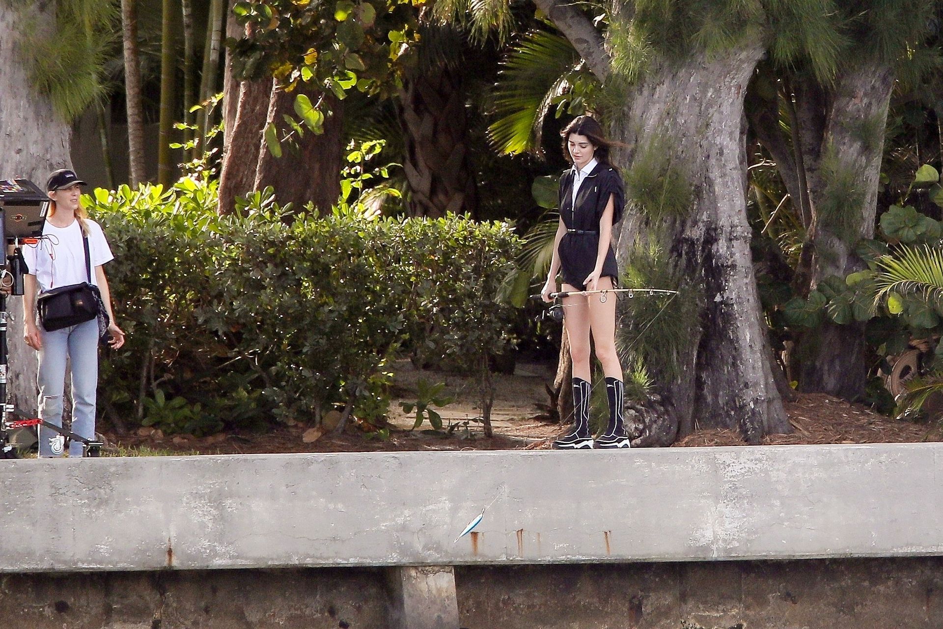 Kendall Jenner slips out of a baby blue outfit and changes into a black ensemble during a photoshoot. Kendall Jenner was wearing a bikini and spraying water out of a hose in Miami, 02/05/2020.