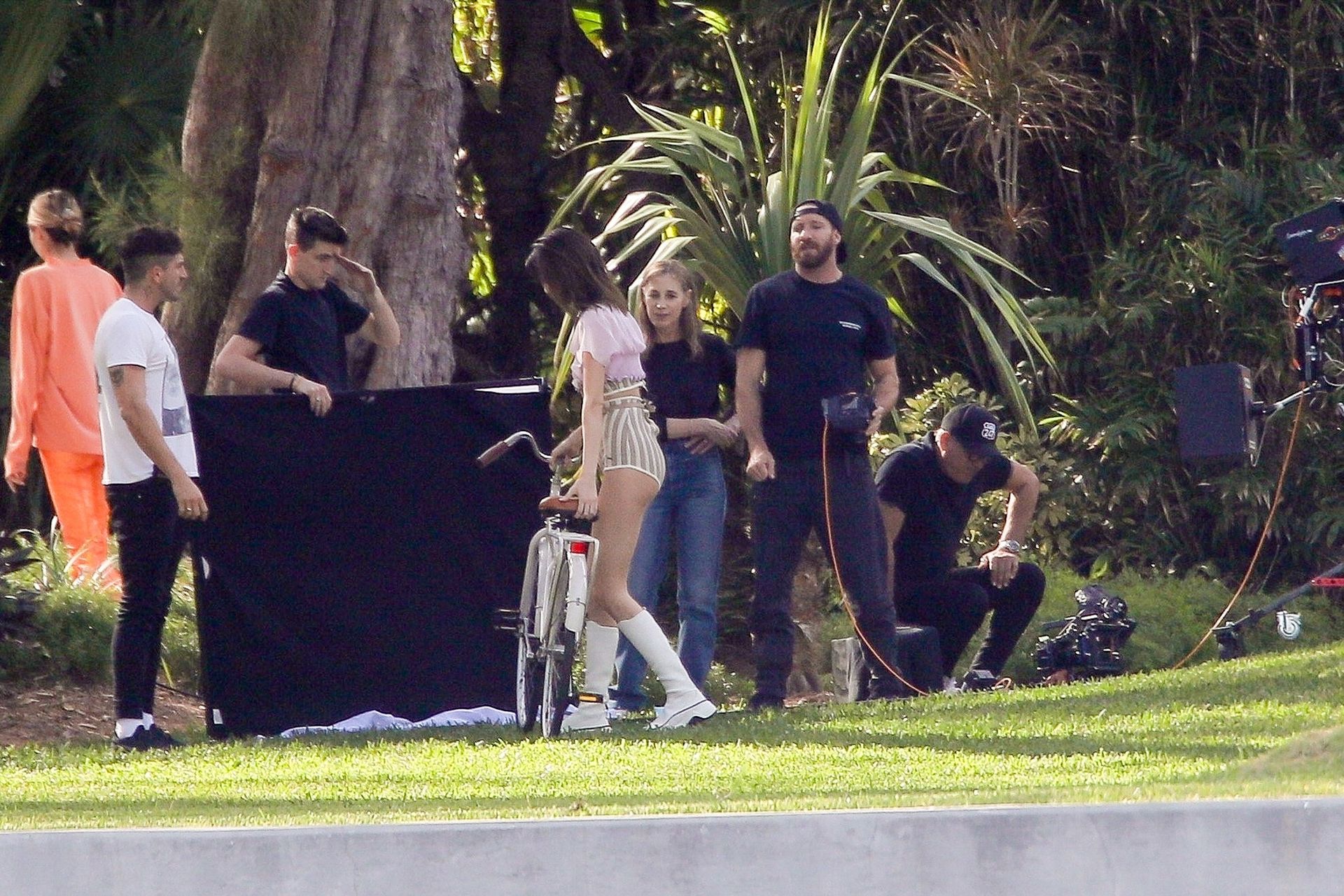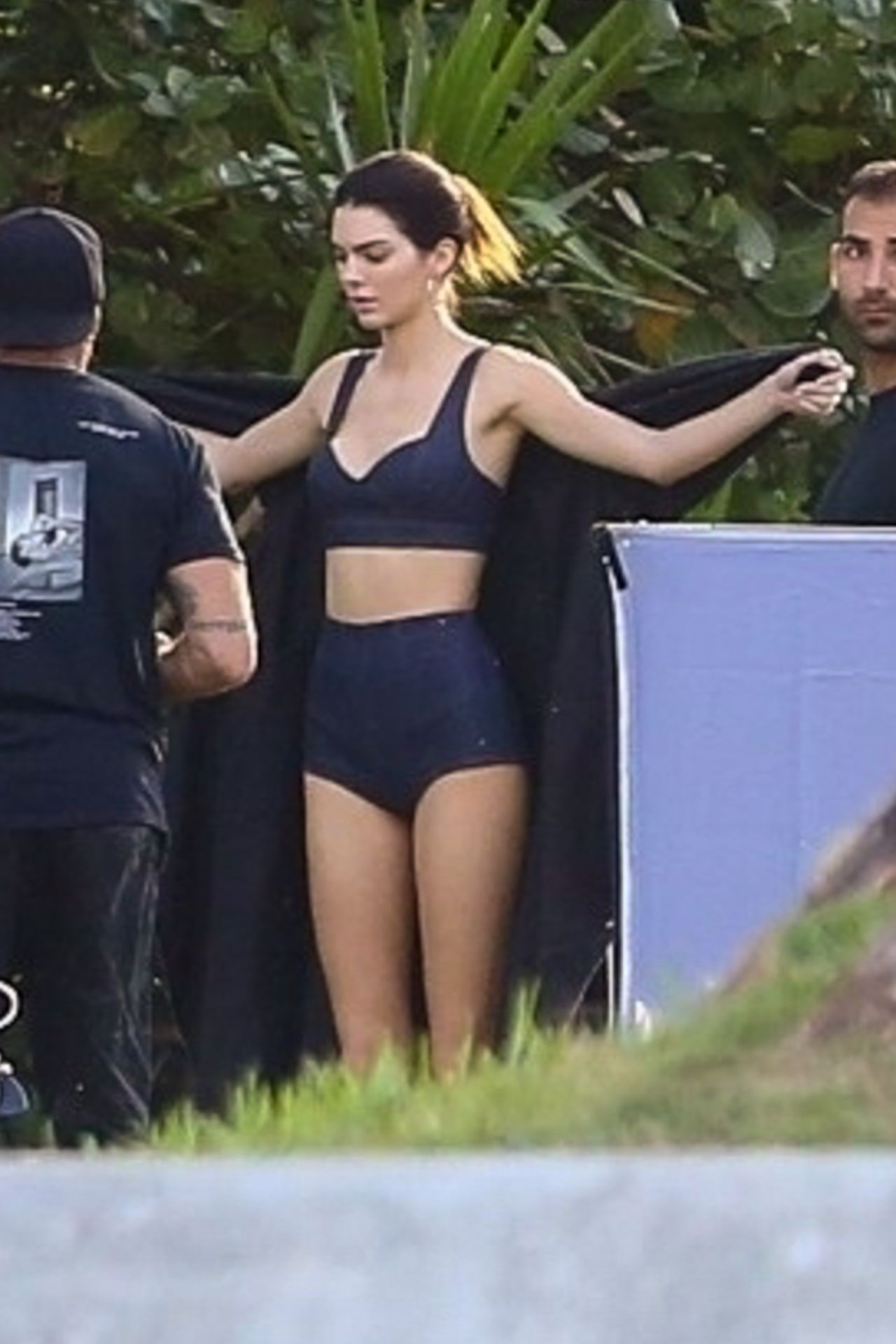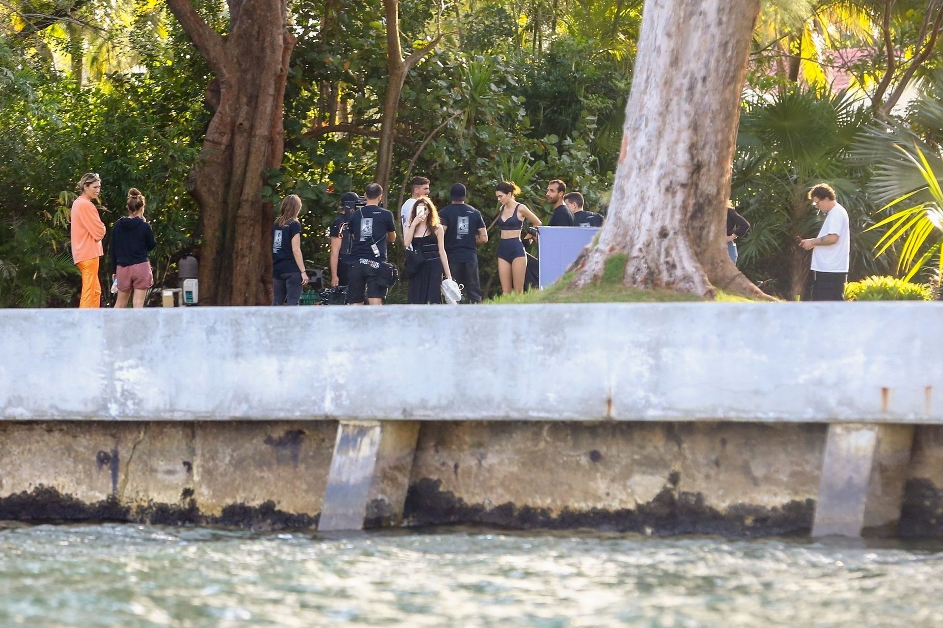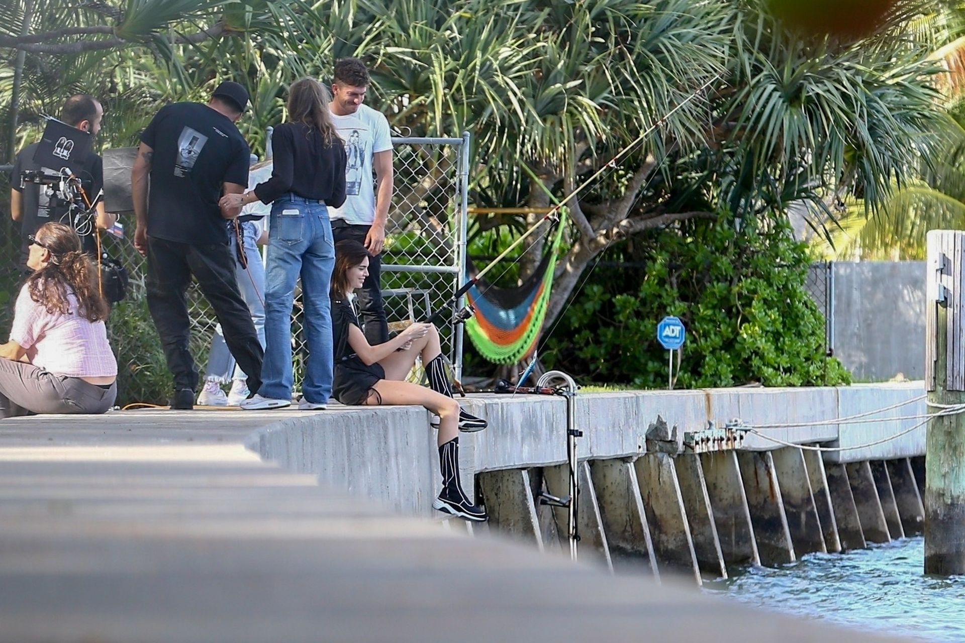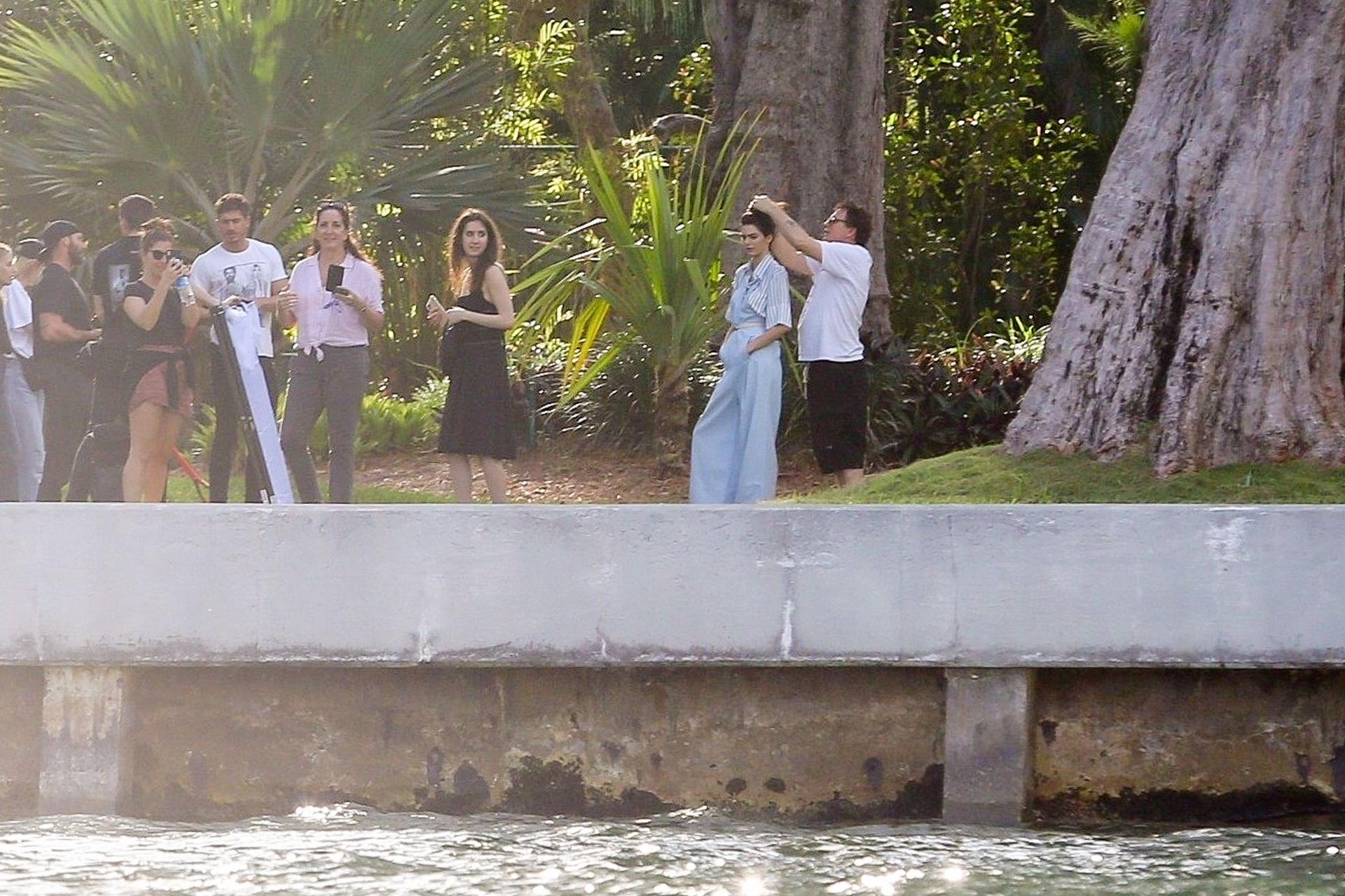 Kendall Jenner slips out of a baby blue outfit and changes into a black ensemble during a photoshoot. Kendall Jenner was wearing a bikini and spraying water out of a hose in Miami, 02/05/2020.