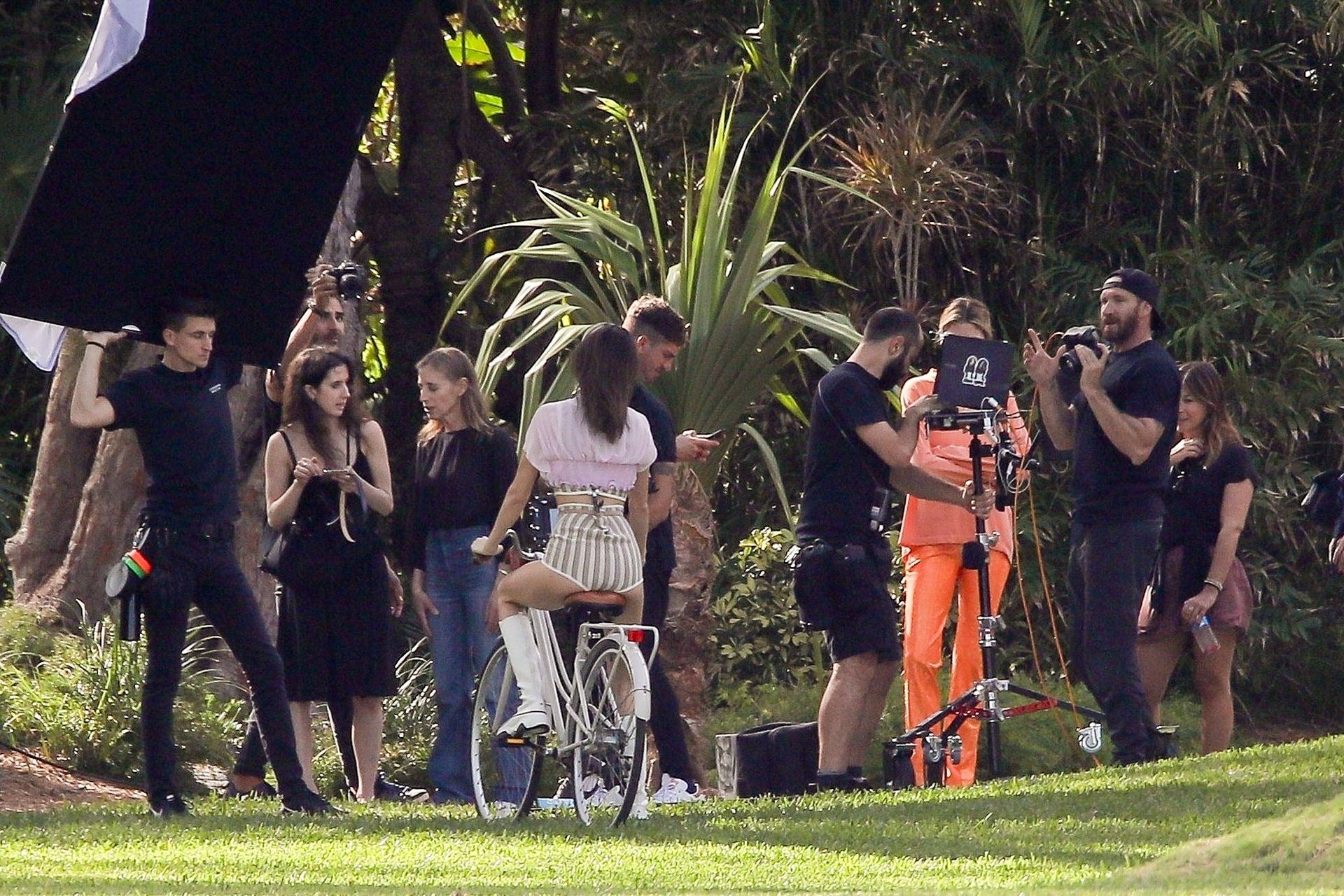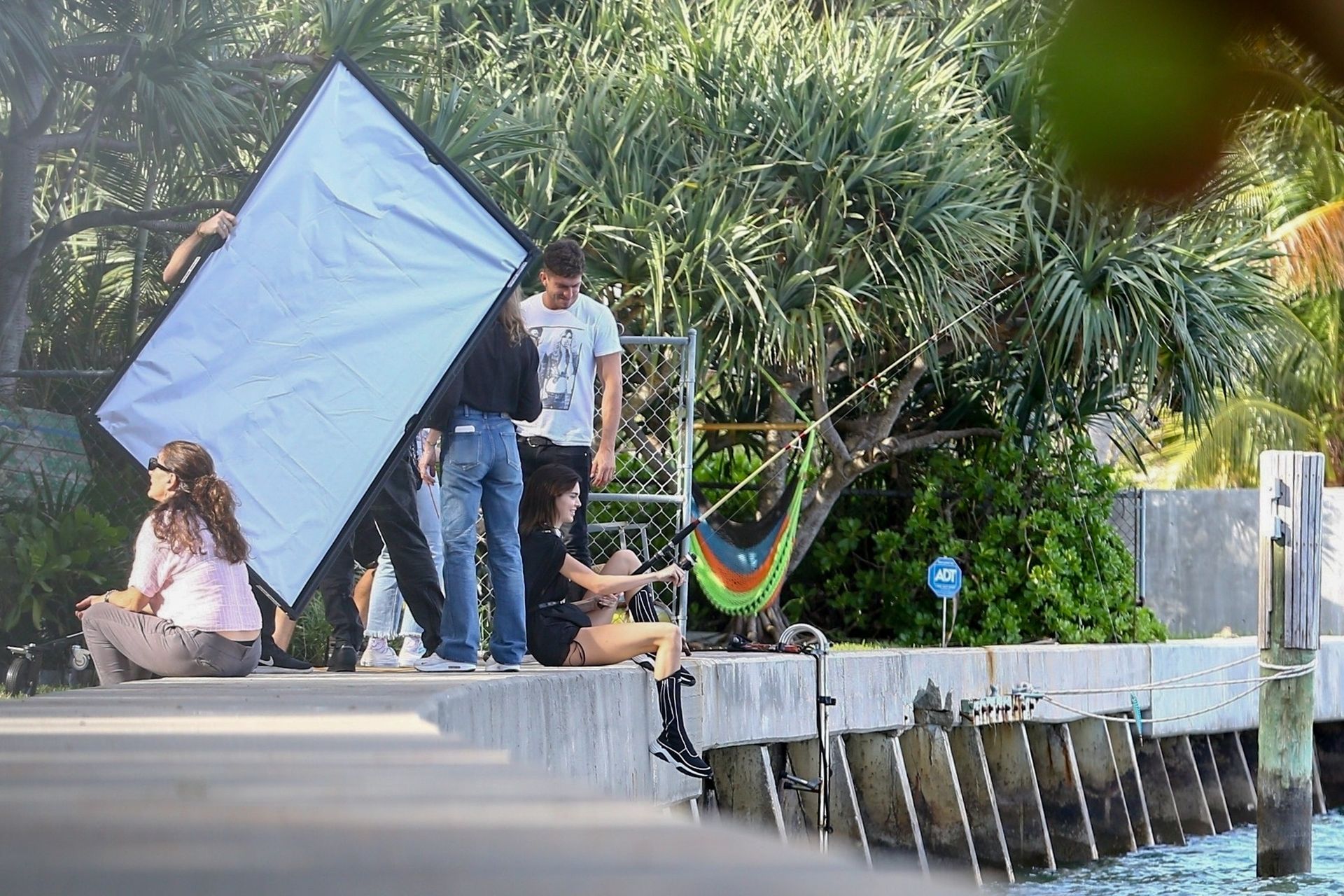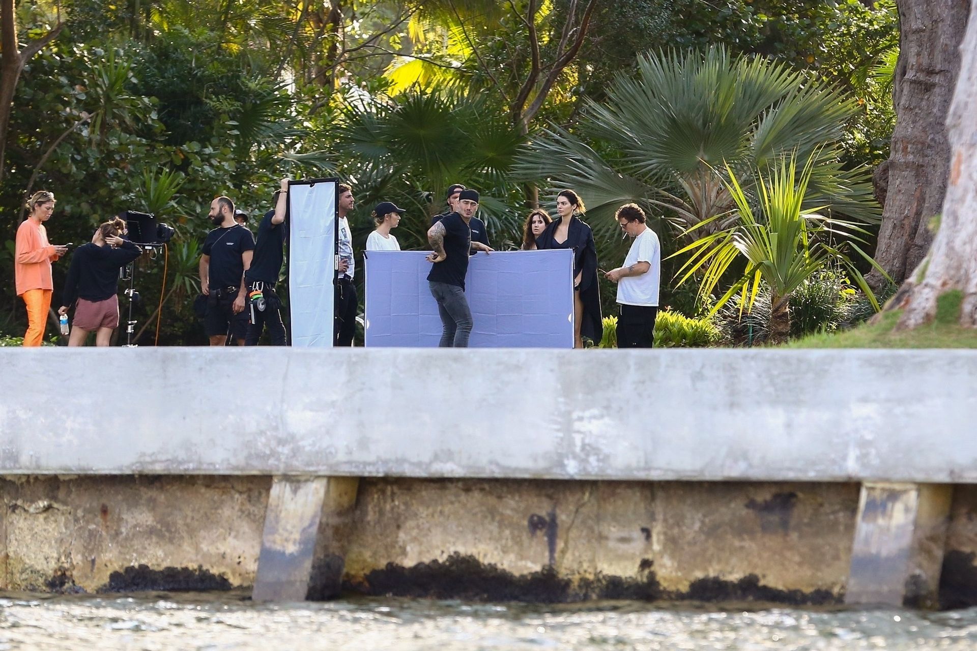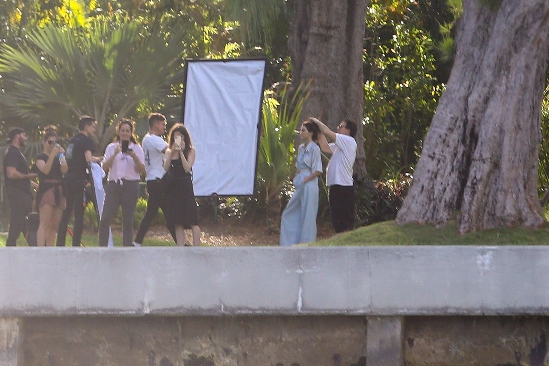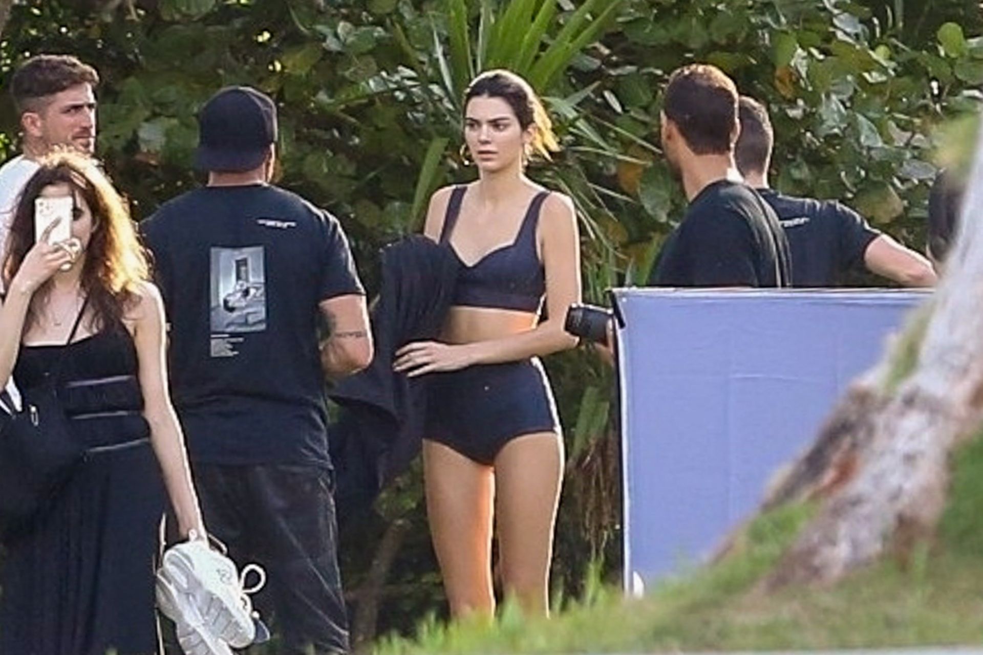 Kendall Jenner slips out of a baby blue outfit and changes into a black ensemble during a photoshoot. Kendall Jenner was wearing a bikini and spraying water out of a hose in Miami, 02/05/2020.
