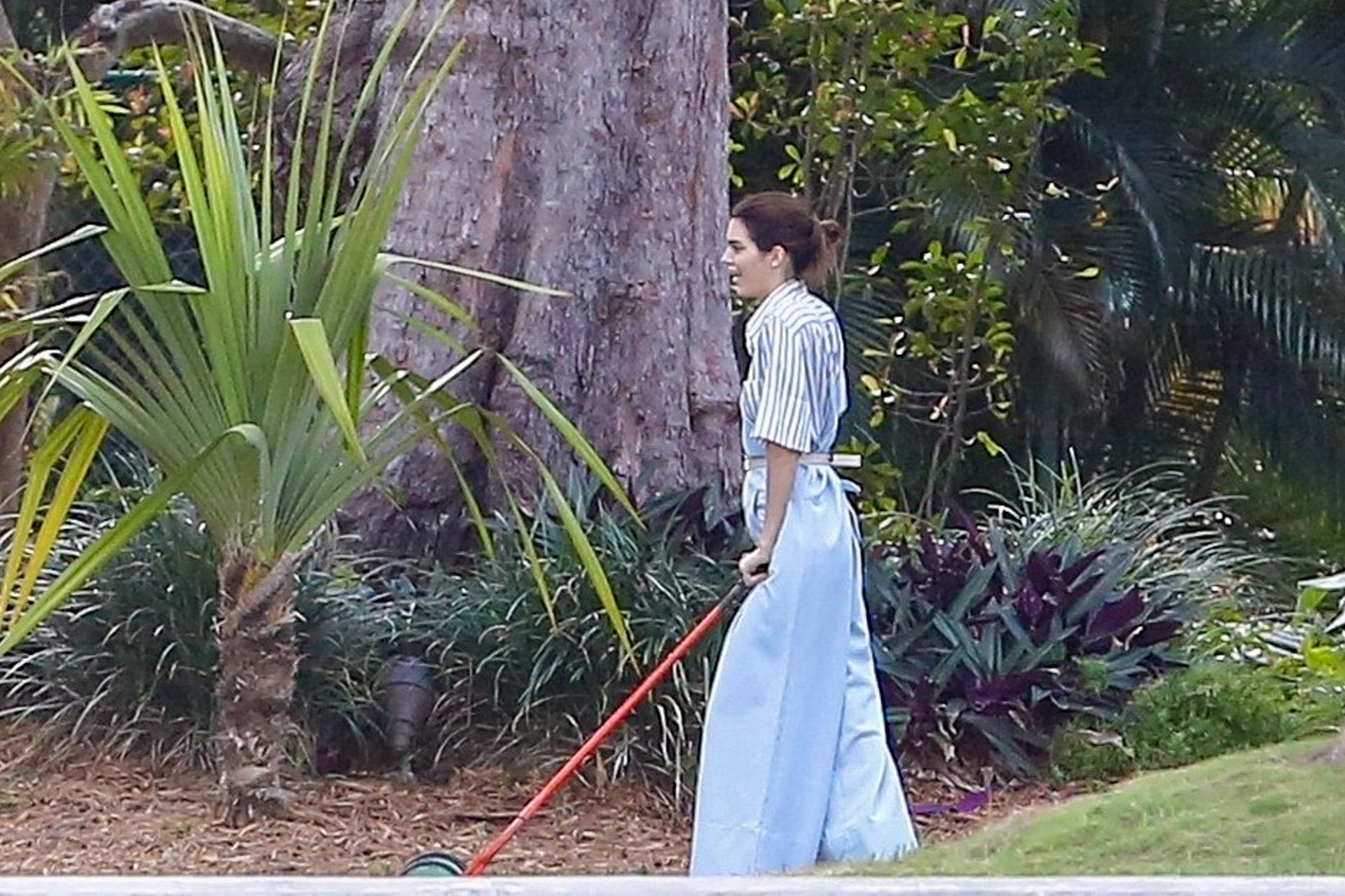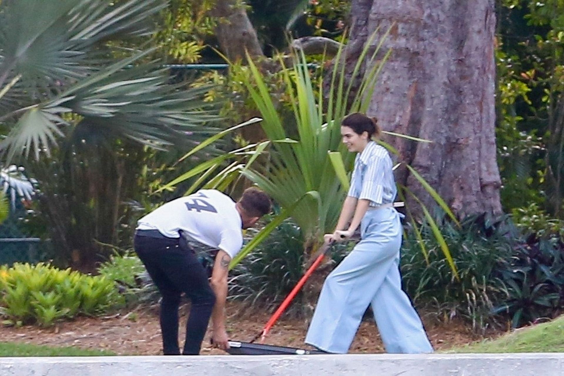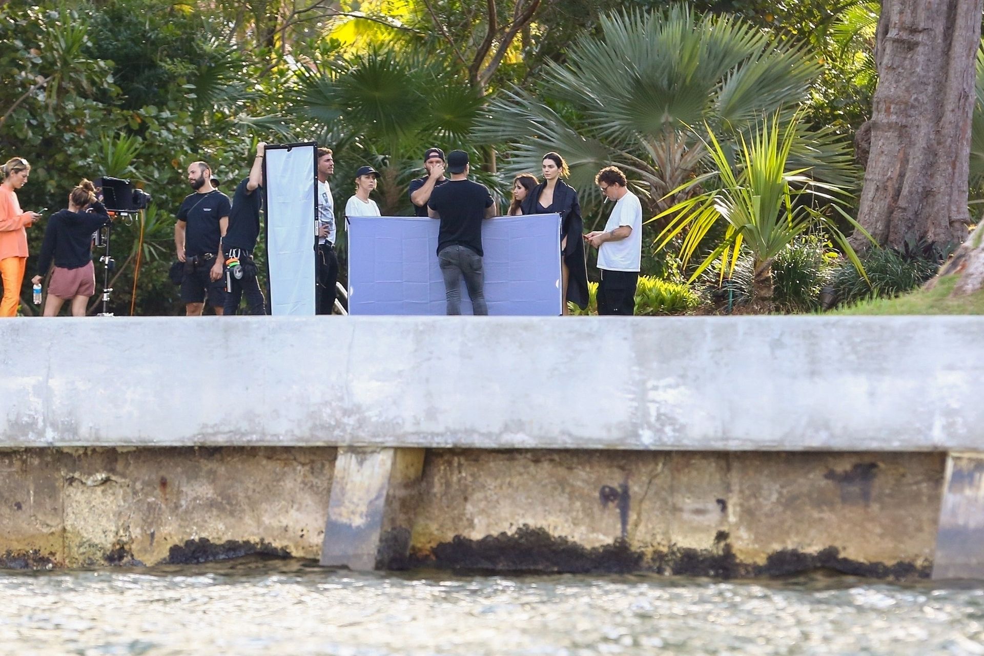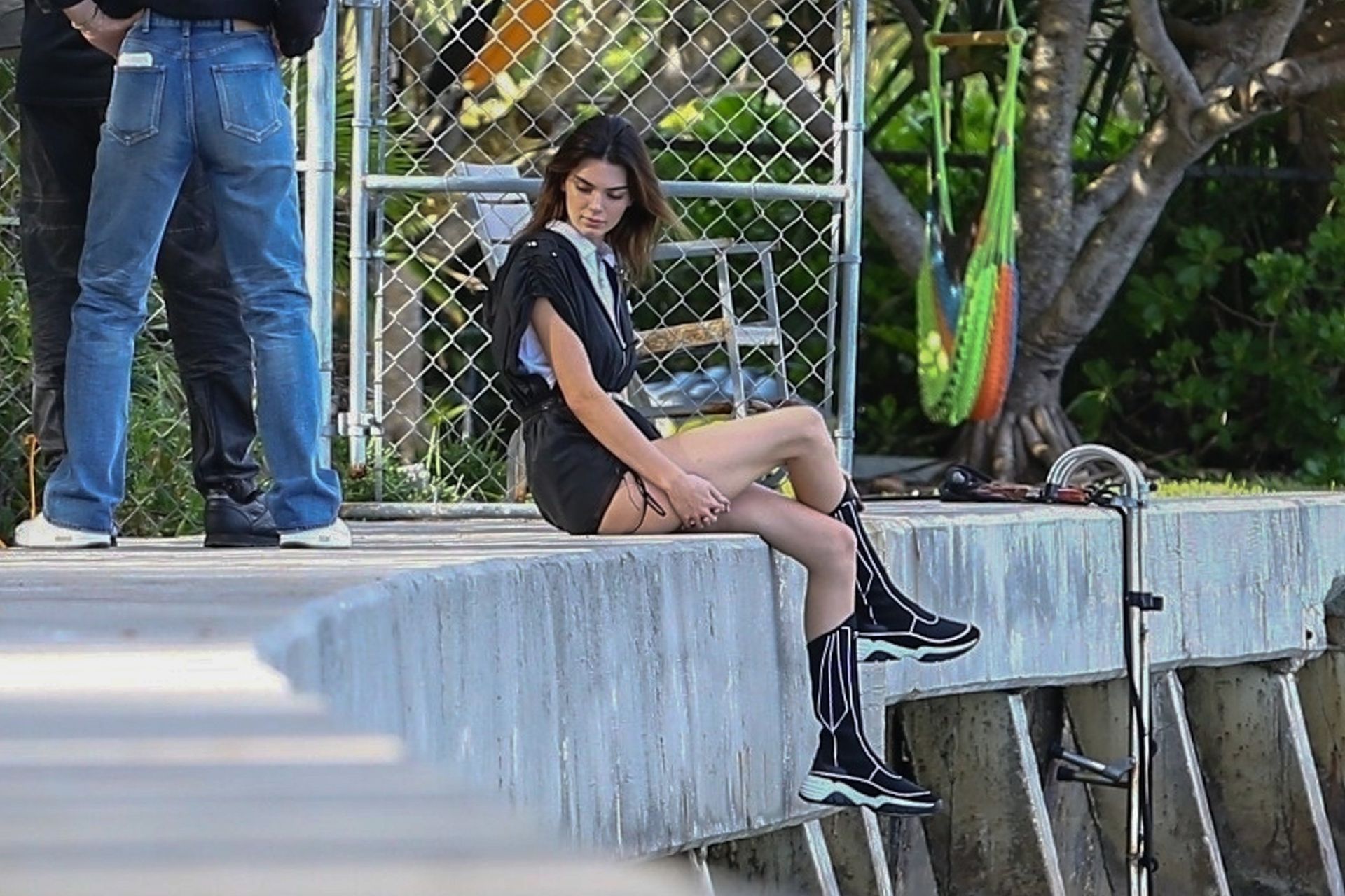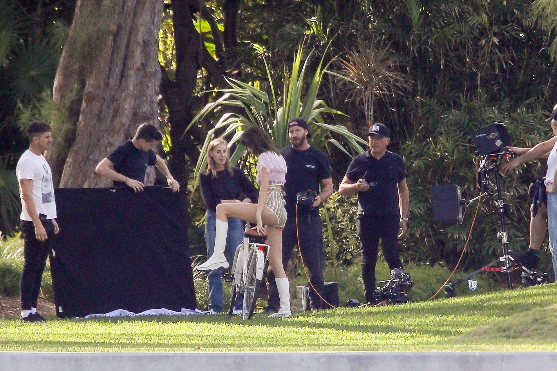 Kendall Jenner slips out of a baby blue outfit and changes into a black ensemble during a photoshoot. Kendall Jenner was wearing a bikini and spraying water out of a hose in Miami, 02/05/2020.