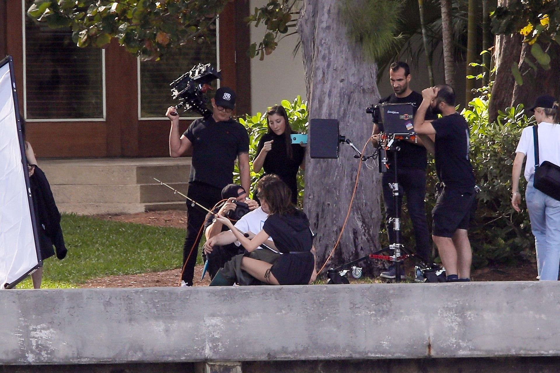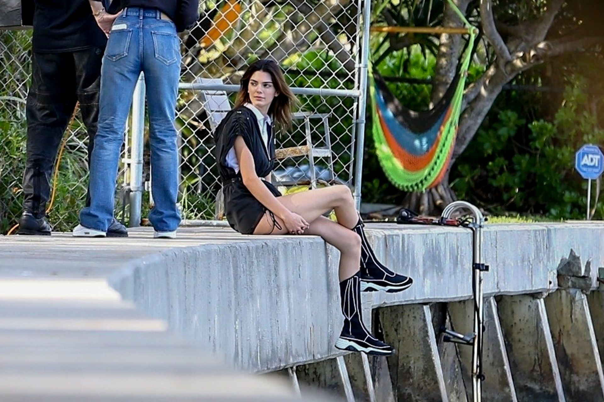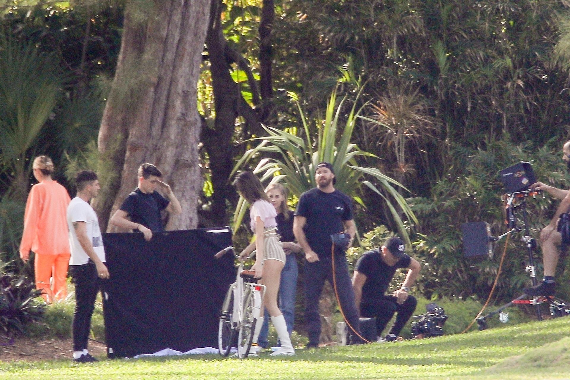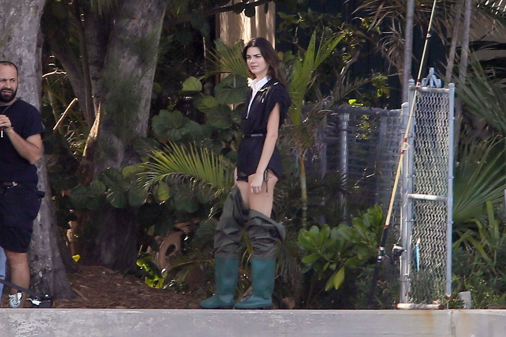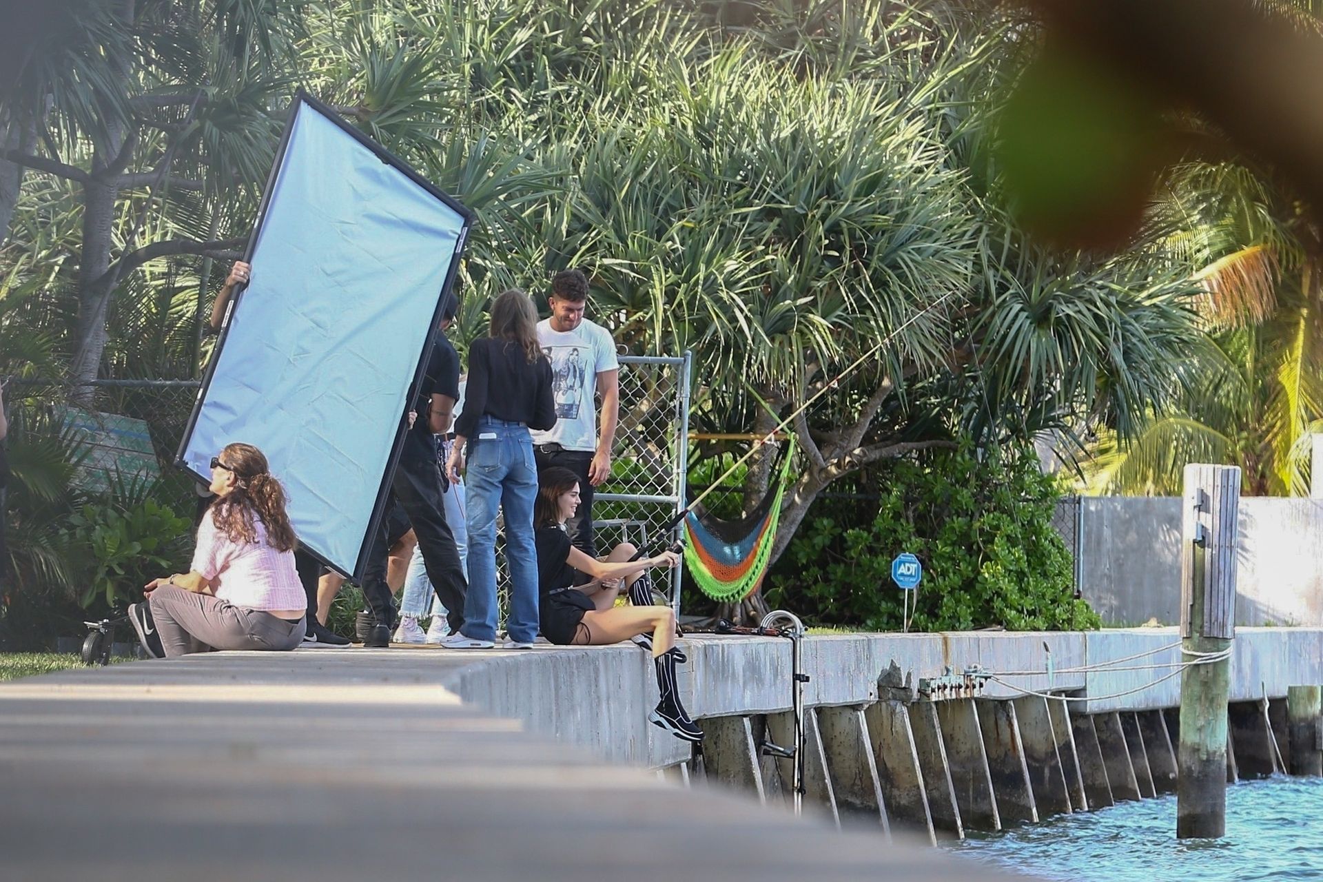 Kendall Jenner slips out of a baby blue outfit and changes into a black ensemble during a photoshoot. Kendall Jenner was wearing a bikini and spraying water out of a hose in Miami, 02/05/2020.