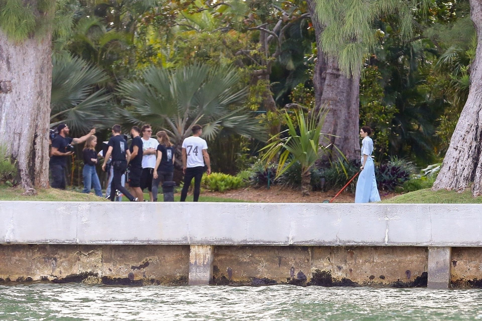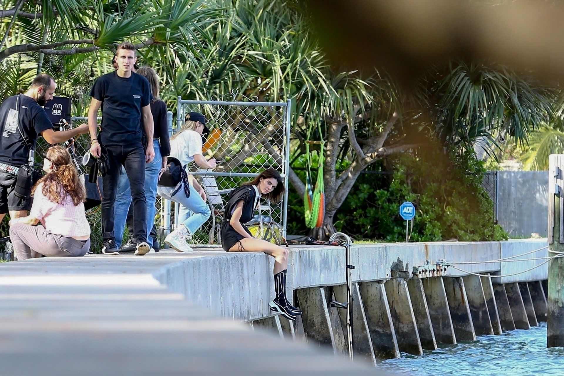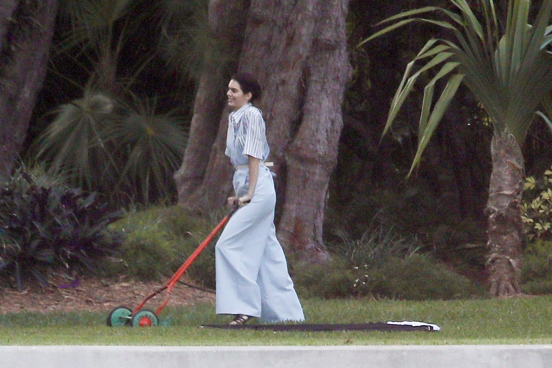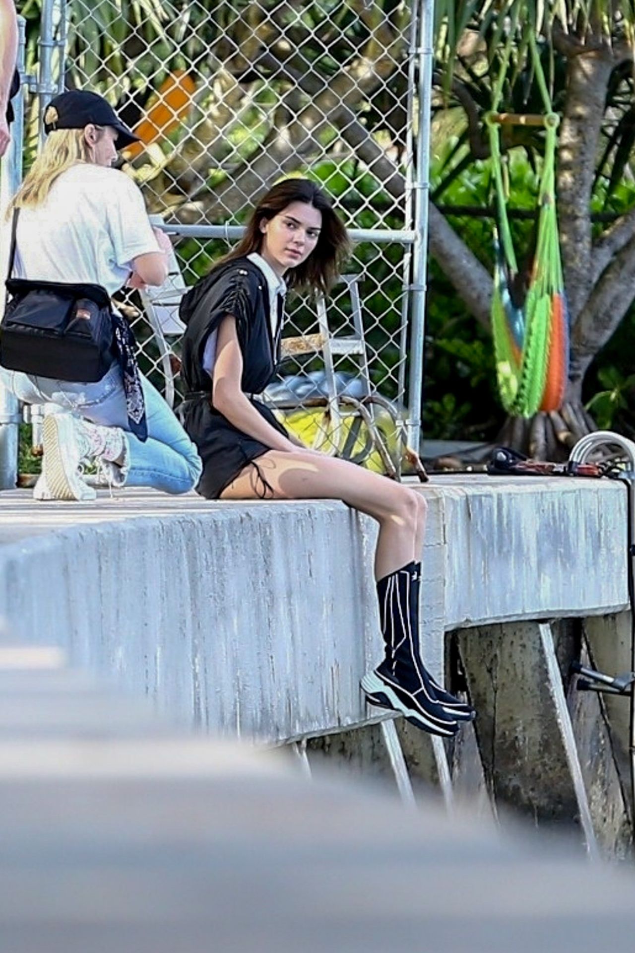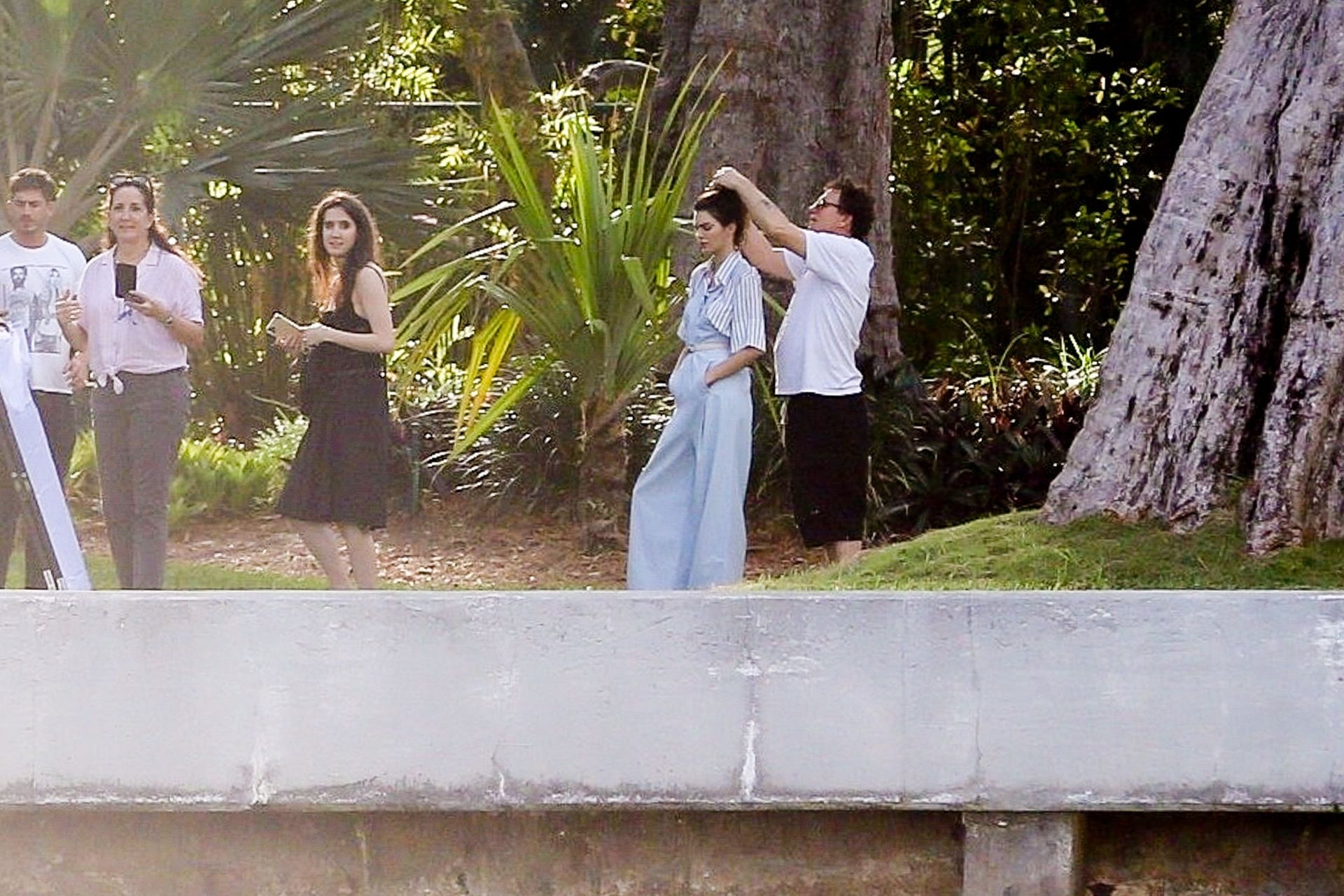 Kendall Jenner slips out of a baby blue outfit and changes into a black ensemble during a photoshoot. Kendall Jenner was wearing a bikini and spraying water out of a hose in Miami, 02/05/2020.