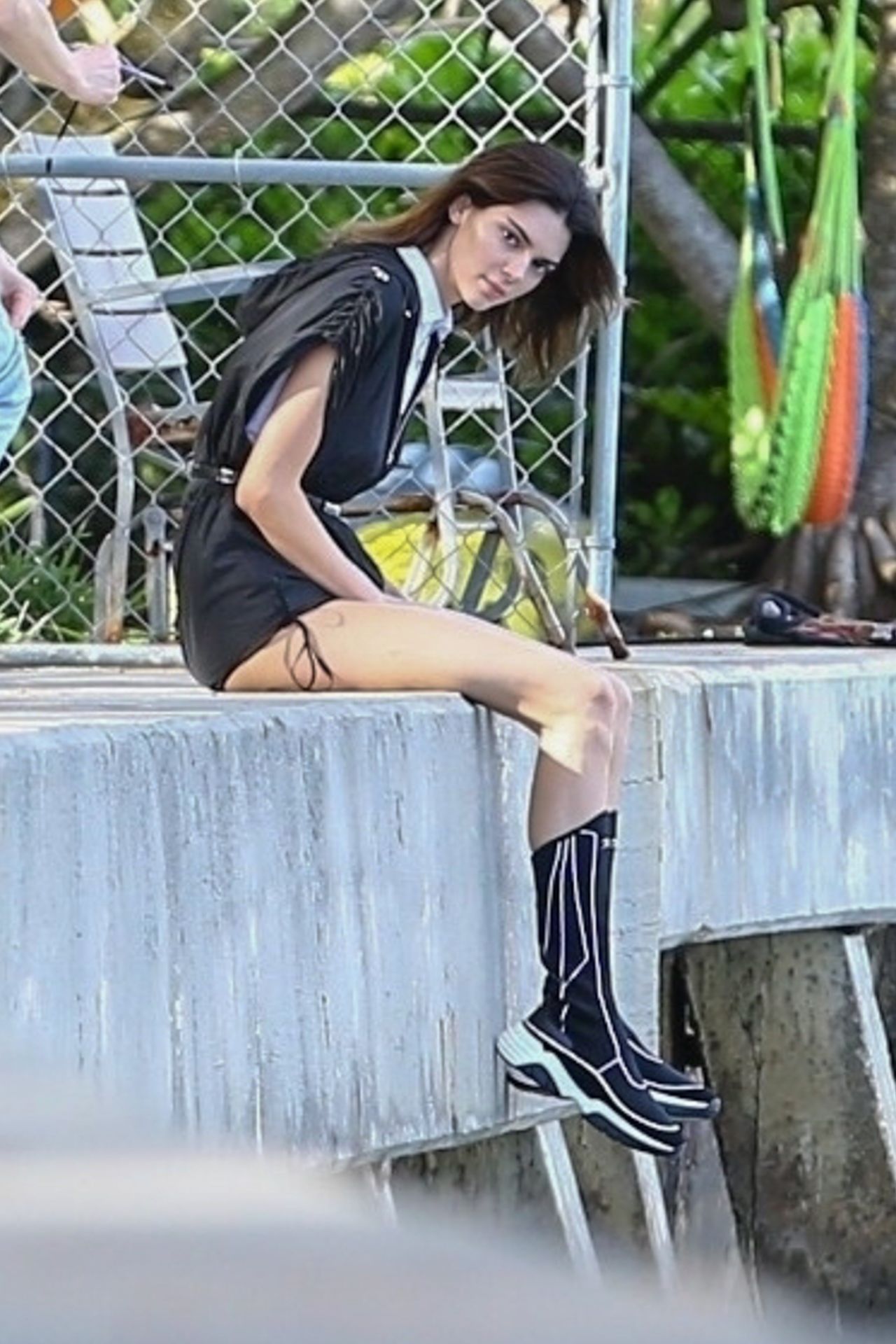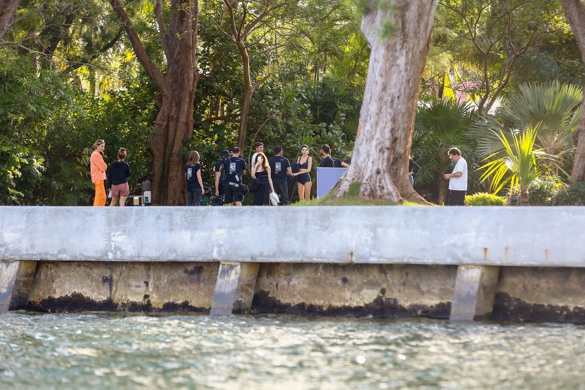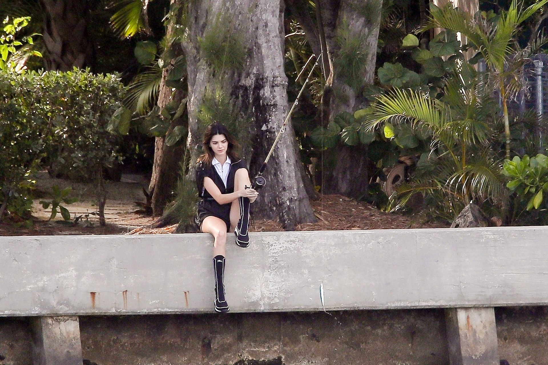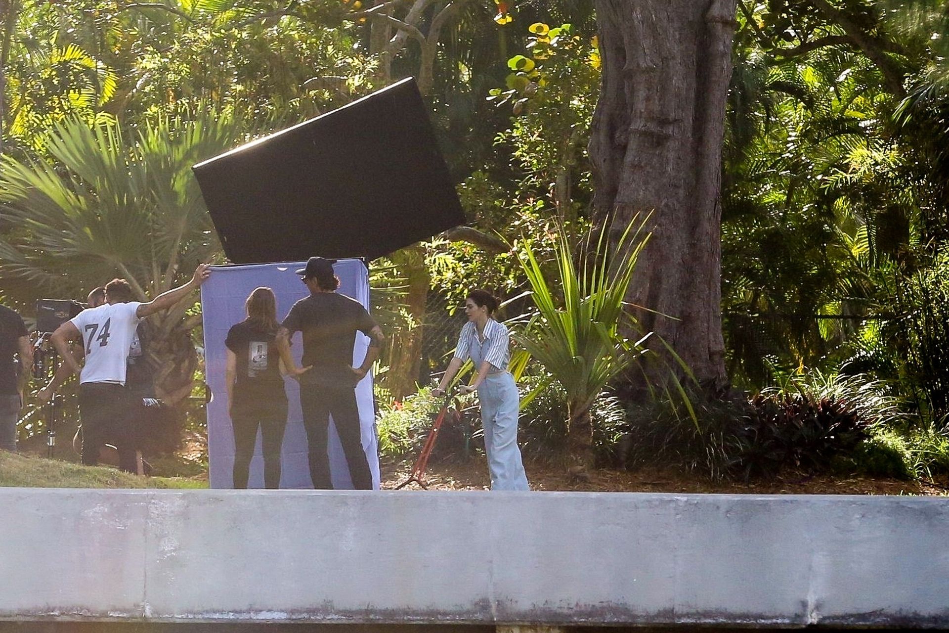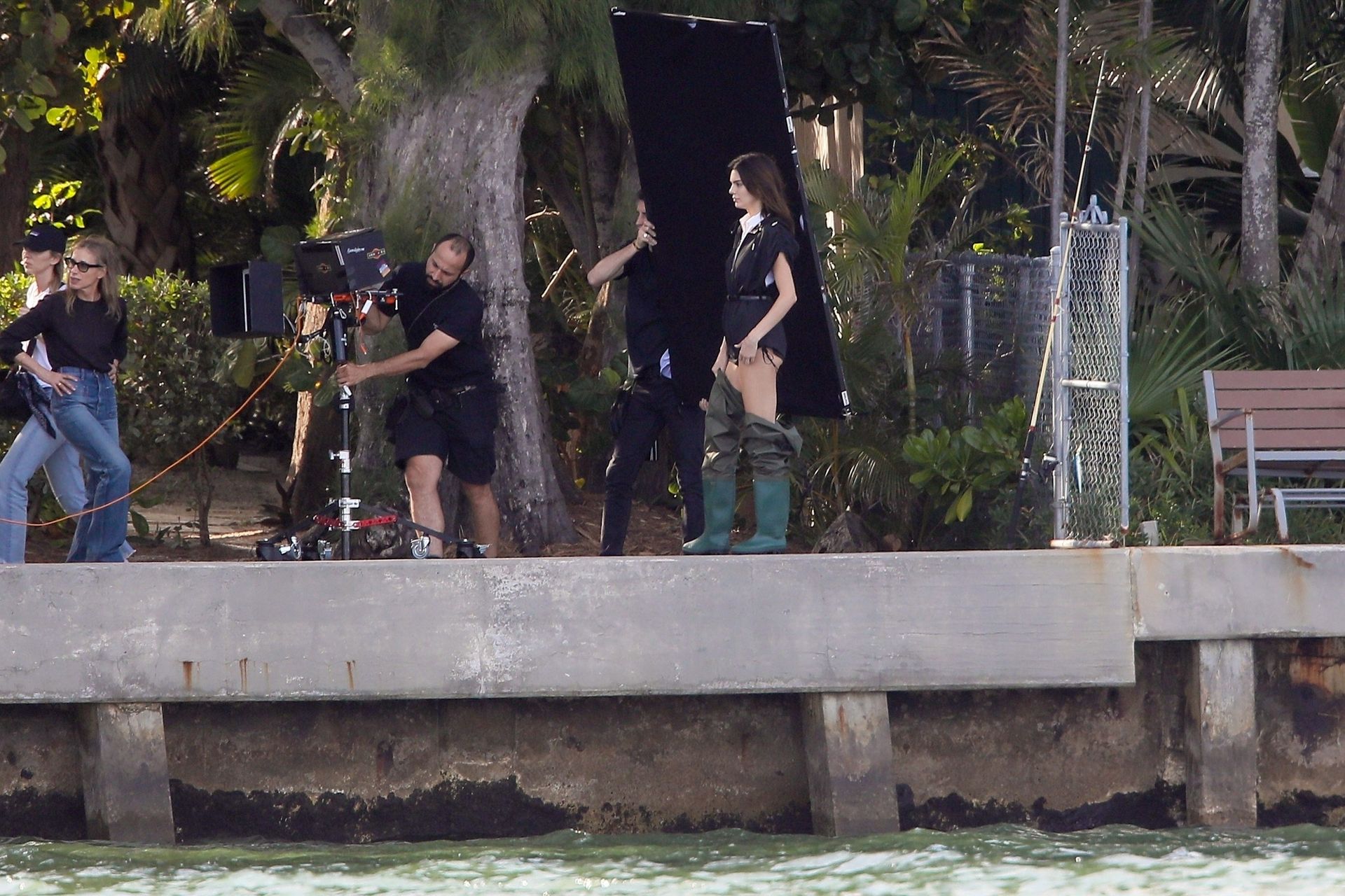 Kendall Jenner slips out of a baby blue outfit and changes into a black ensemble during a photoshoot. Kendall Jenner was wearing a bikini and spraying water out of a hose in Miami, 02/05/2020.