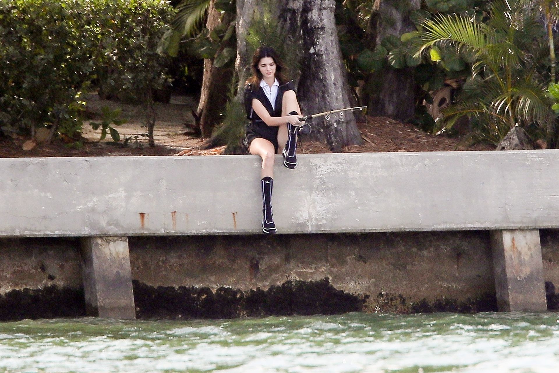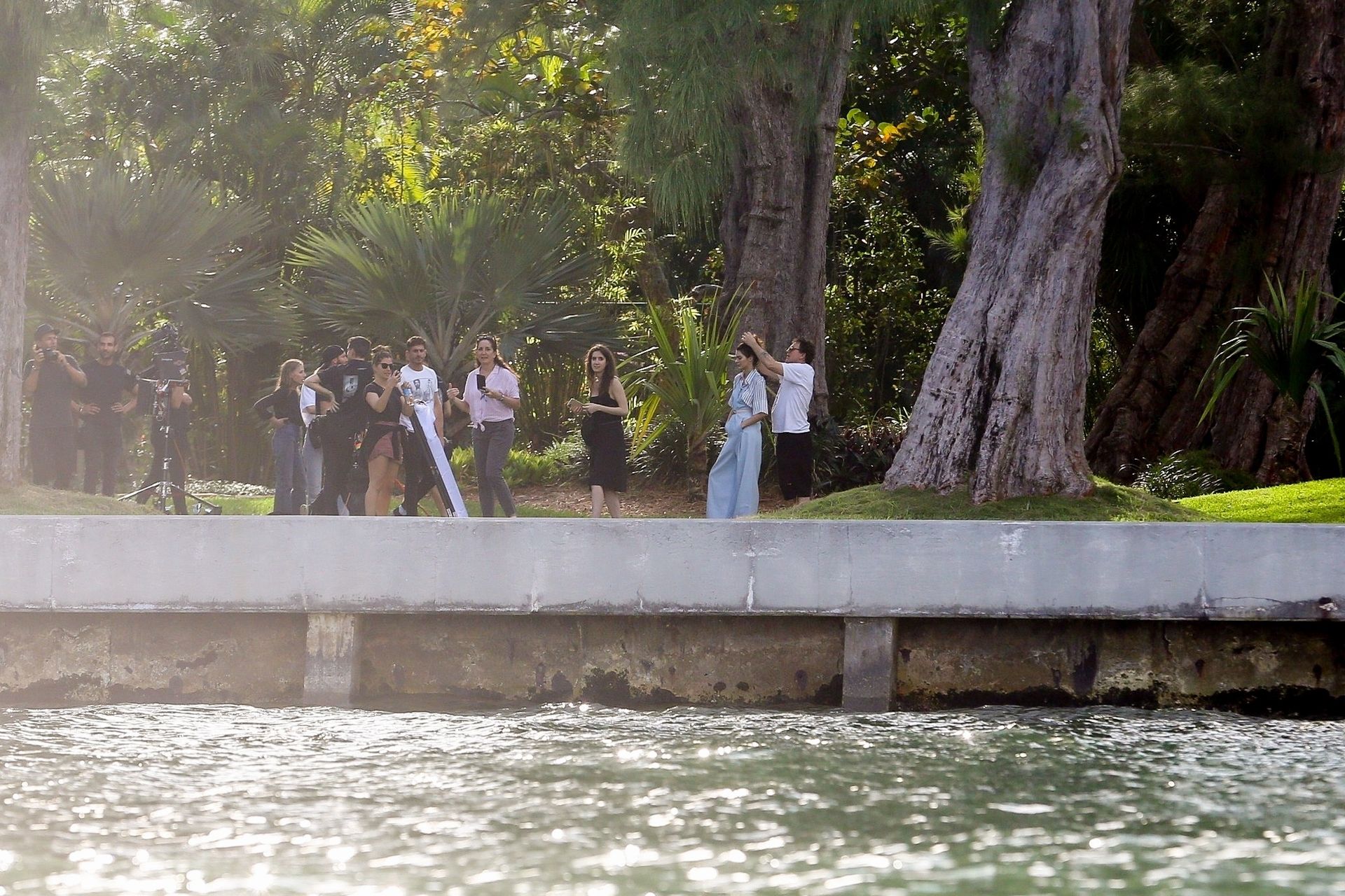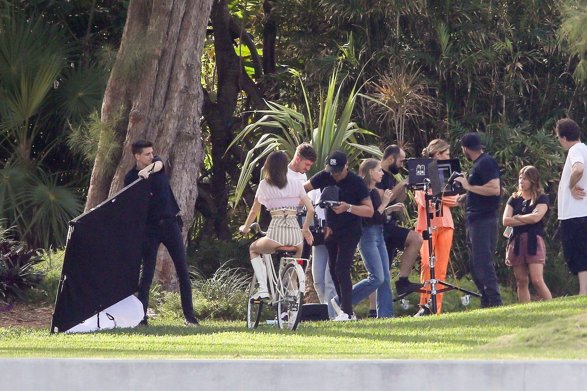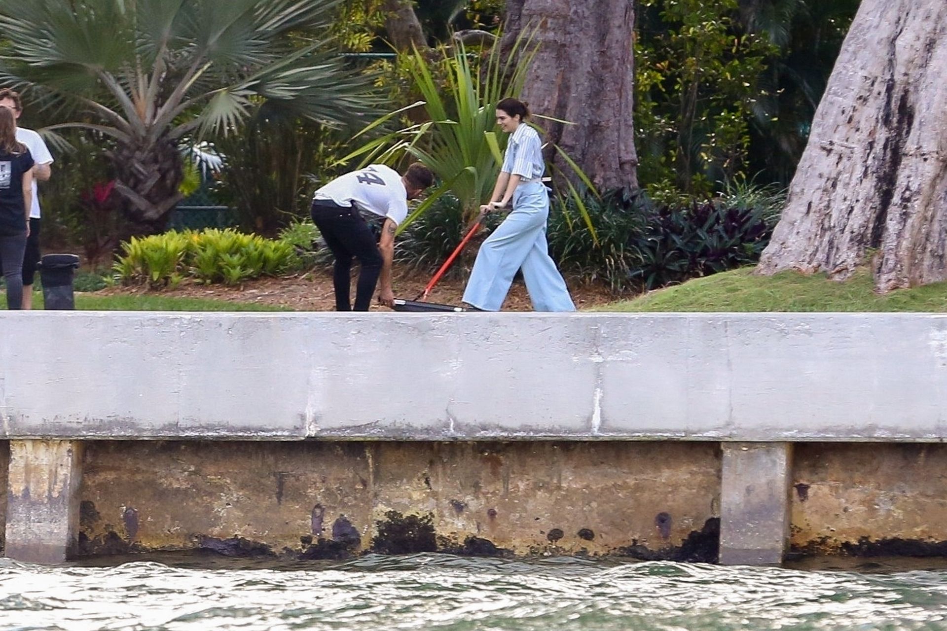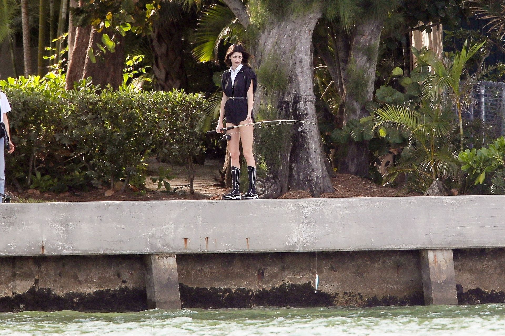 Kendall Jenner slips out of a baby blue outfit and changes into a black ensemble during a photoshoot. Kendall Jenner was wearing a bikini and spraying water out of a hose in Miami, 02/05/2020.