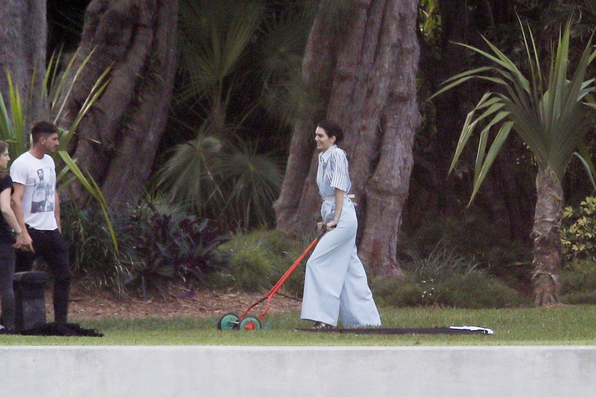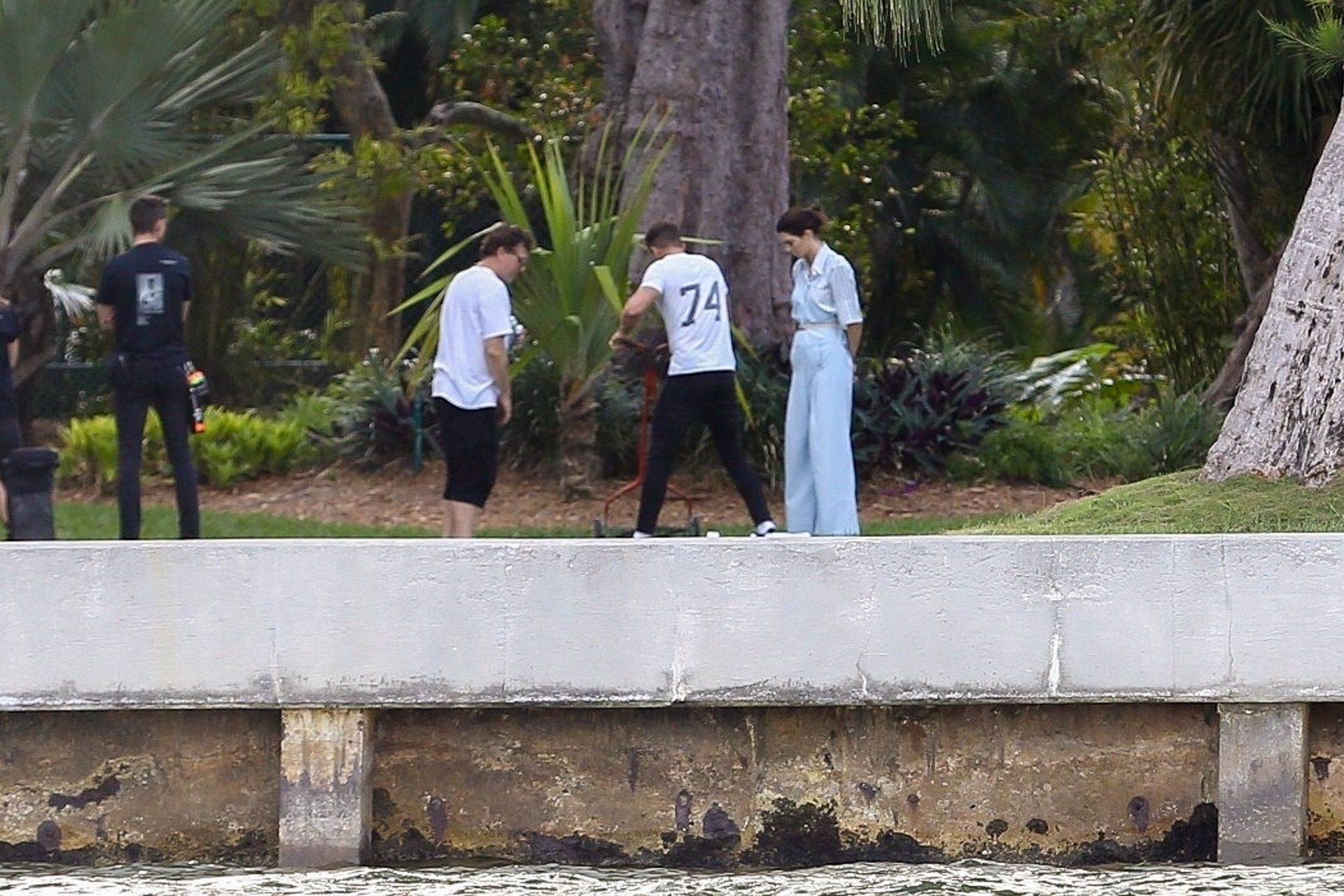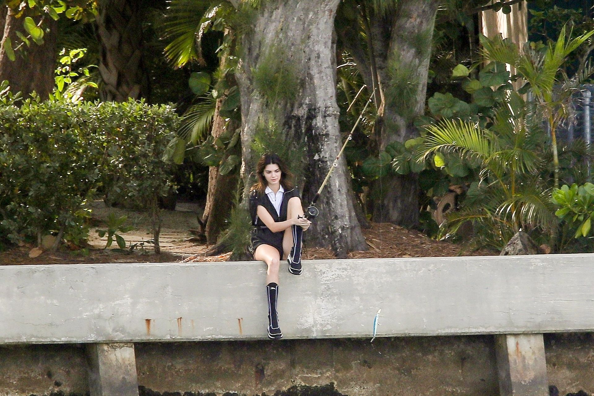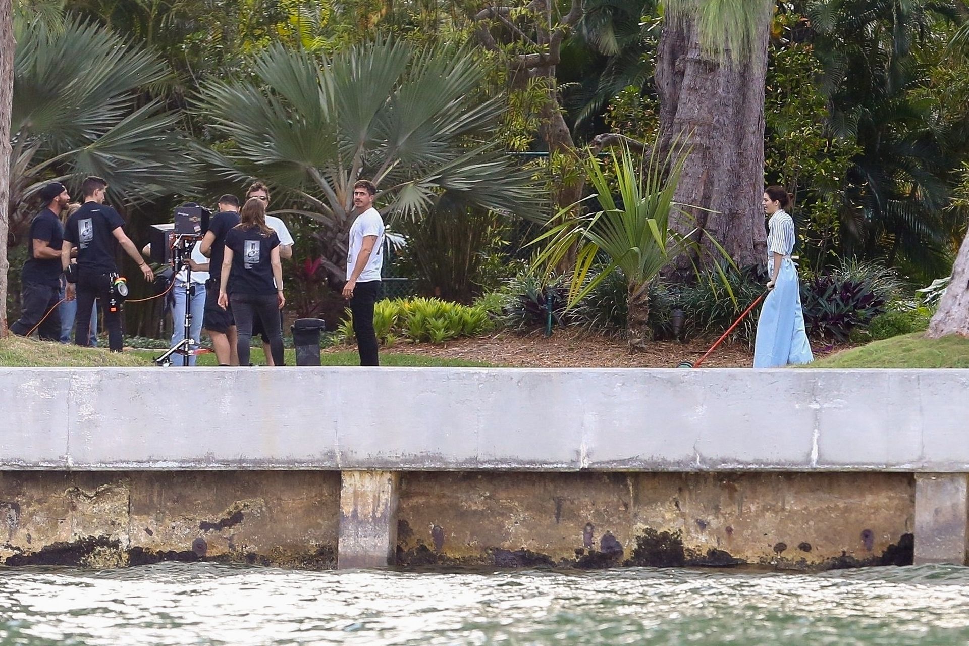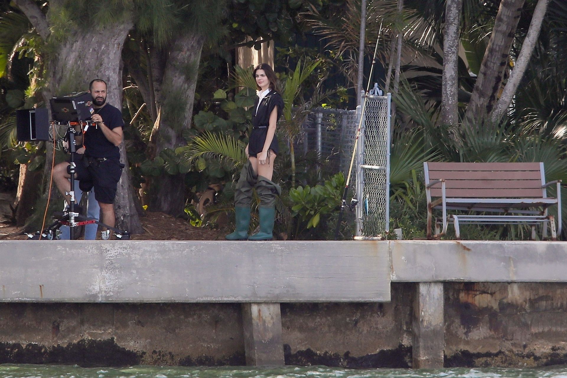 Kendall Jenner slips out of a baby blue outfit and changes into a black ensemble during a photoshoot. Kendall Jenner was wearing a bikini and spraying water out of a hose in Miami, 02/05/2020.