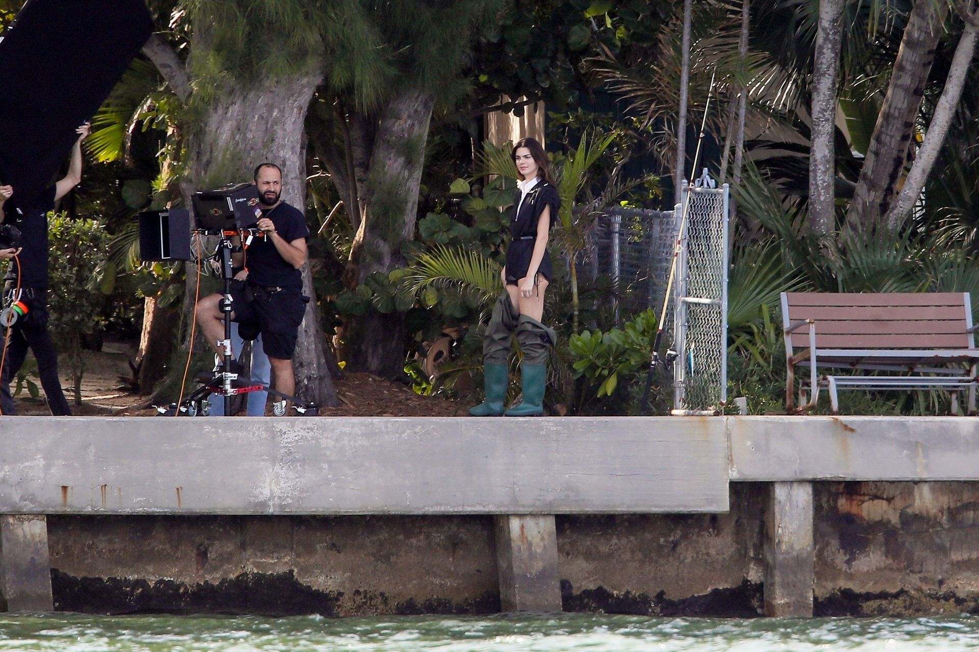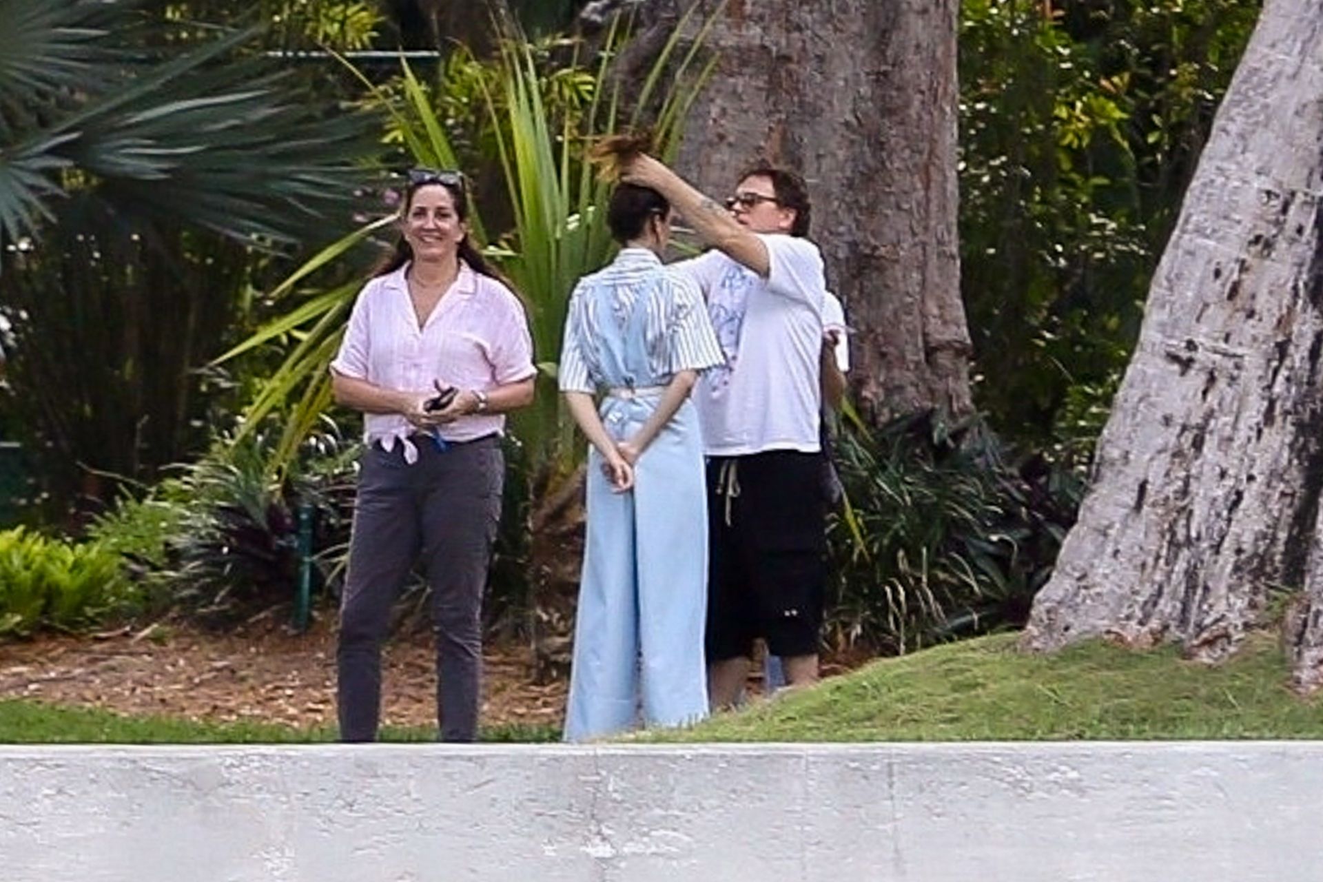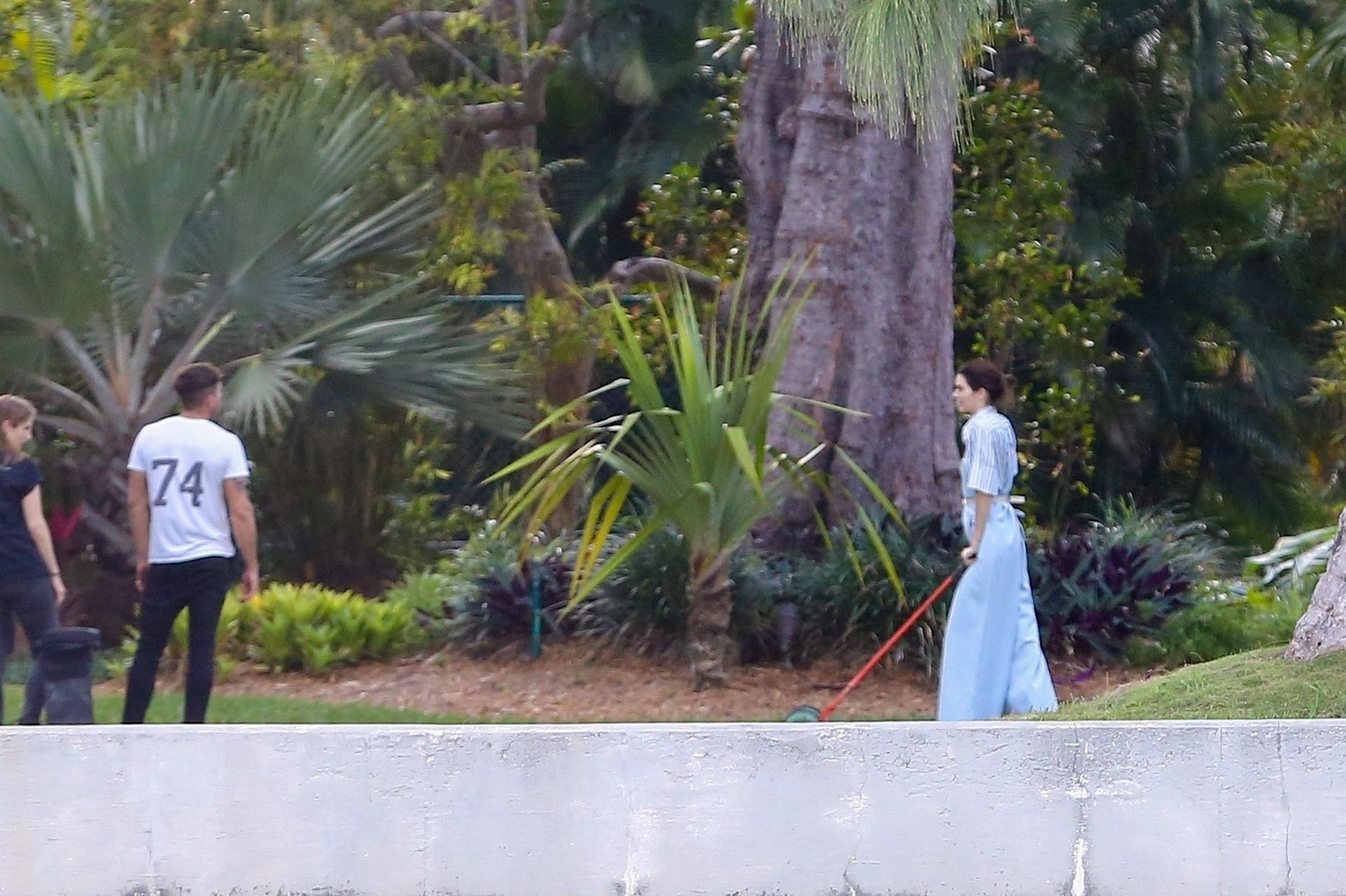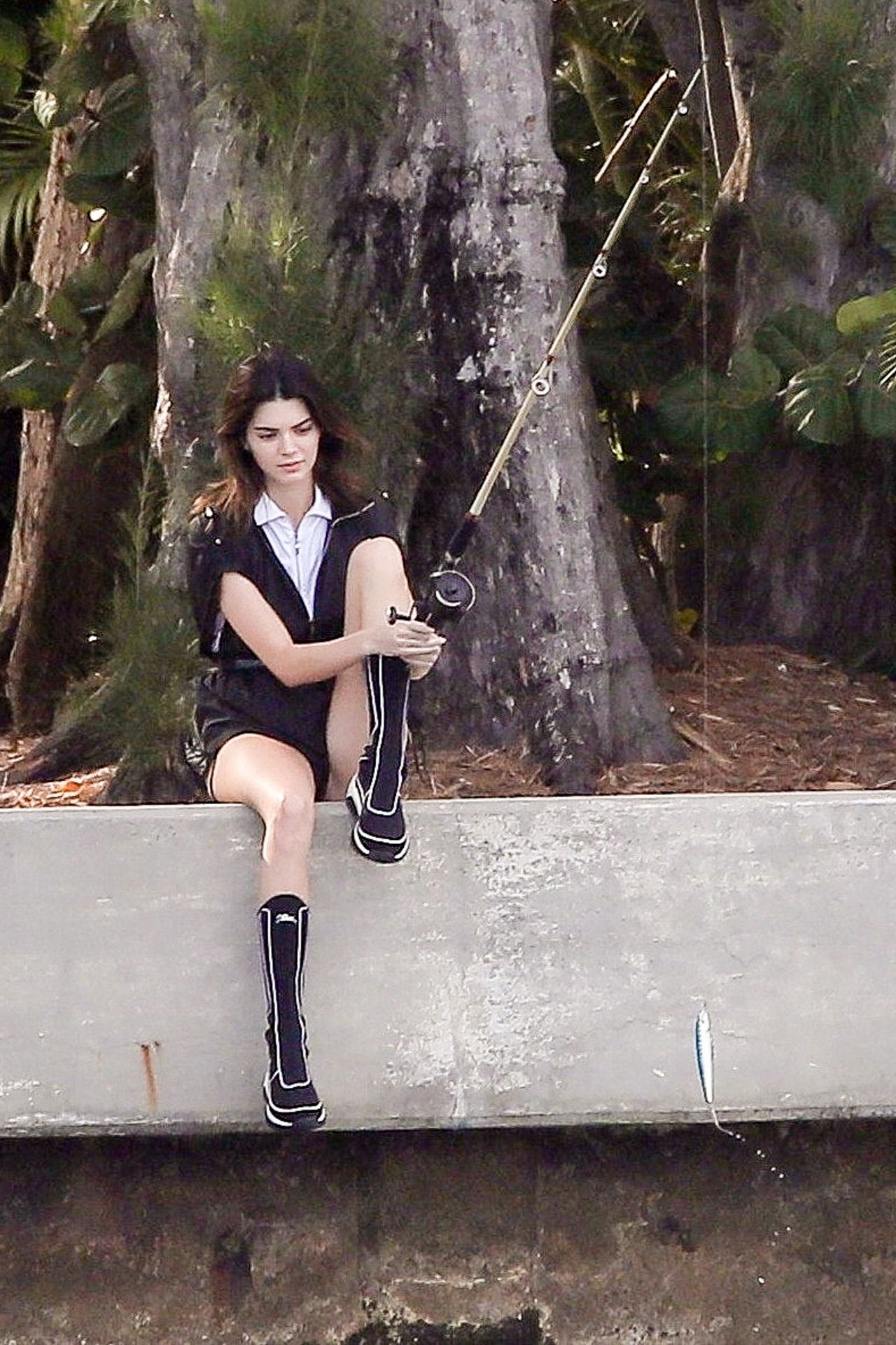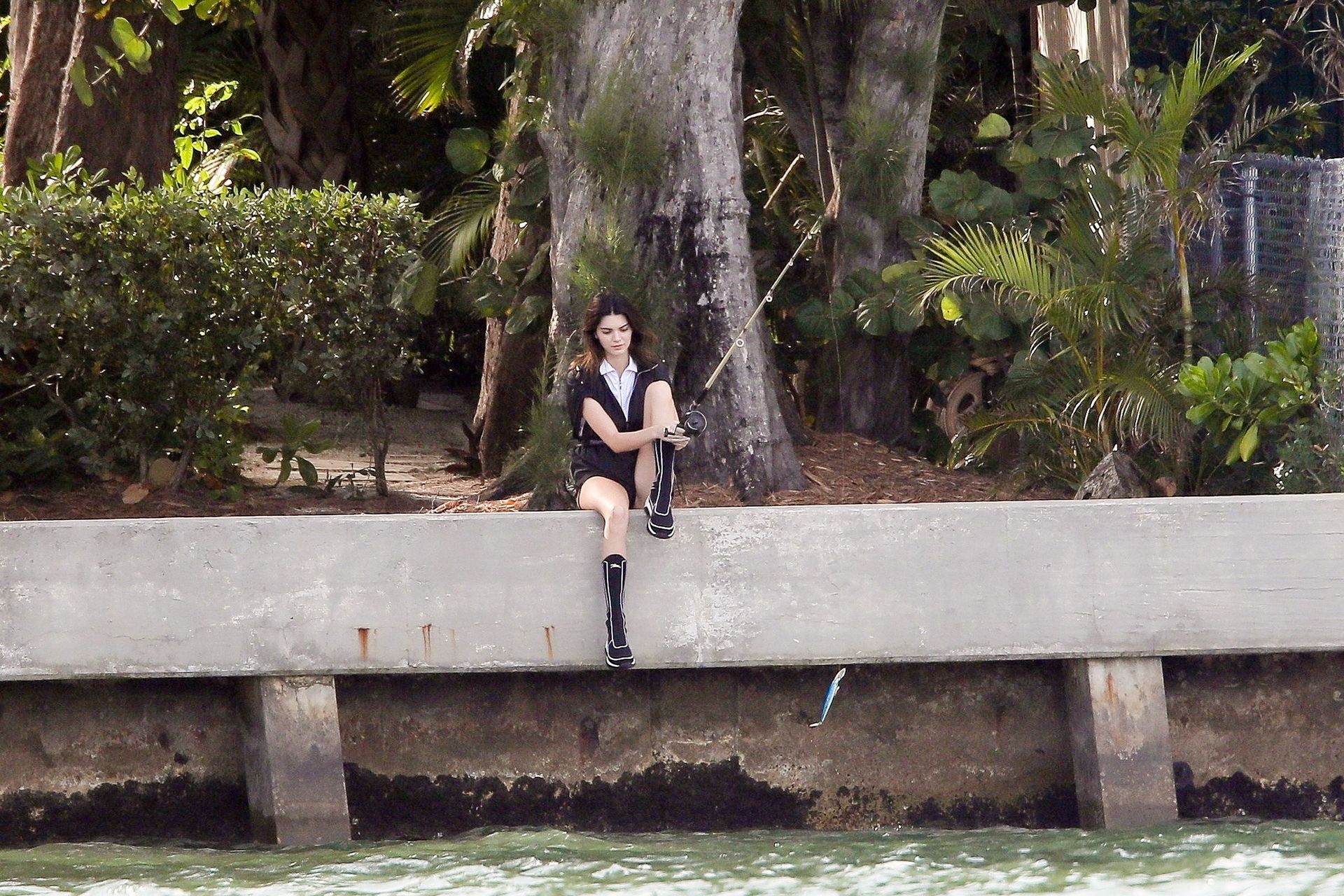 Kendall Jenner slips out of a baby blue outfit and changes into a black ensemble during a photoshoot. Kendall Jenner was wearing a bikini and spraying water out of a hose in Miami, 02/05/2020.