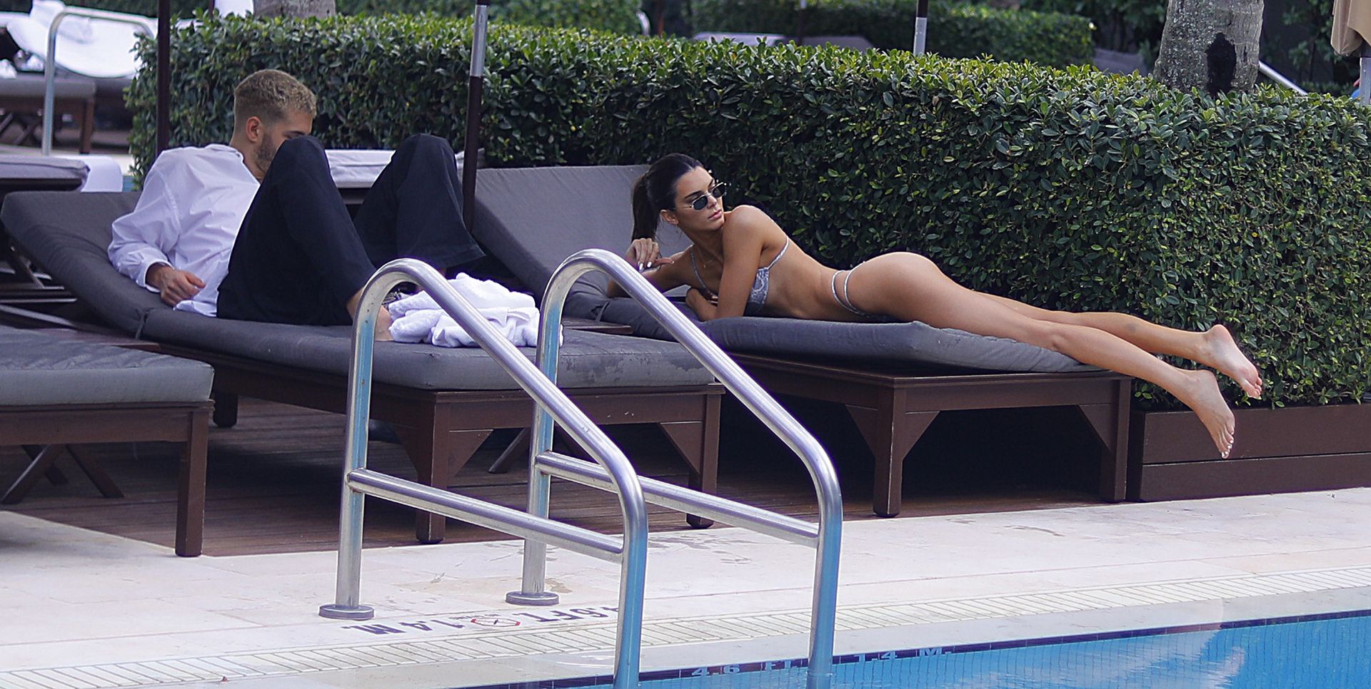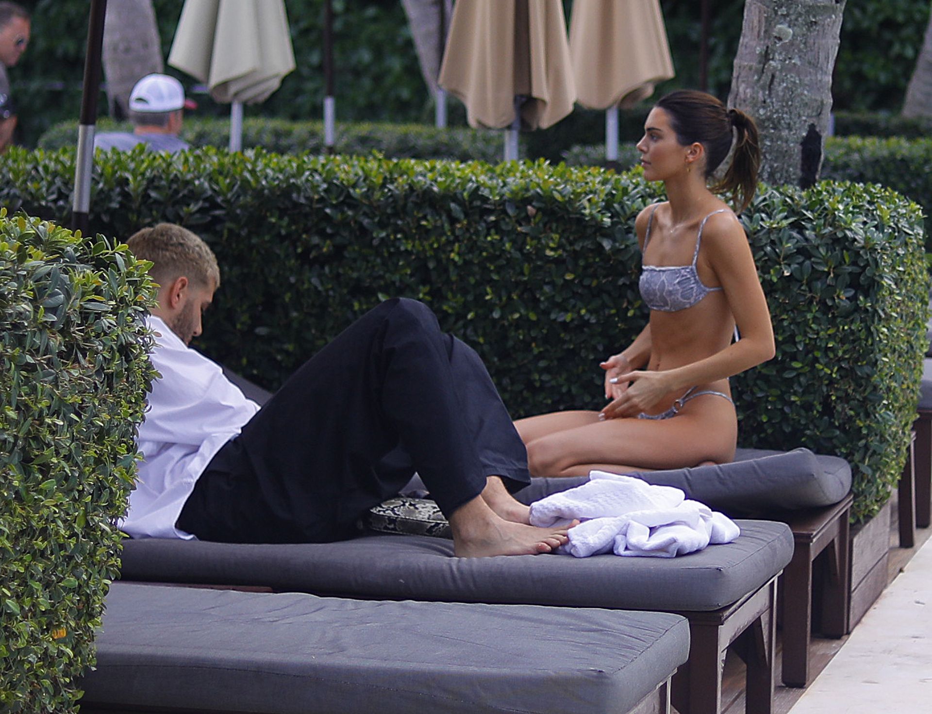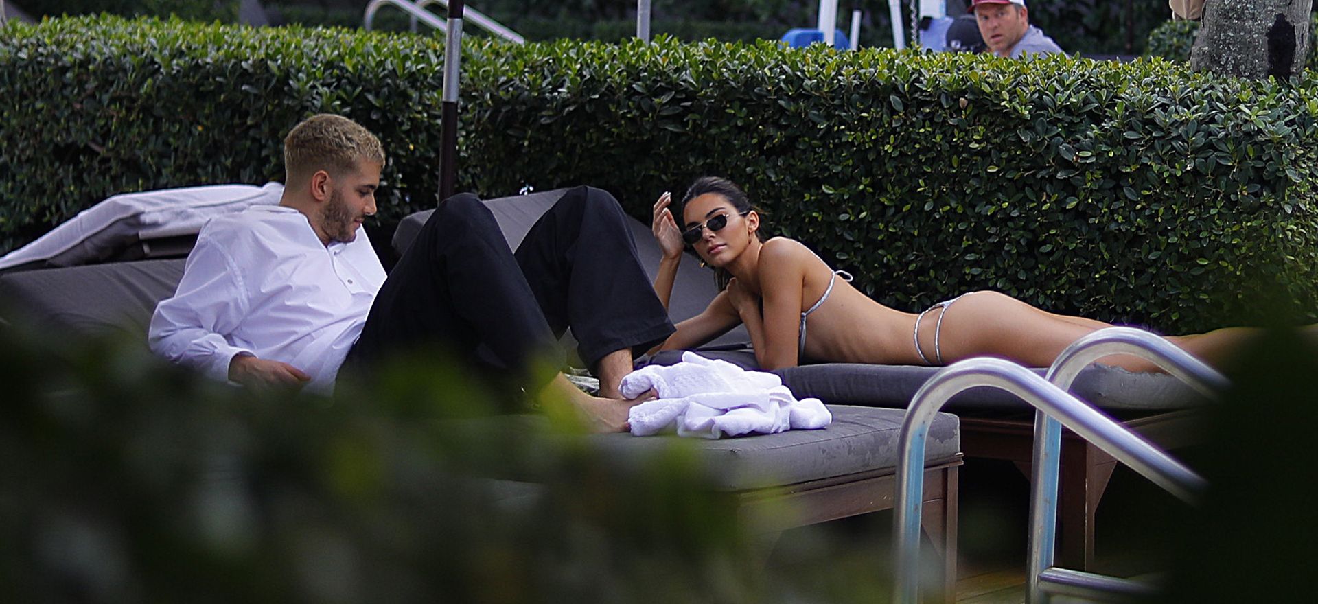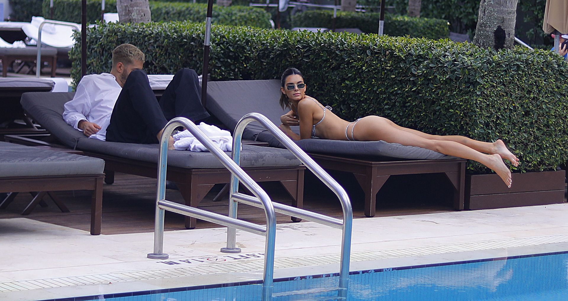 Model Kendall Jenner wears a very skimpy bikini as she relaxes by the pool with model Fai Khadra in Miami, 12/04/2019.