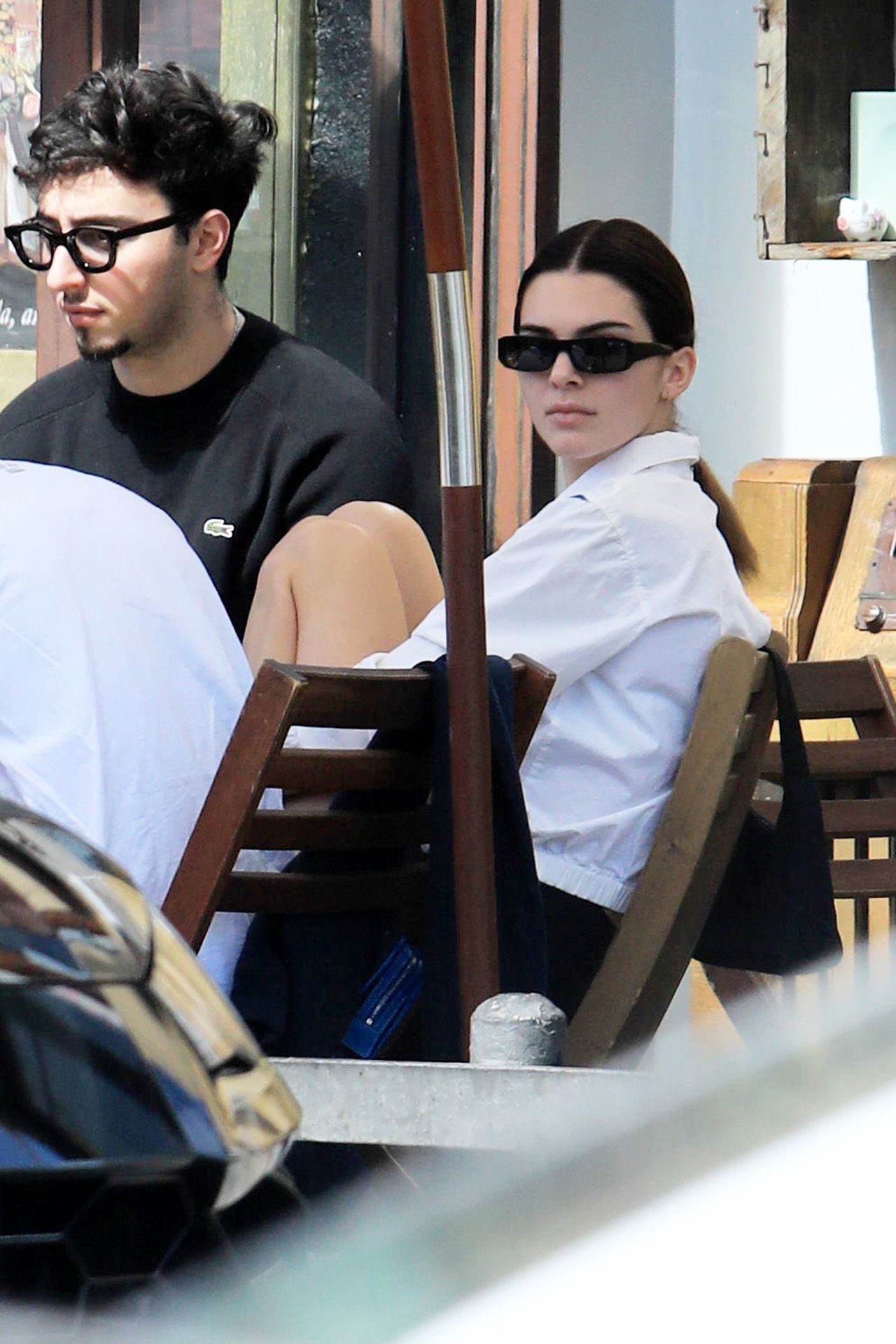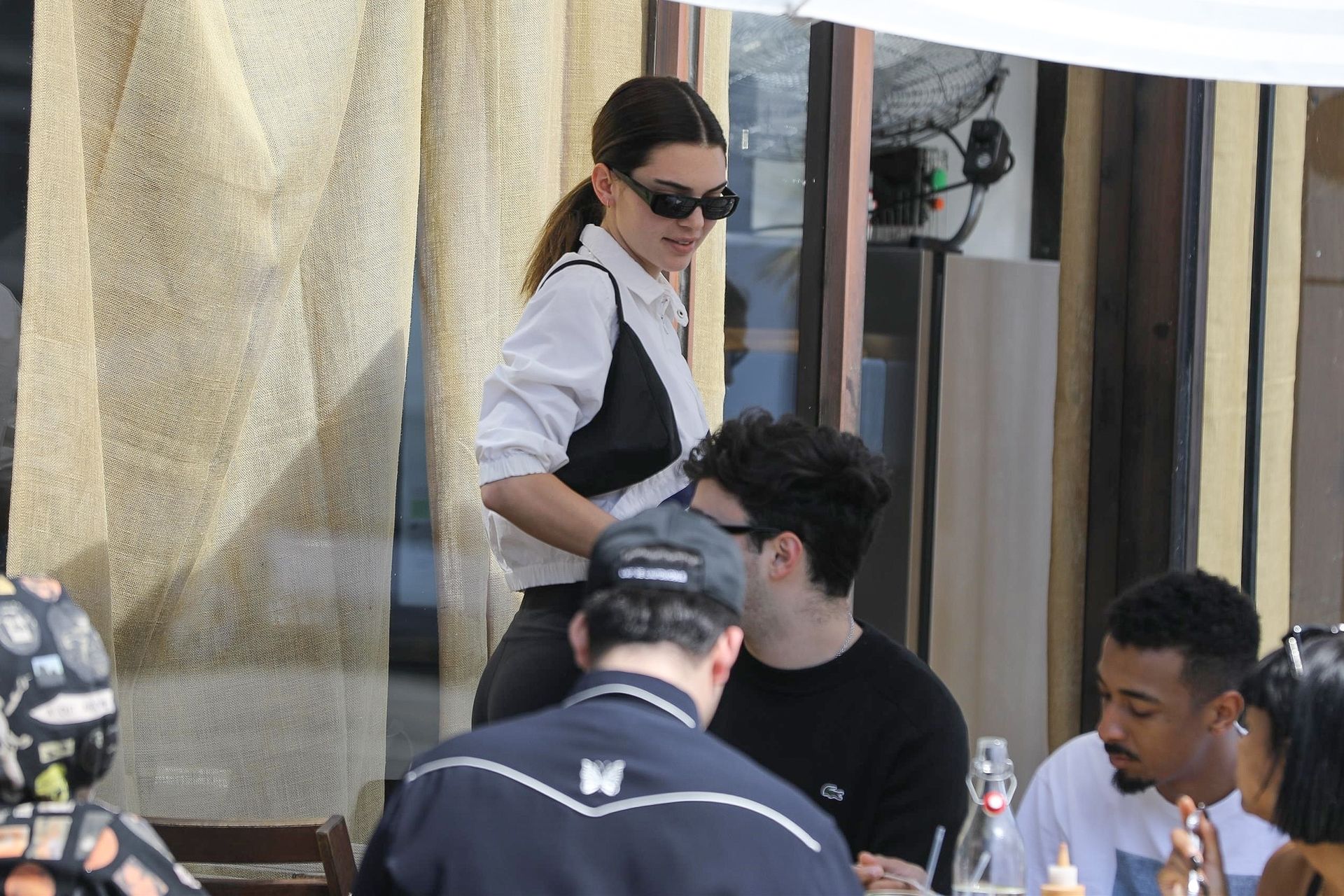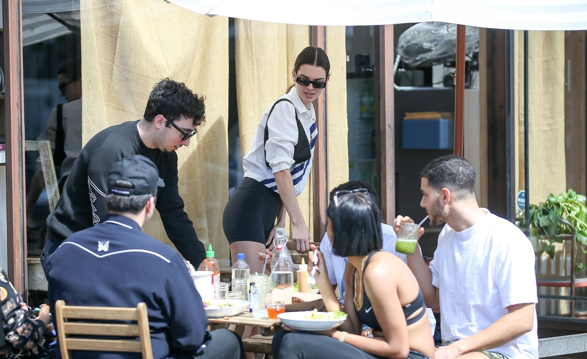 Kendall Jenner joins Fai Khadra, Zack Bia and other friends for lunch at Melrose Place, 03/05/2020. The supermodel then shows off her legs in a pair of sexy black biker shorts.
