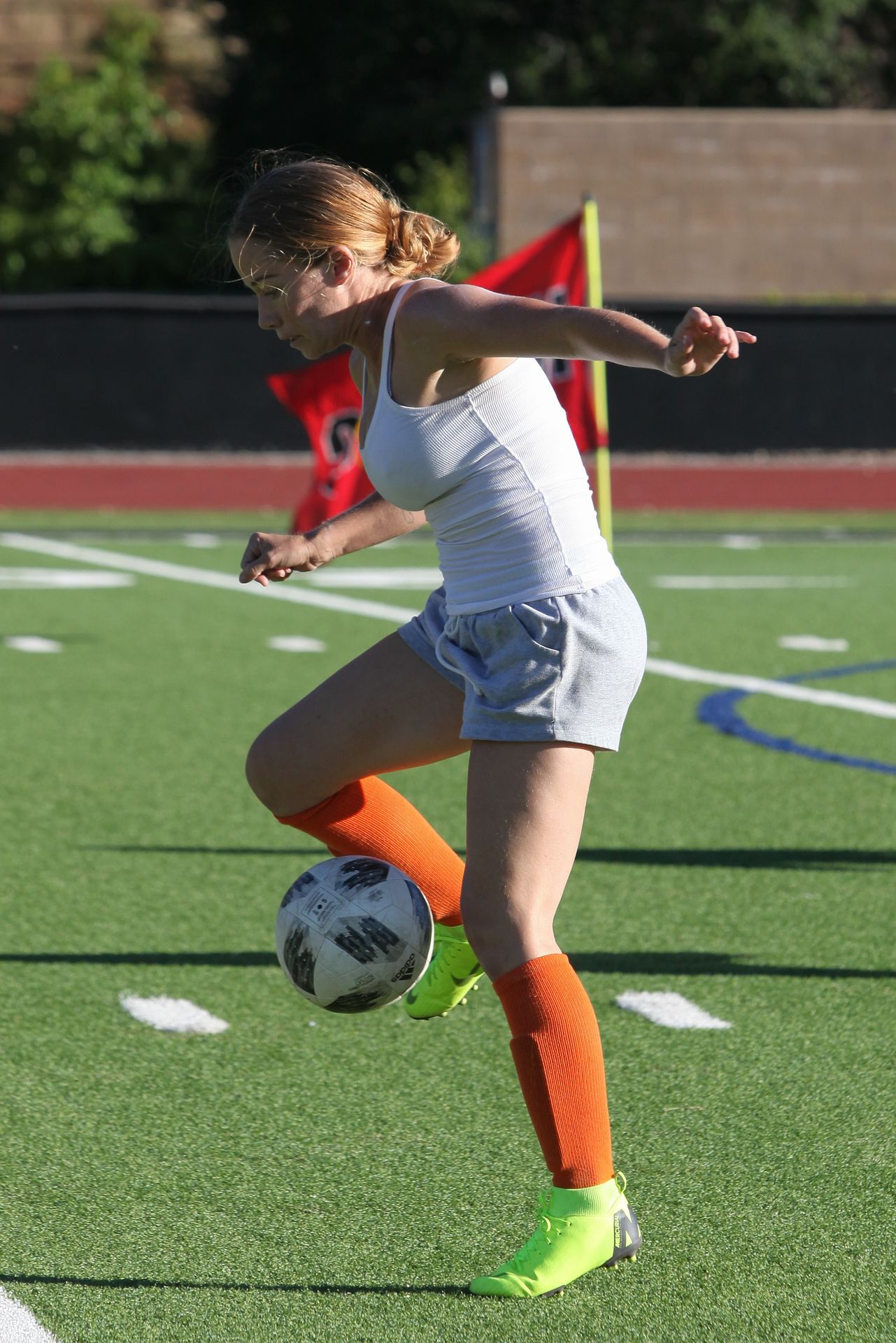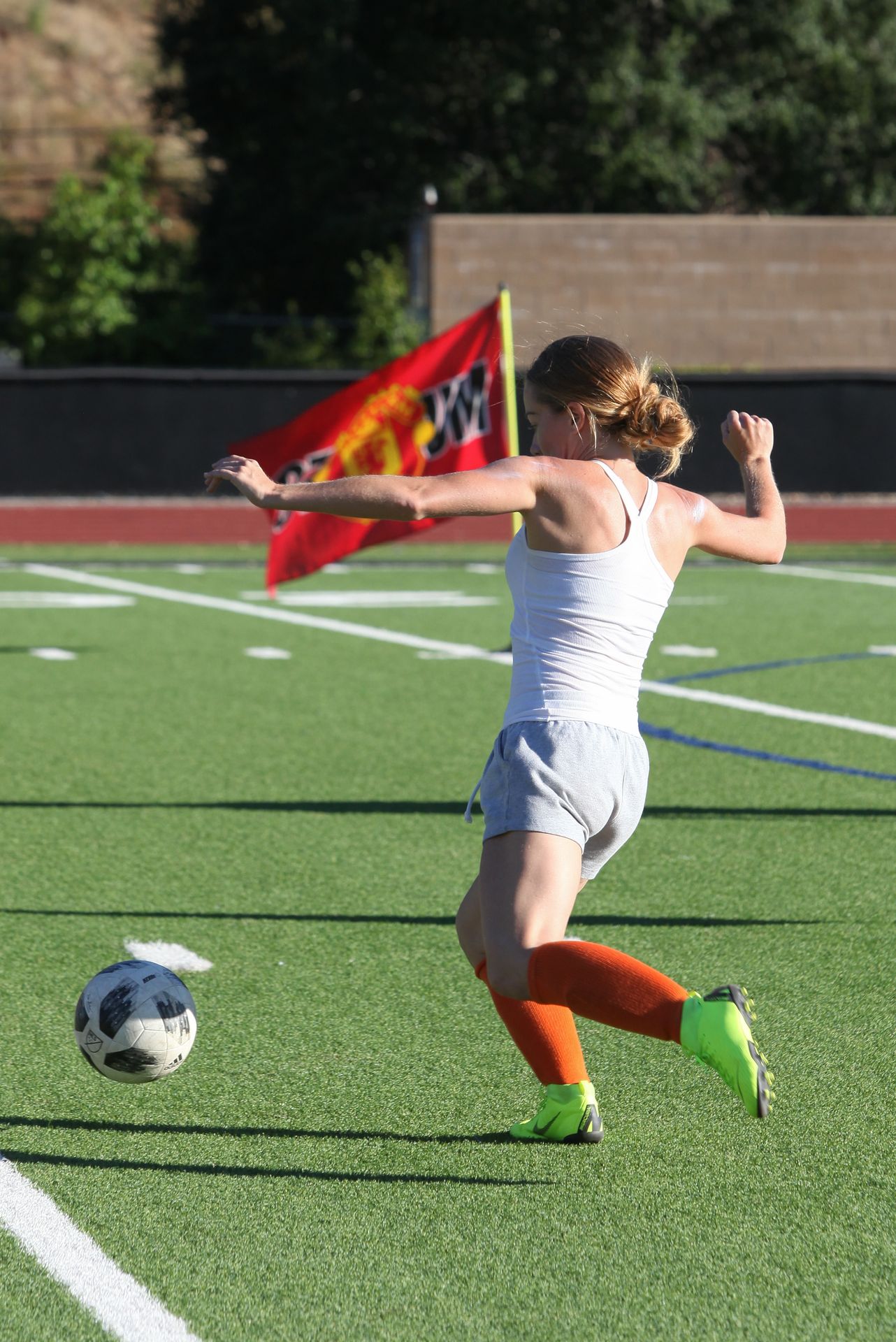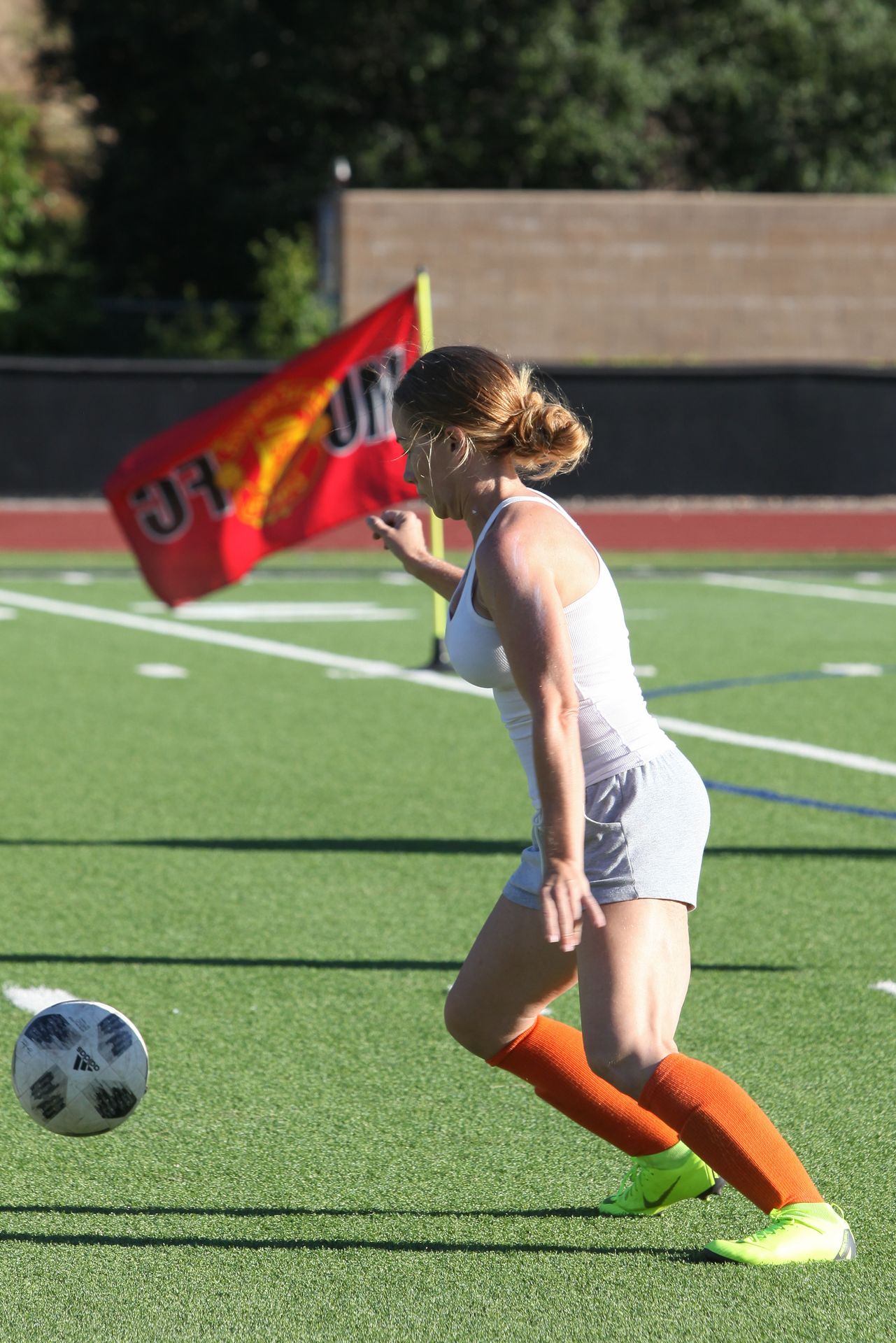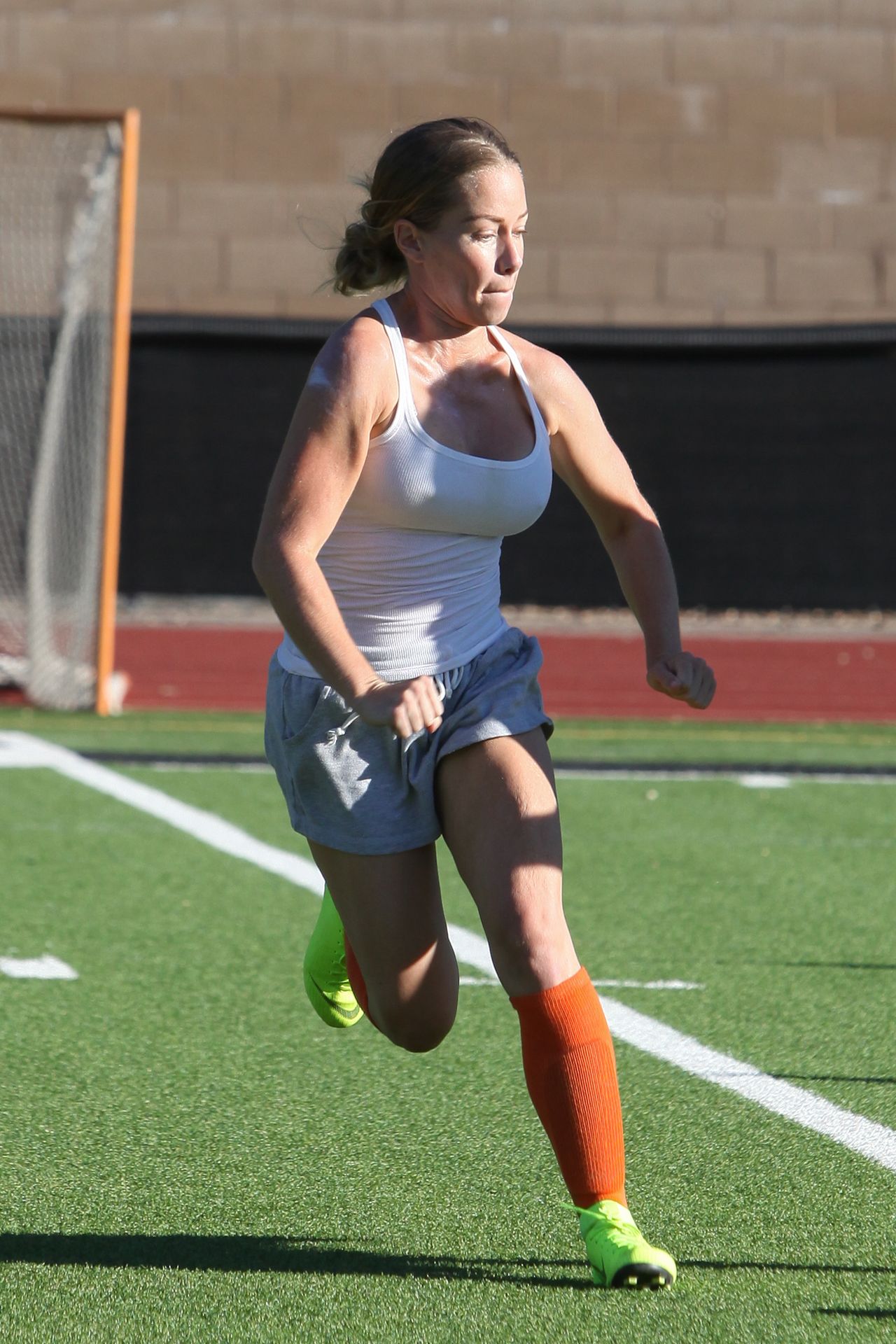 Actress, model, TV star Kendra Wilkinson (34) competes while playing soccer in the hot weather in Los Angeles, 07/22/2019.