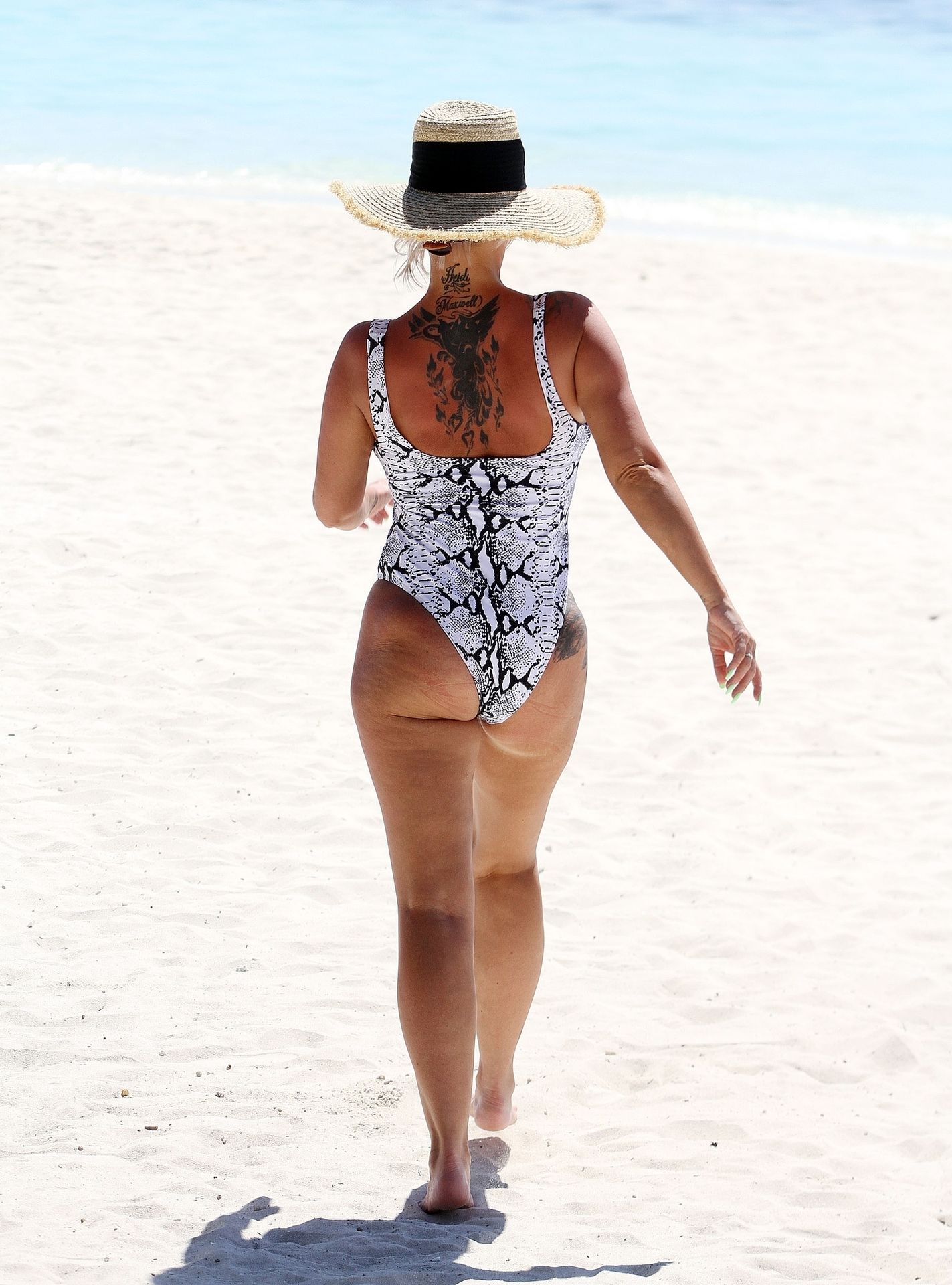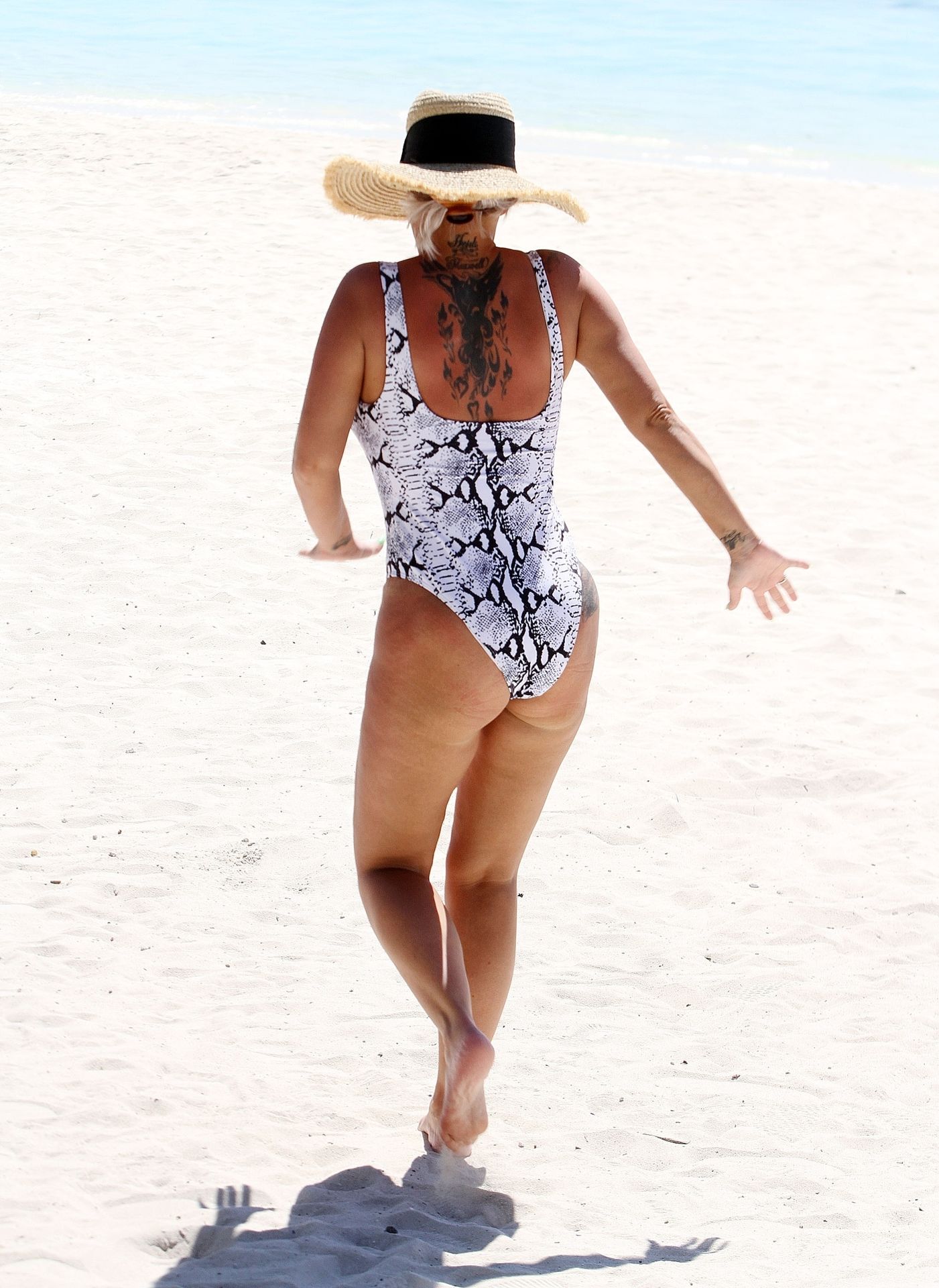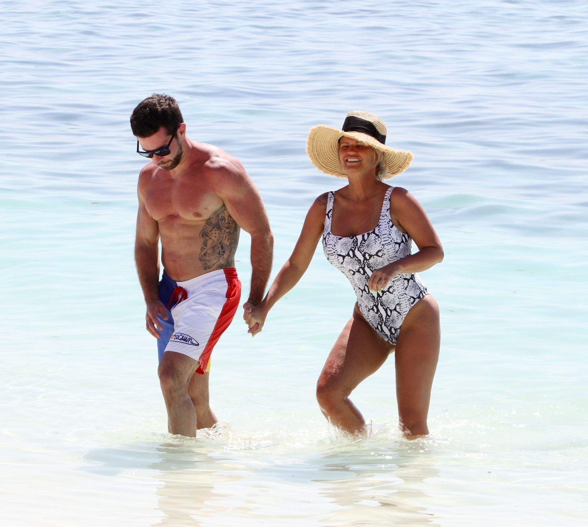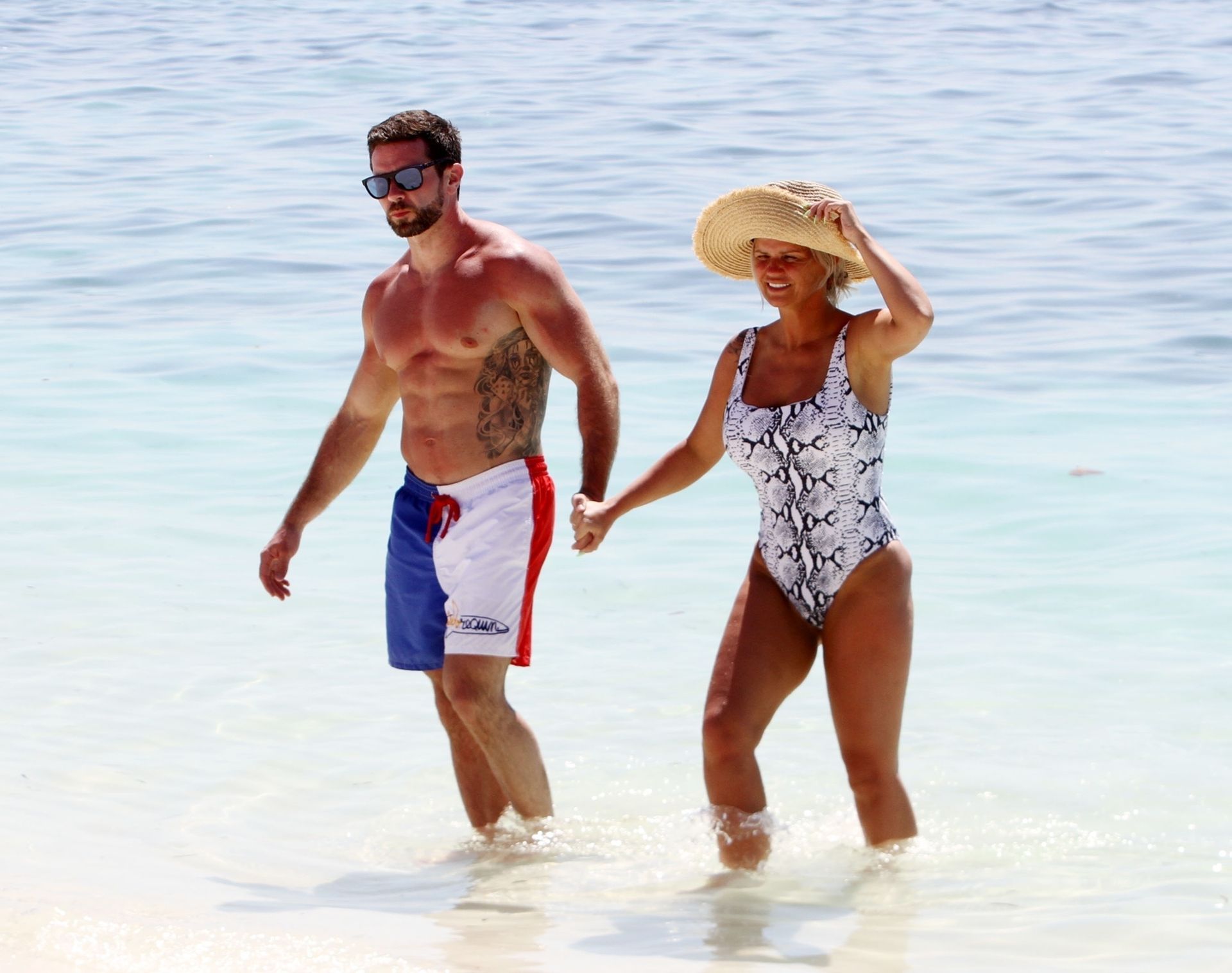 Wearing a sexy striking monochrome snakeskin swimsuit Kerry looked great at the beach showing off her new figure as she took a dip in the sea packing on the PDA with boyfriend Ryan who donned his multicolored swimming trunks.