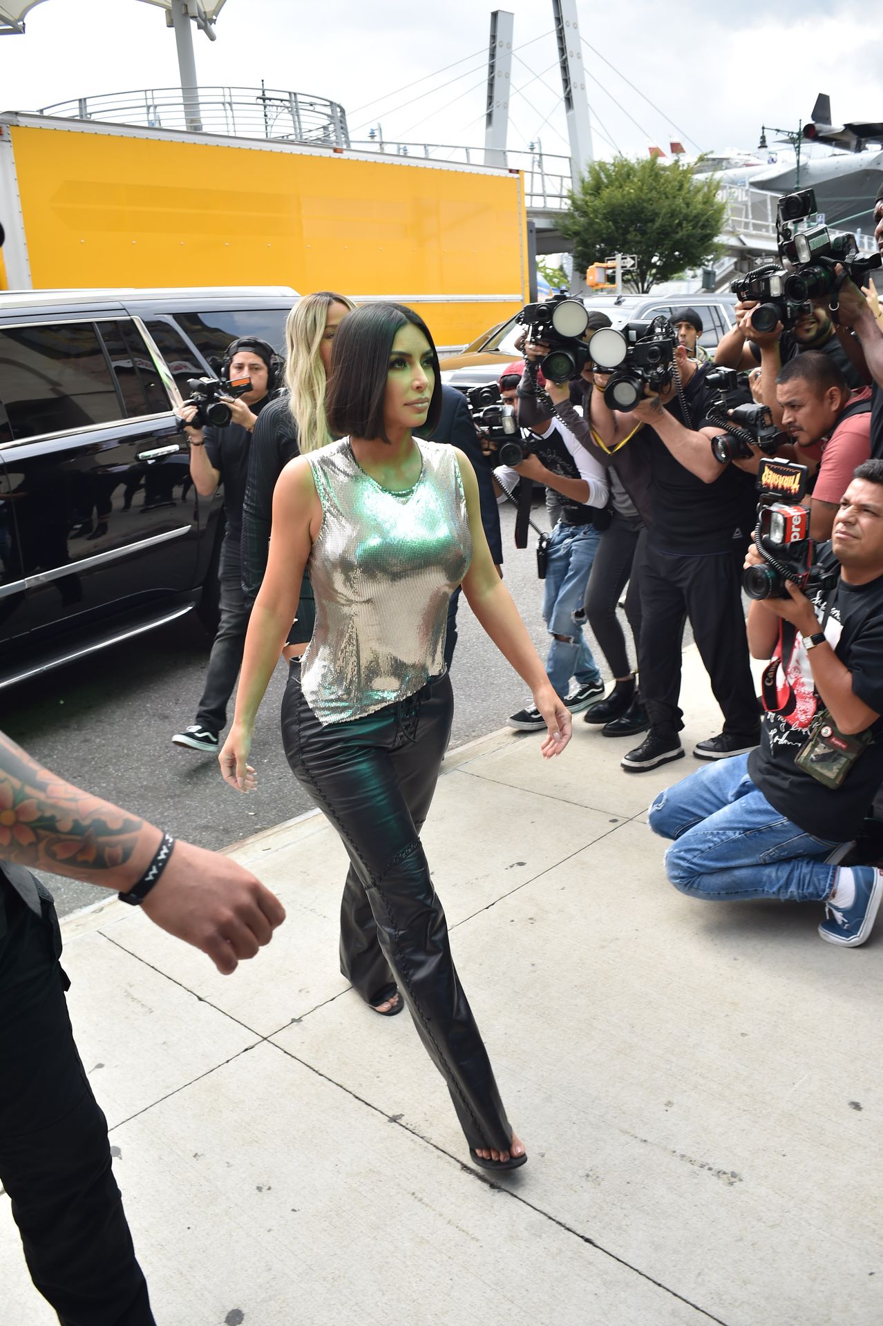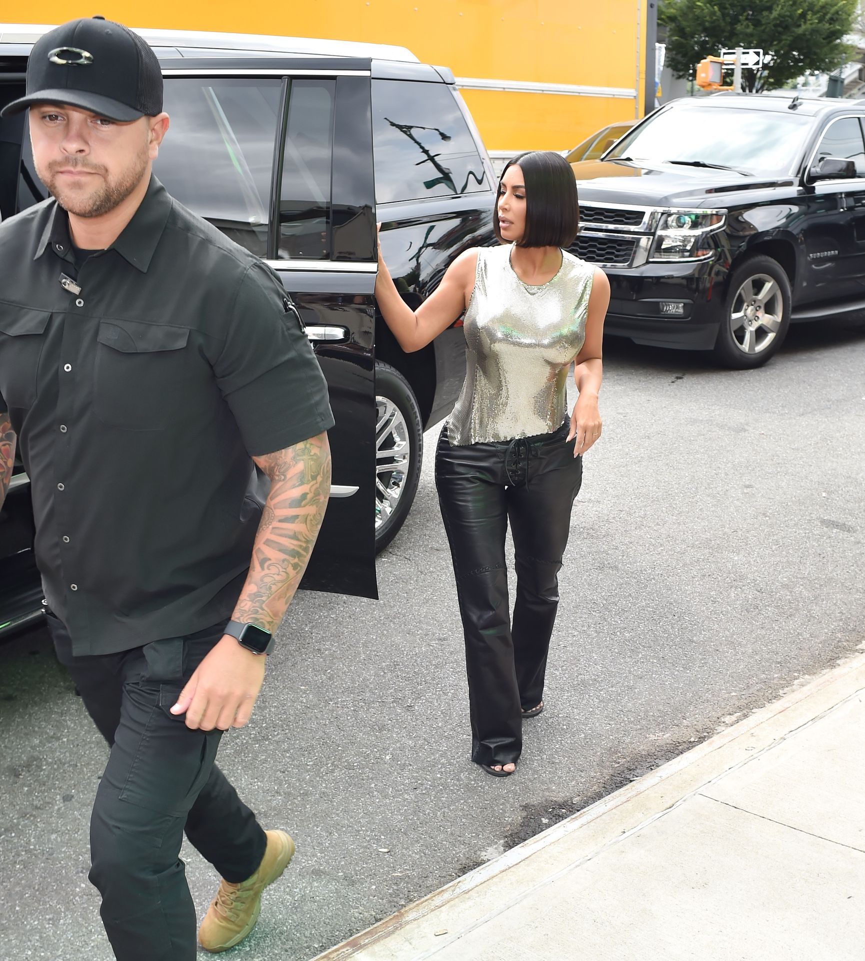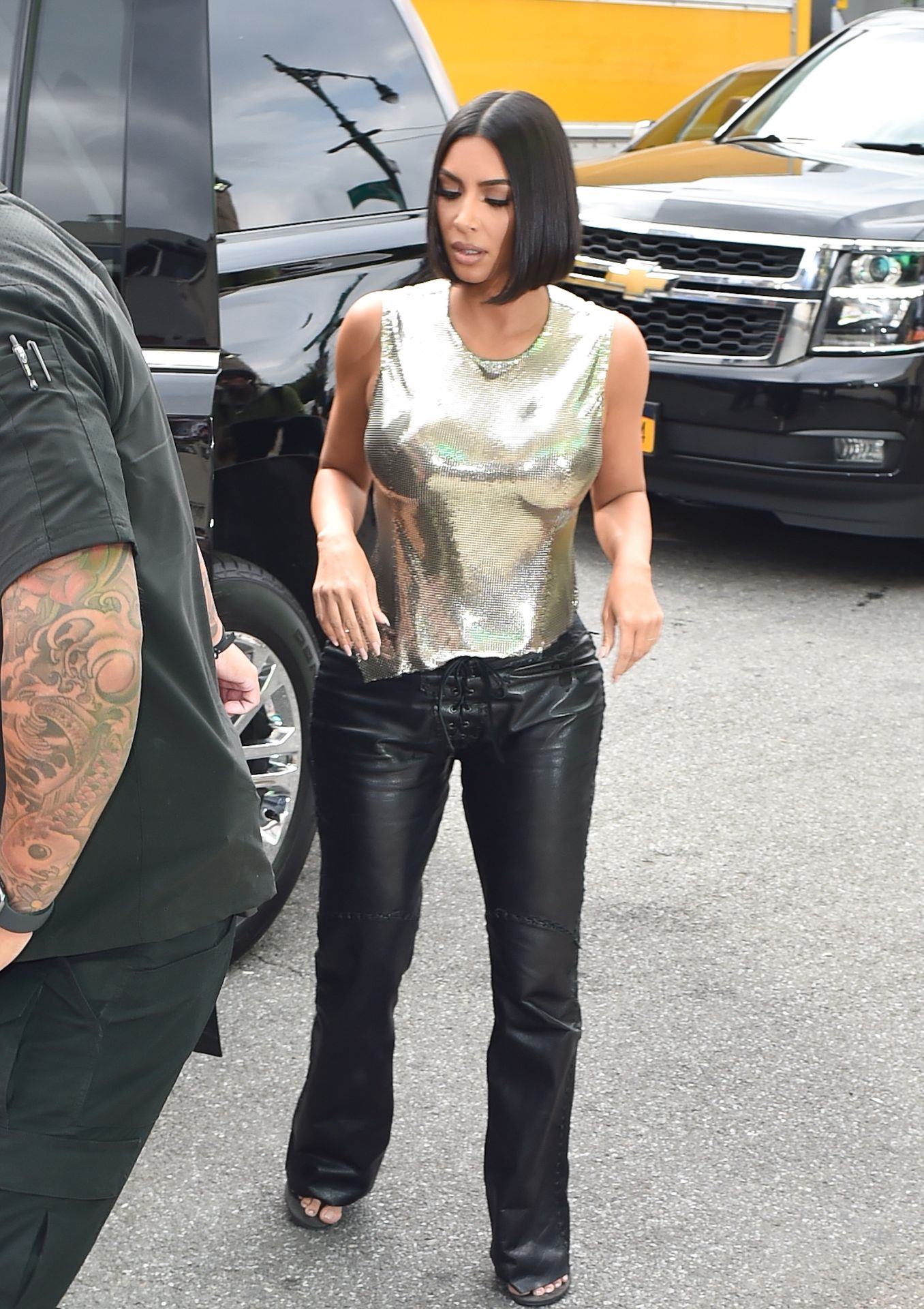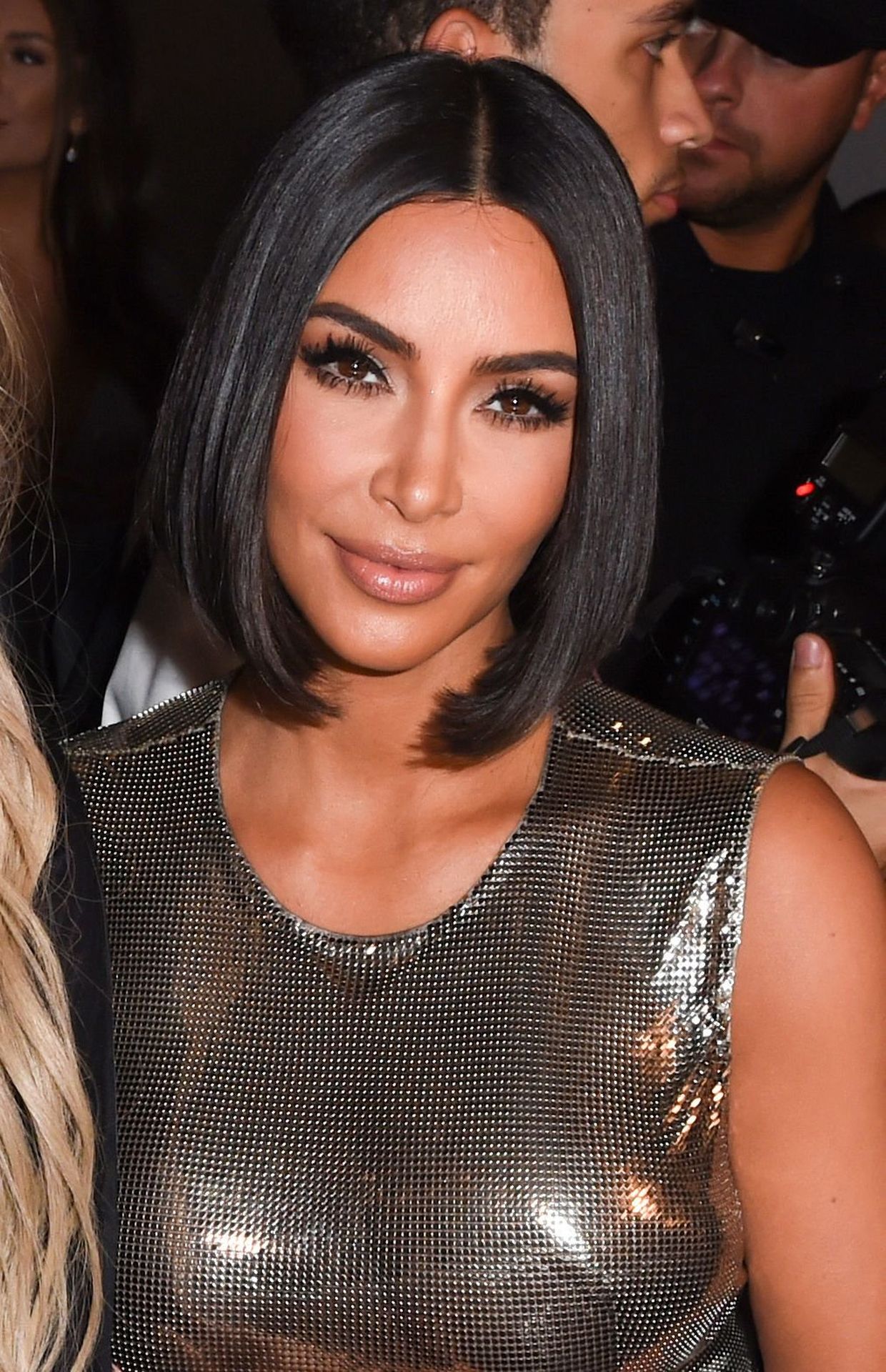 Curvy brunette Kim Kardashian arrives at a fashion show in New York during New York Fashion Week, 09/10/2019. The 38-year-old busty reality TV star chose for the event a see-through metal blouse.
