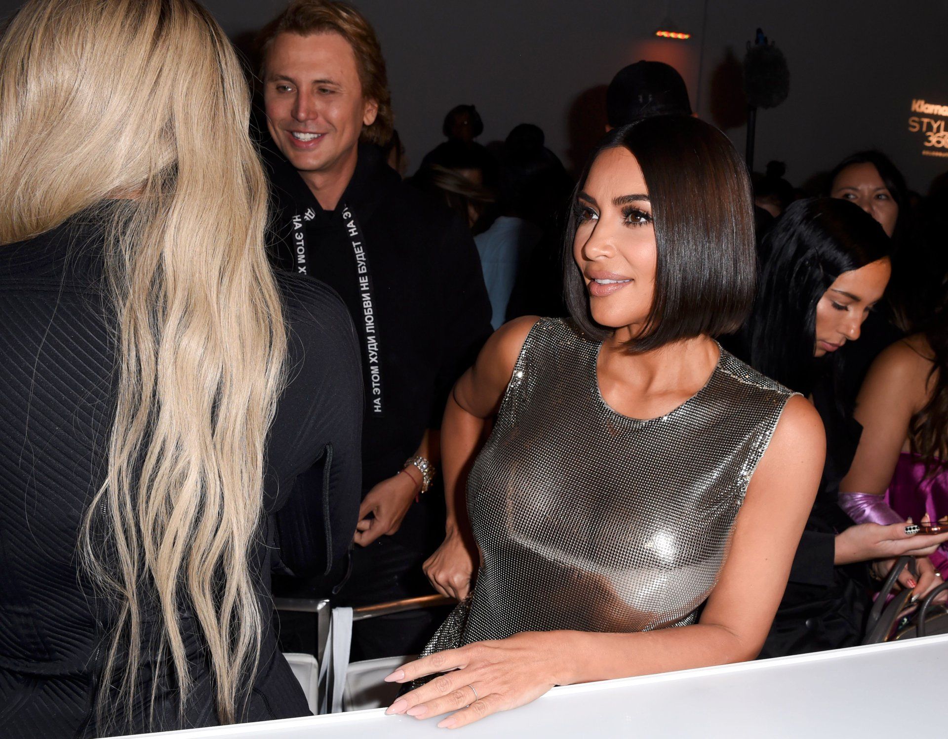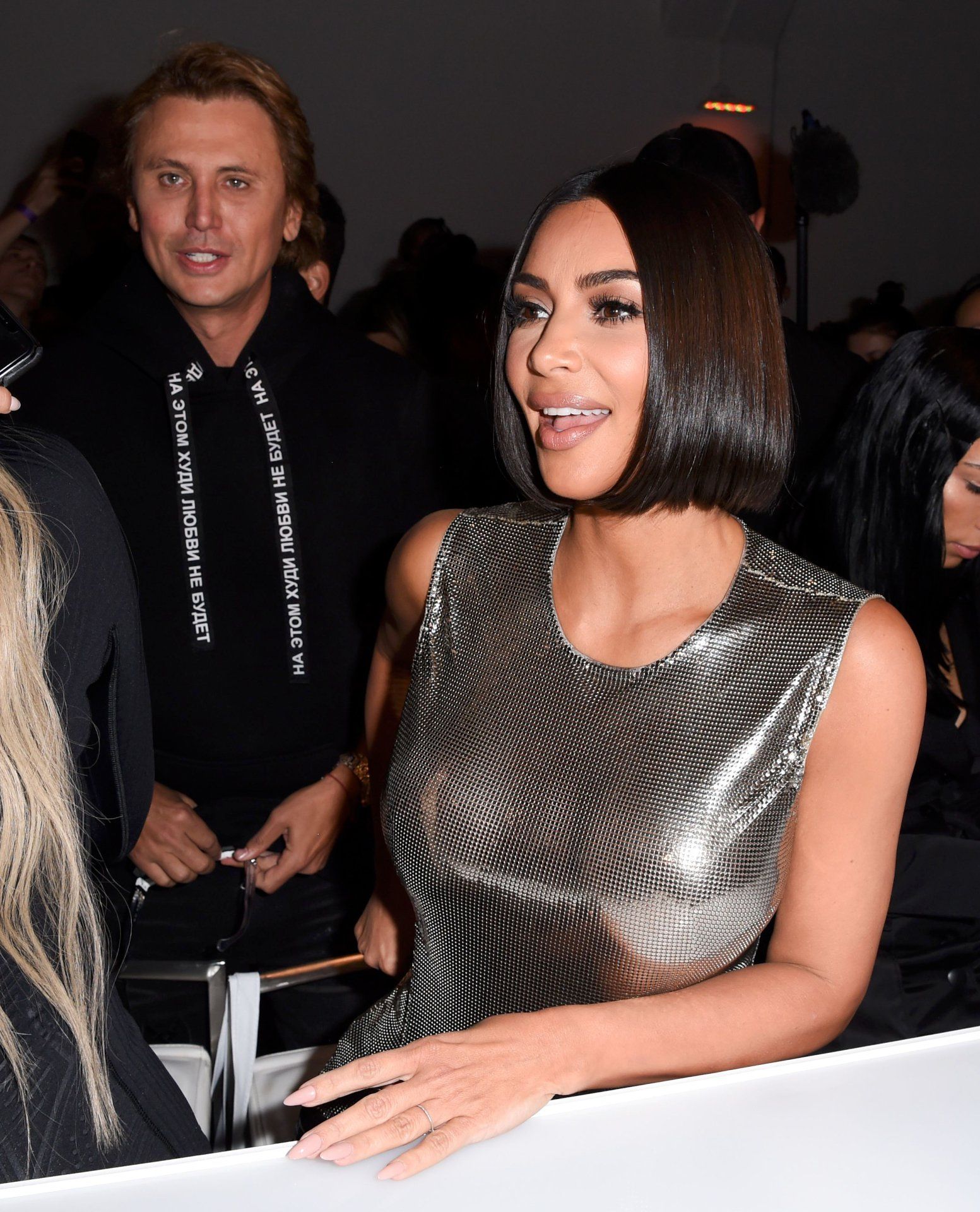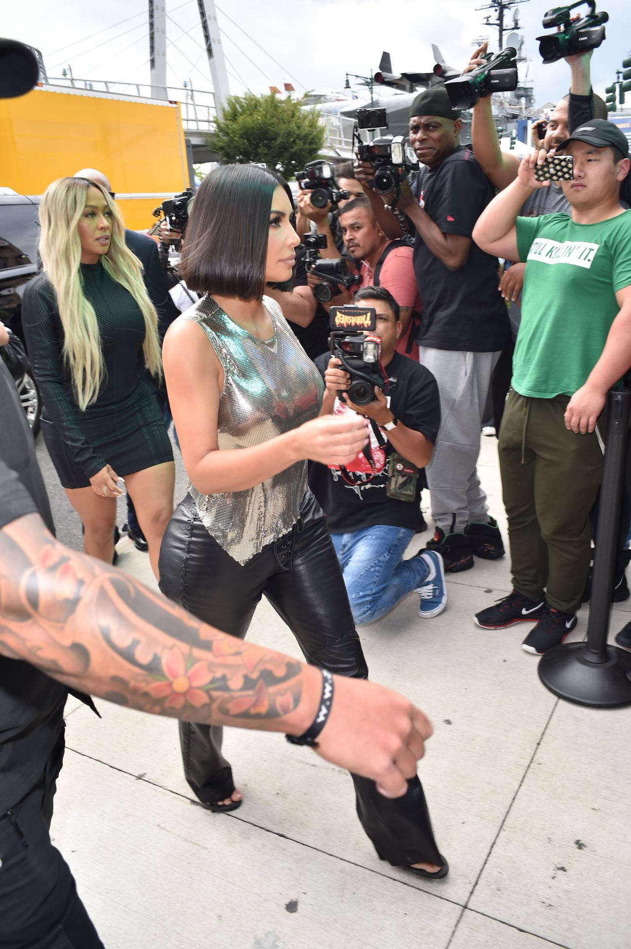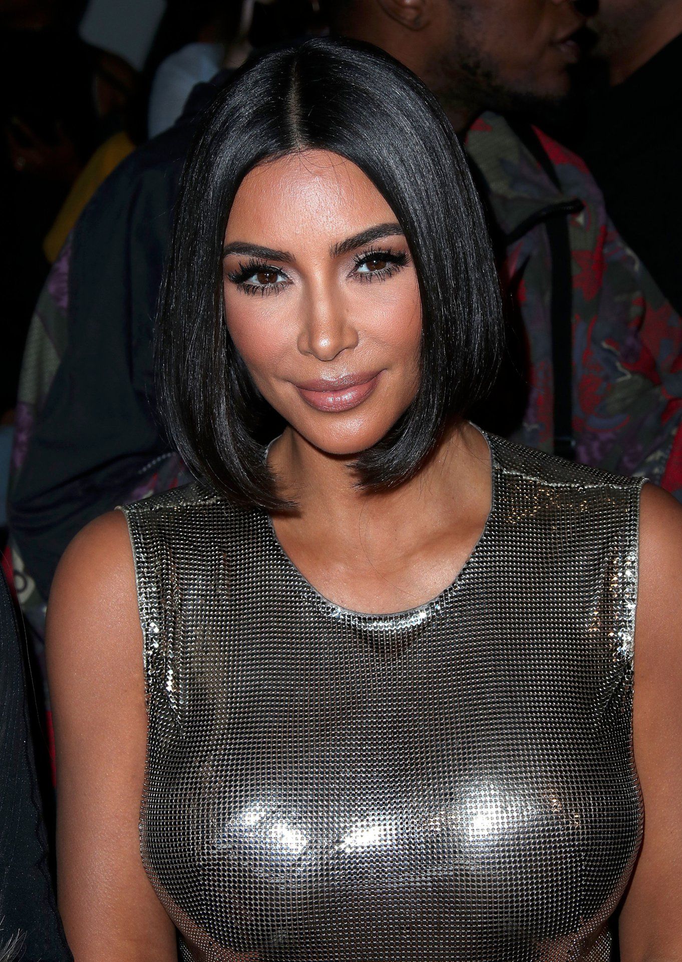 Curvy brunette Kim Kardashian arrives at a fashion show in New York during New York Fashion Week, 09/10/2019. The 38-year-old busty reality TV star chose for the event a see-through metal blouse.