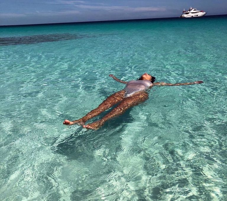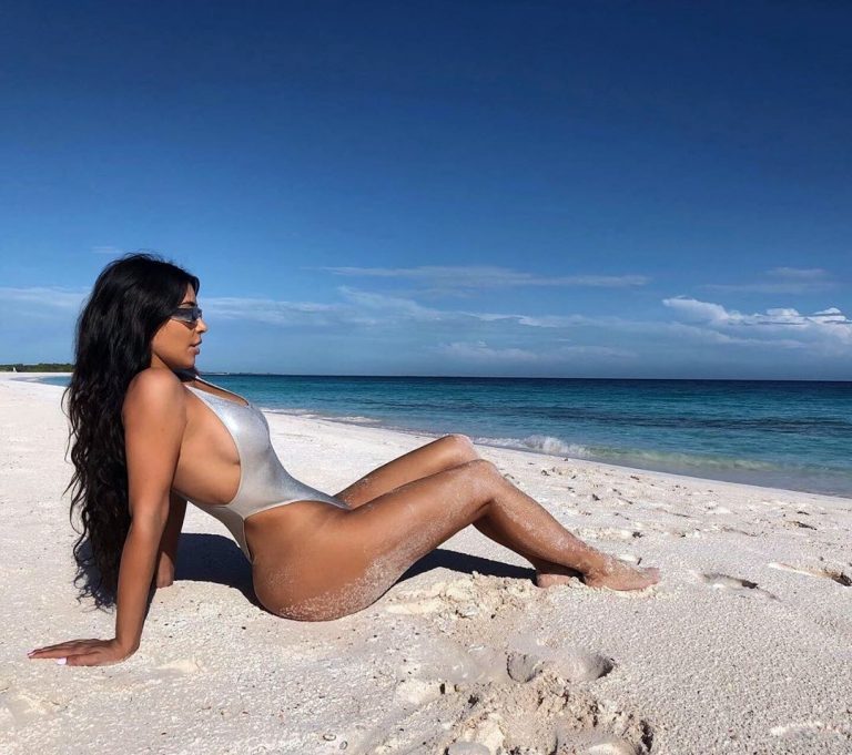 Kim Kardashian enjoys her vacation alone, posing in a silver one-piece swimsuit on the beach – Instagram, 08/30/2019.