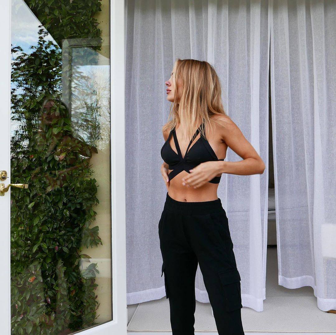 Kimberley Garner looks sexy showing off her toned body wearing black top and sweatpants.