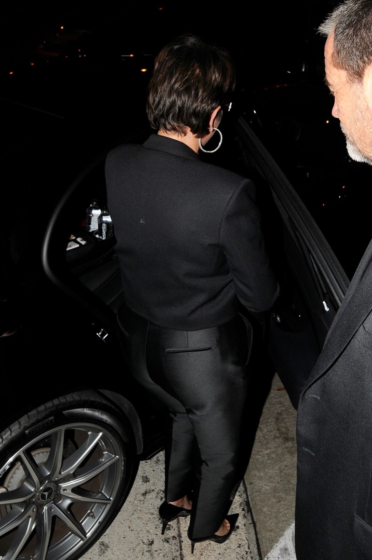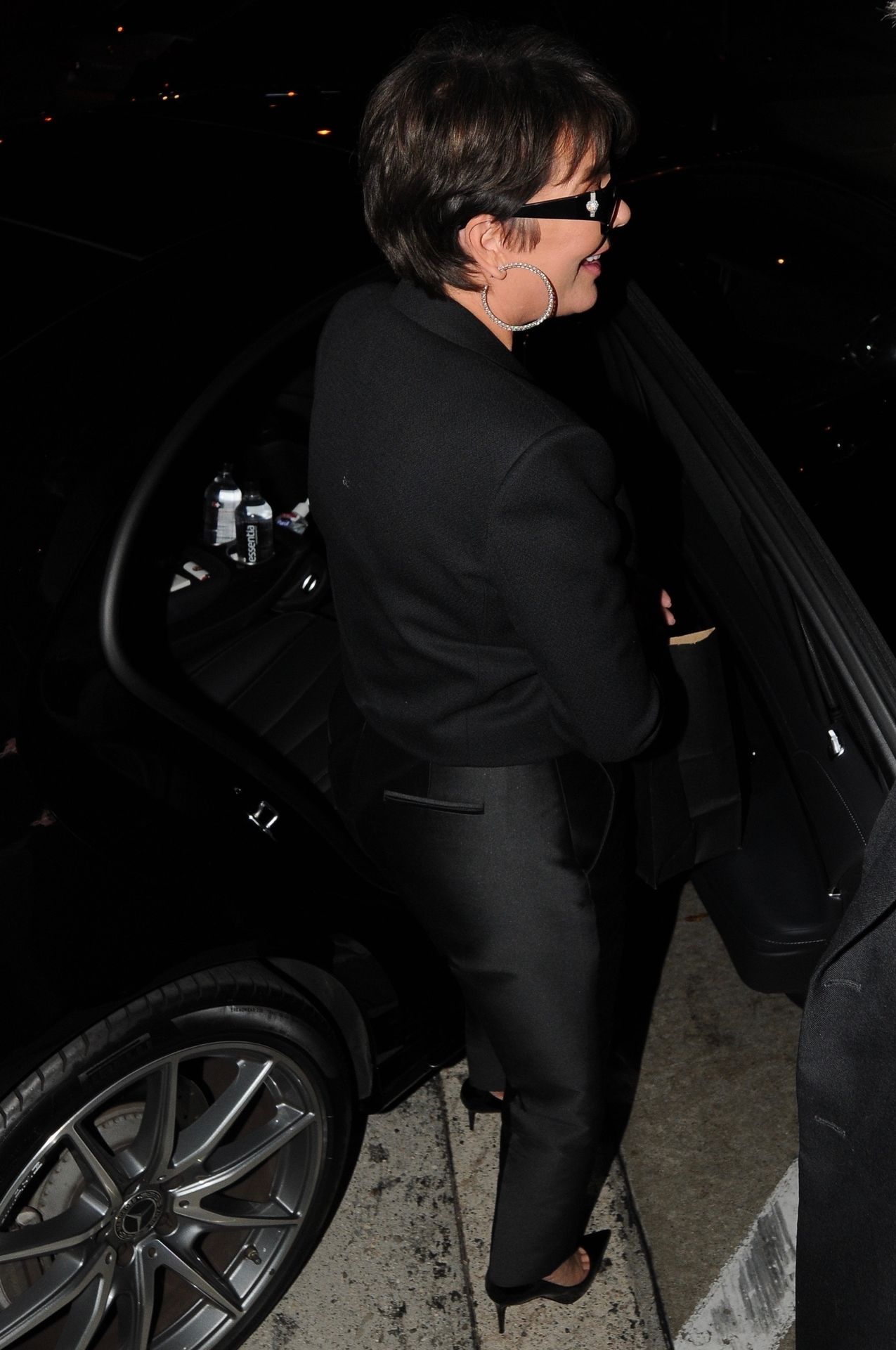 Jenner is seen sporting a sexy black top and bustier beneath her chic black tuxedo jacket. Earlier in the day, Jenner made an appearance on the Ellen DeGeneres Show with daughter Kylie.