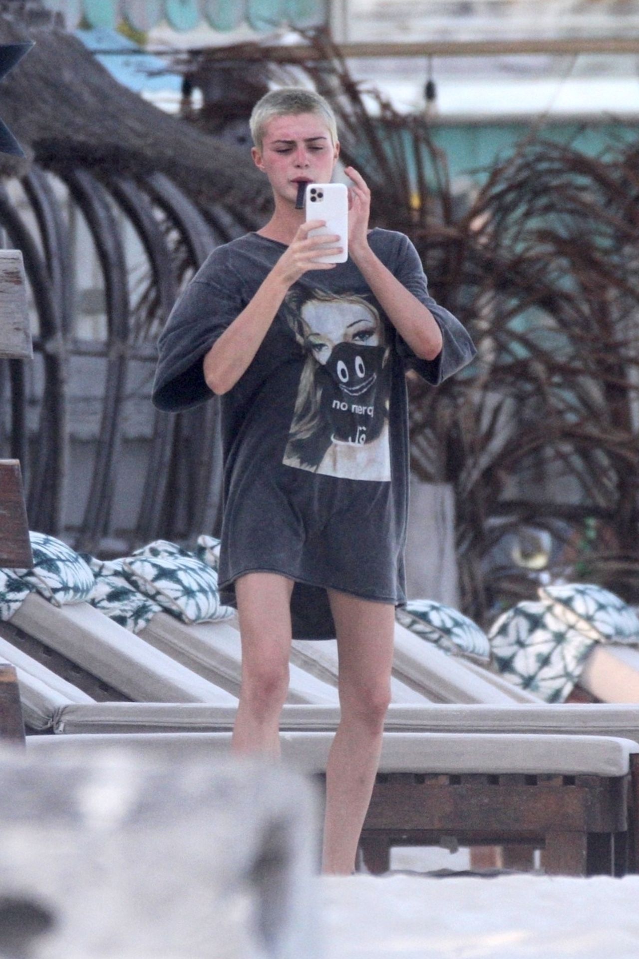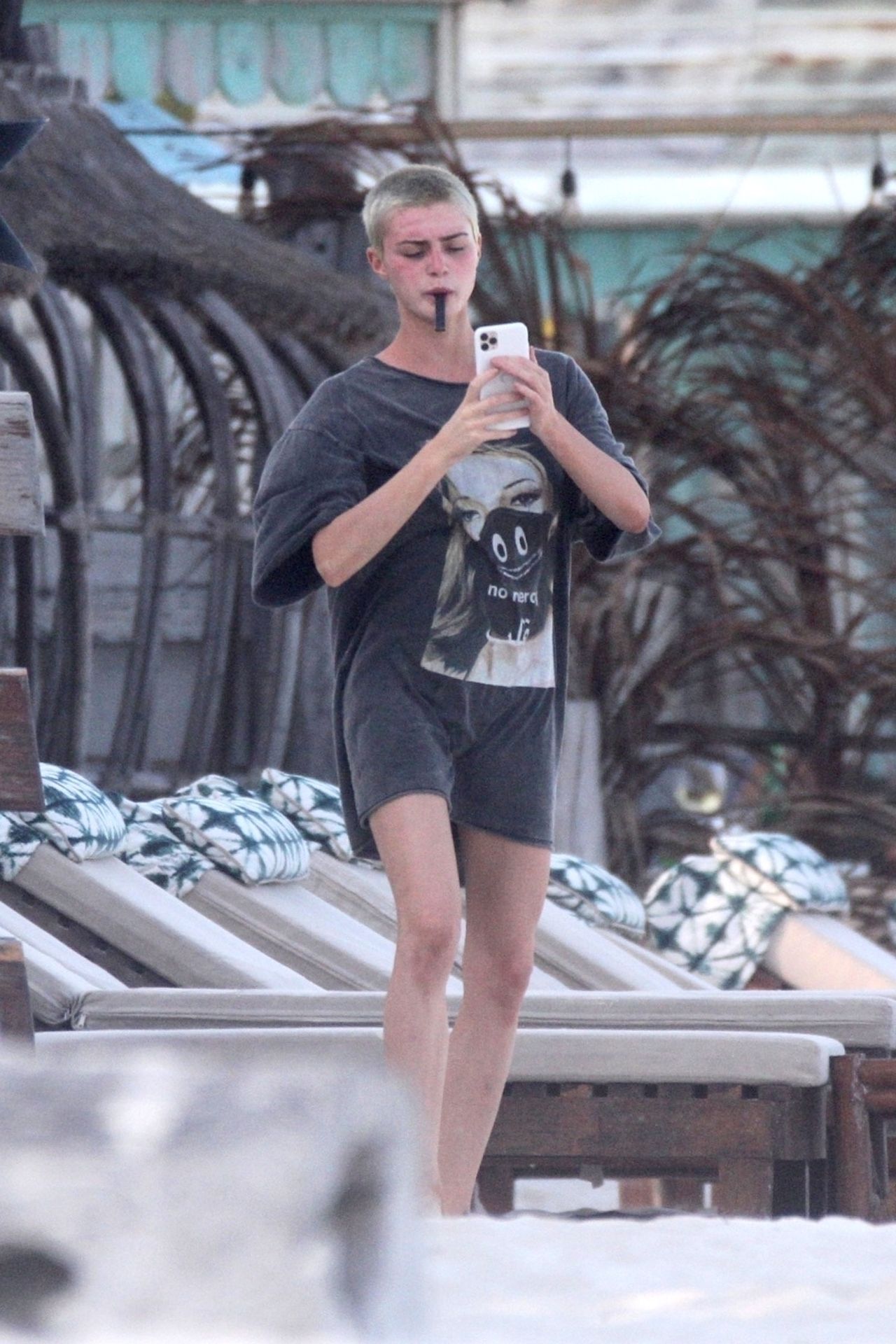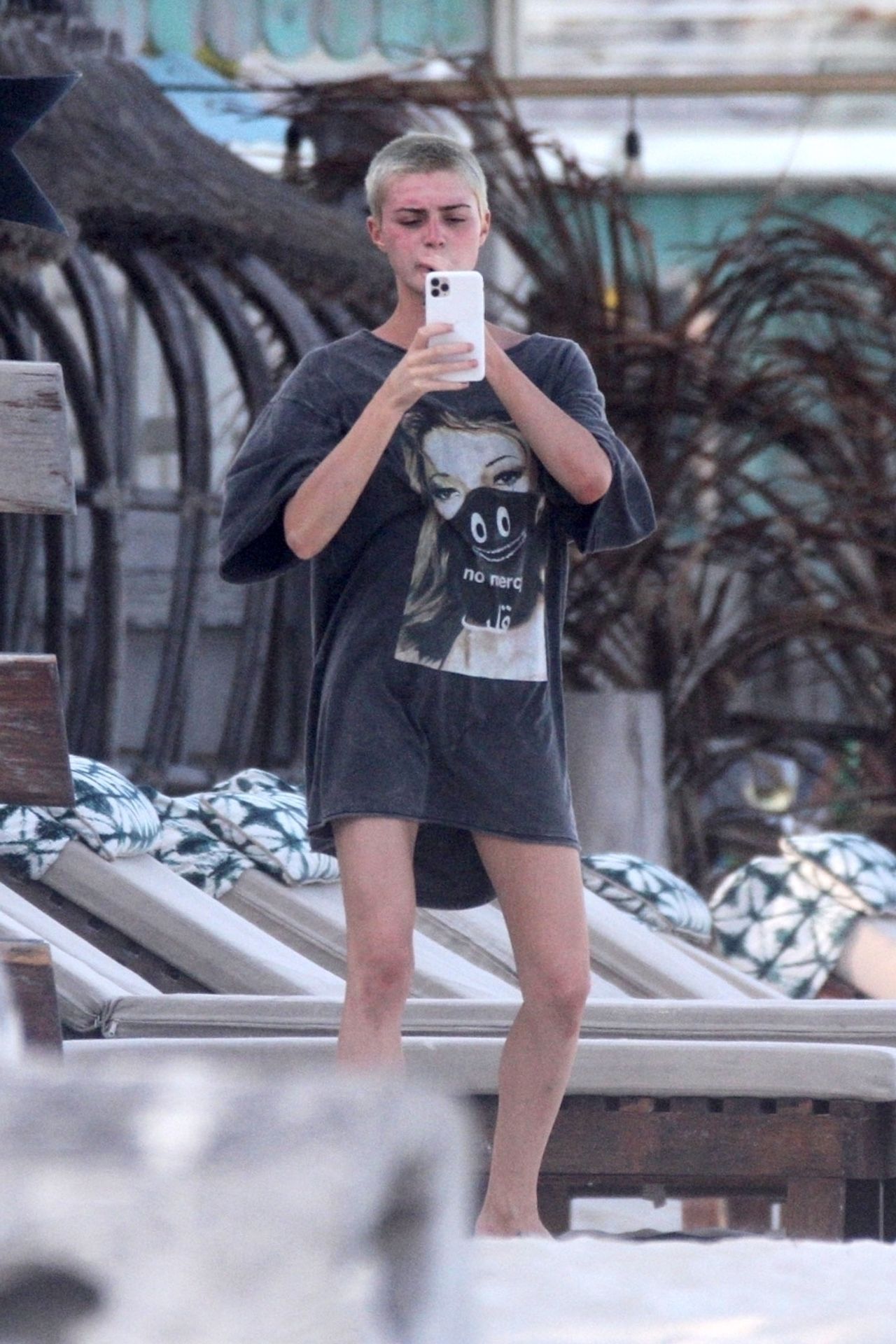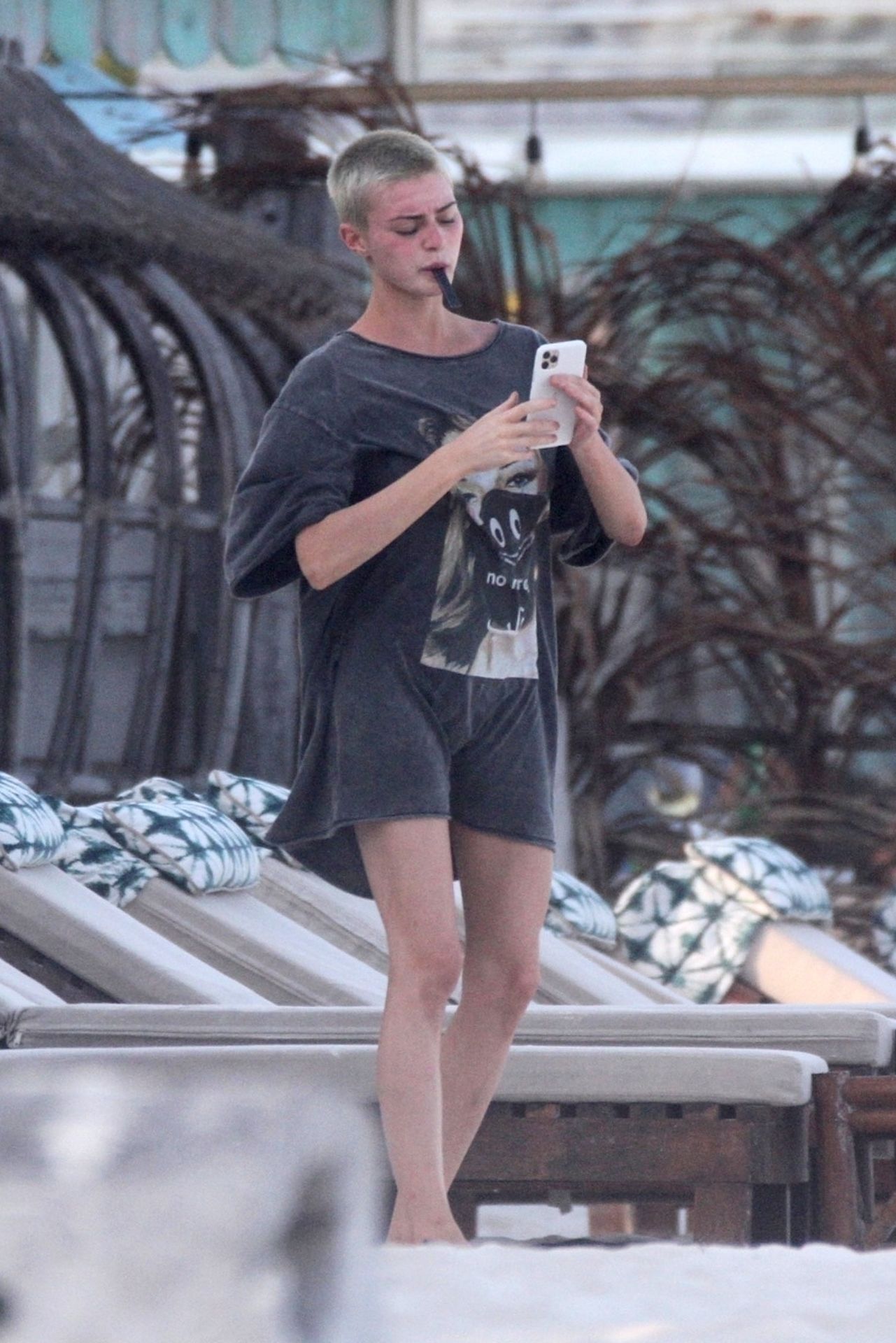 Kirsten sunbathed on a lounge chair and opted to go topless to avoid those harsh unwanted tan lines. Kristen appeared to be taking a few photos with a friend on her cell phone and puffed on a JUUL.