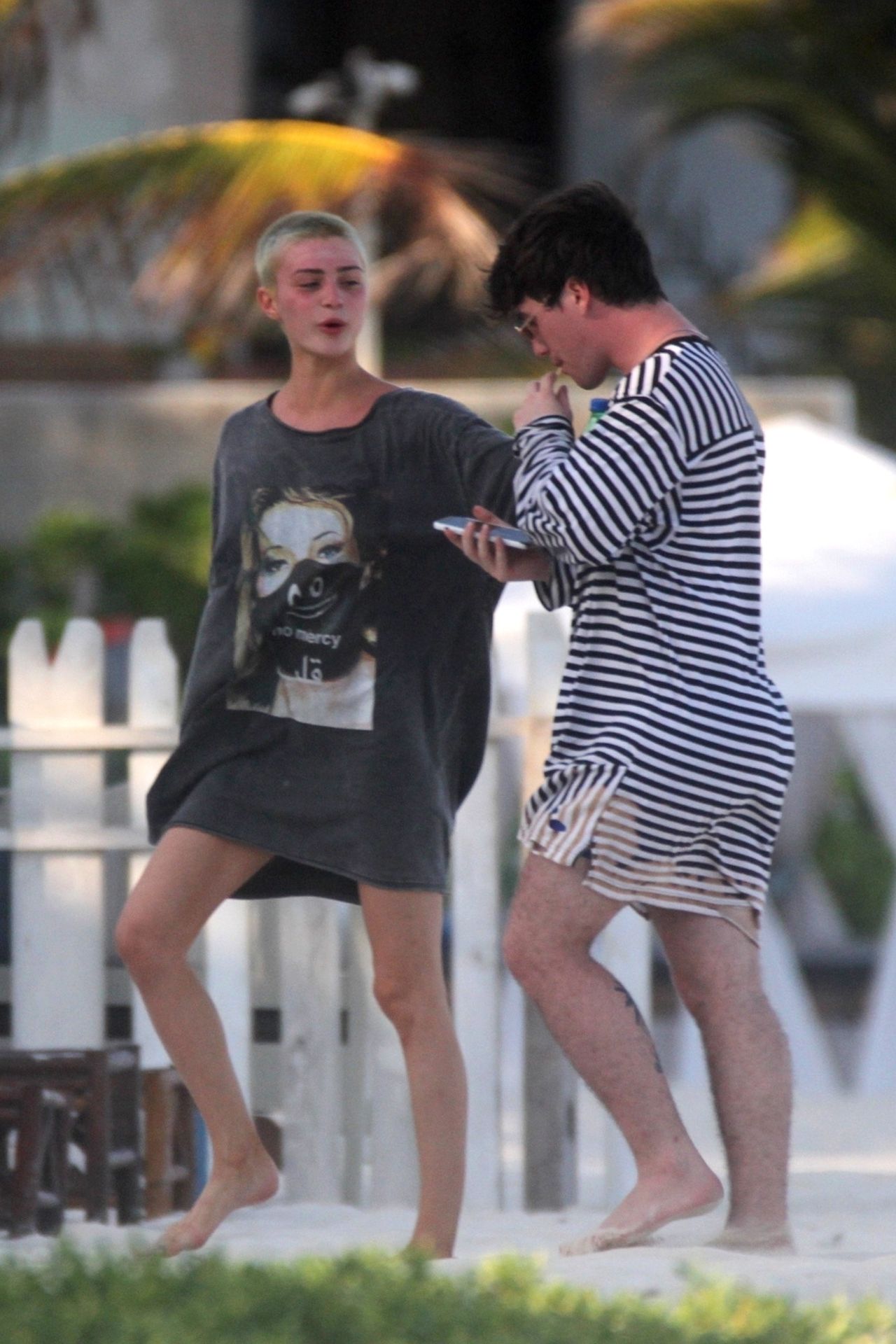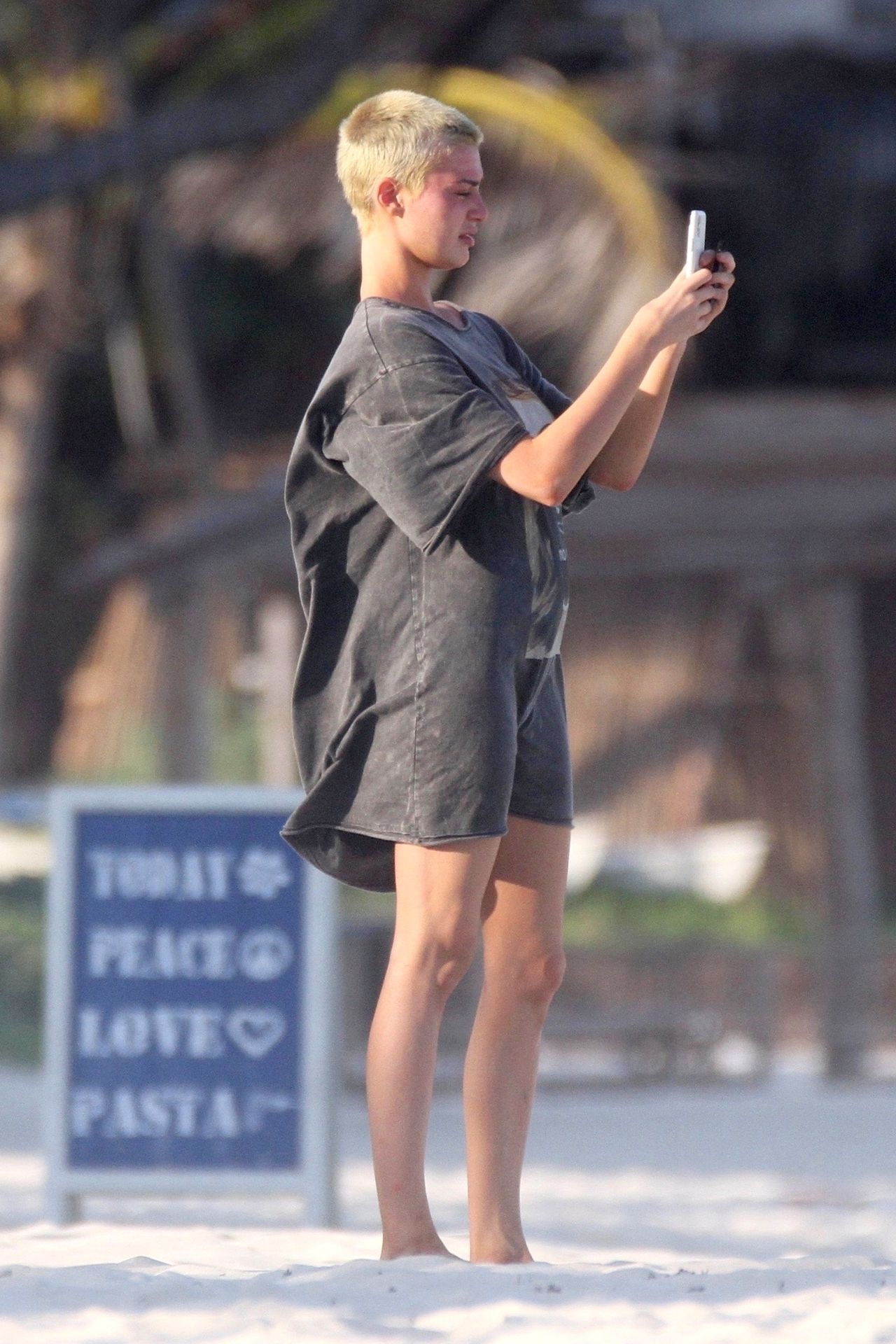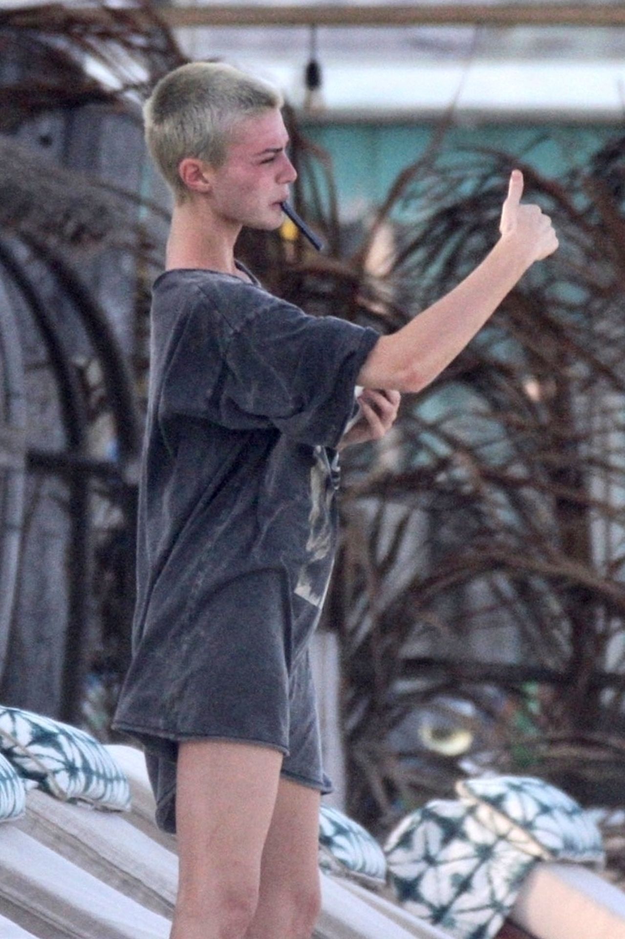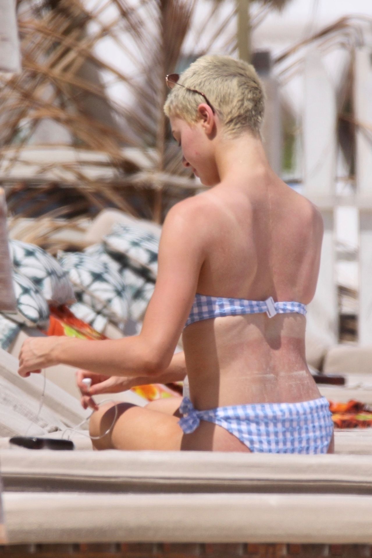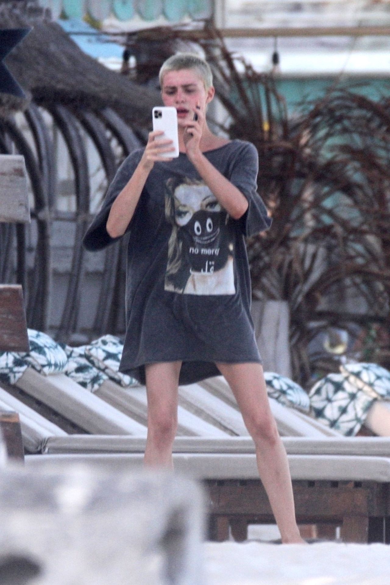 Kirsten sunbathed on a lounge chair and opted to go topless to avoid those harsh unwanted tan lines. Kristen appeared to be taking a few photos with a friend on her cell phone and puffed on a JUUL.