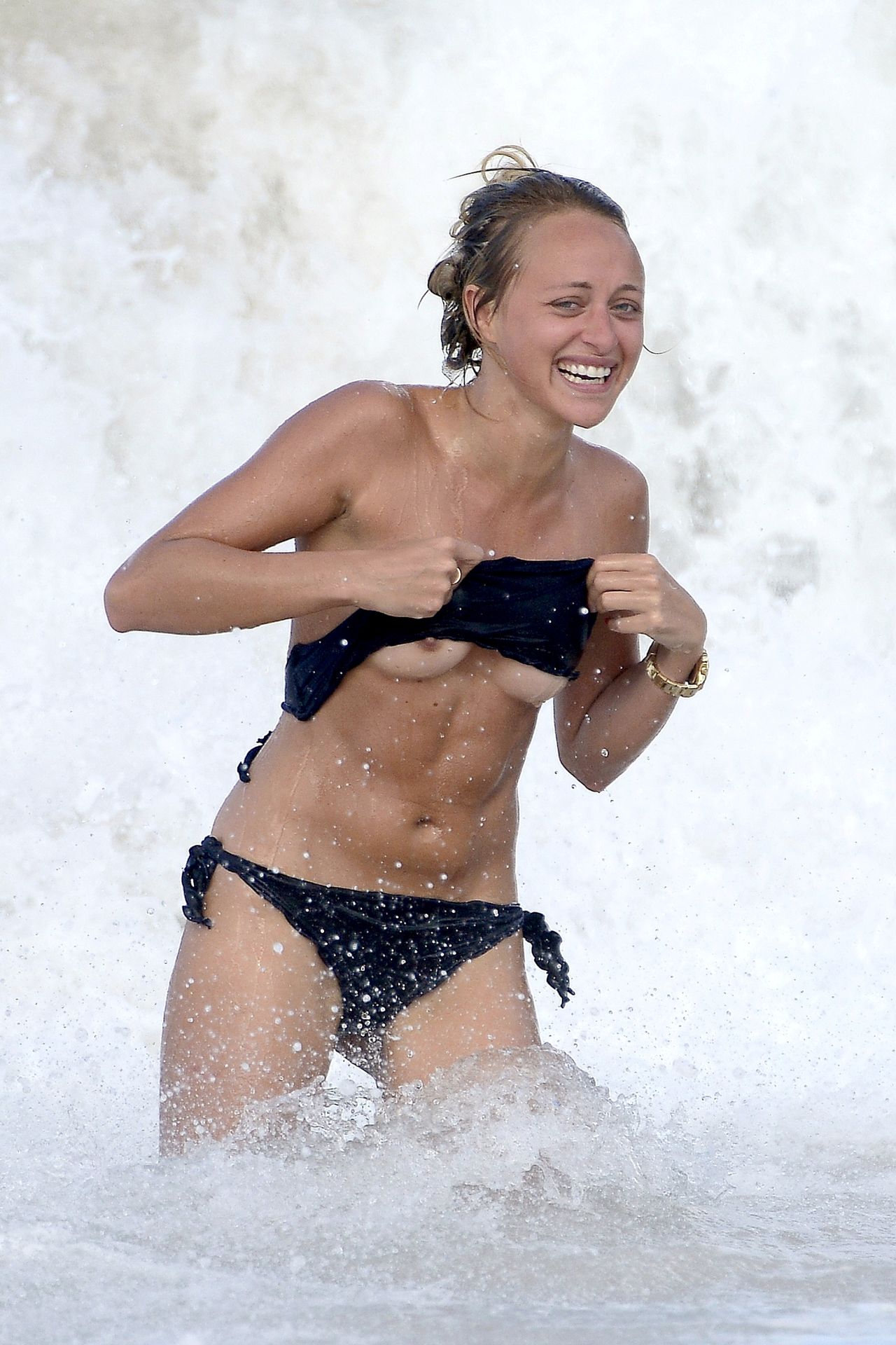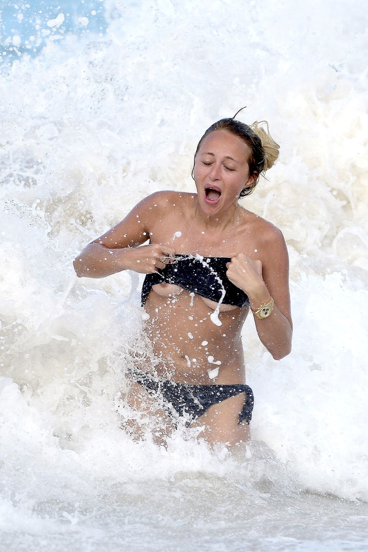 Monaco-based jewelry designer, social media star Lana Scolaro was photographed topless during her vacation on the beach in St Barts, 12/31/2016. Lana gets nailed by a wave that takes her top down.