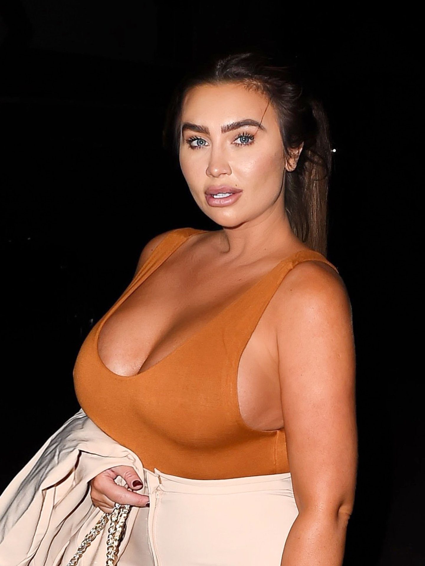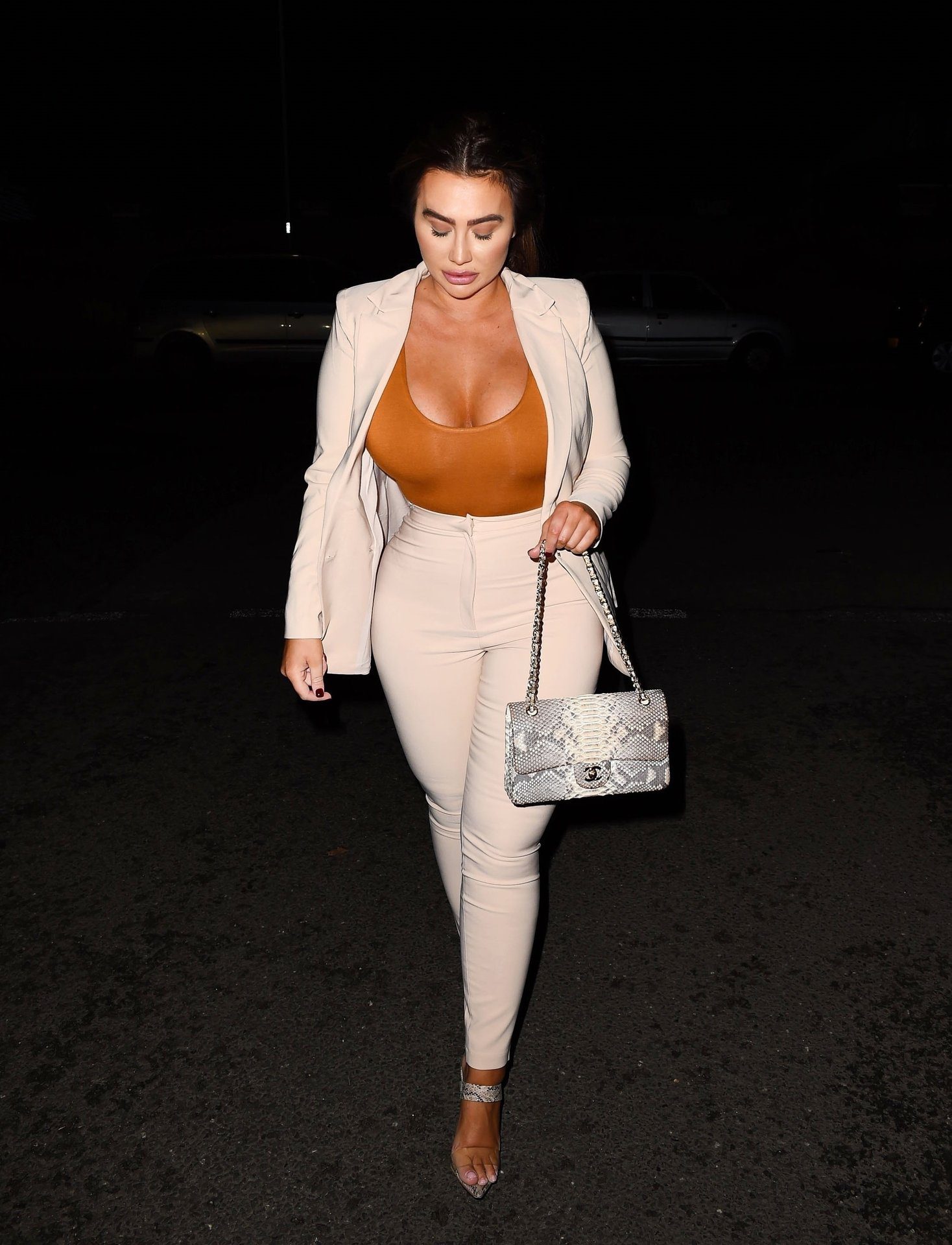 The reality star seemed in good spirits despite her recent scandal regarding diet products. The Essex girl shows off her curvy bum in a white suit with a brown top as she makes her way to the restaurant.