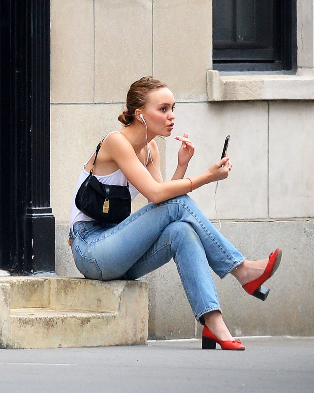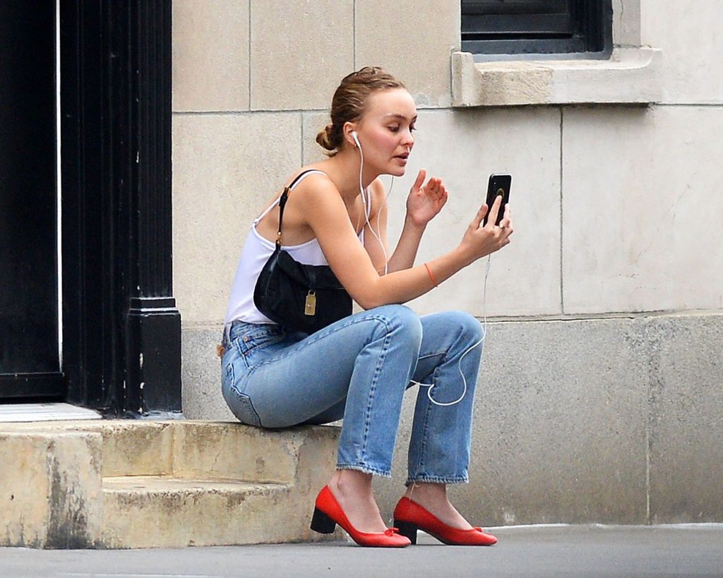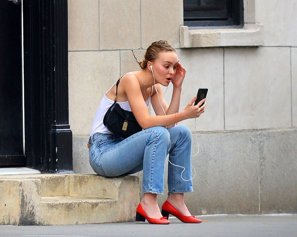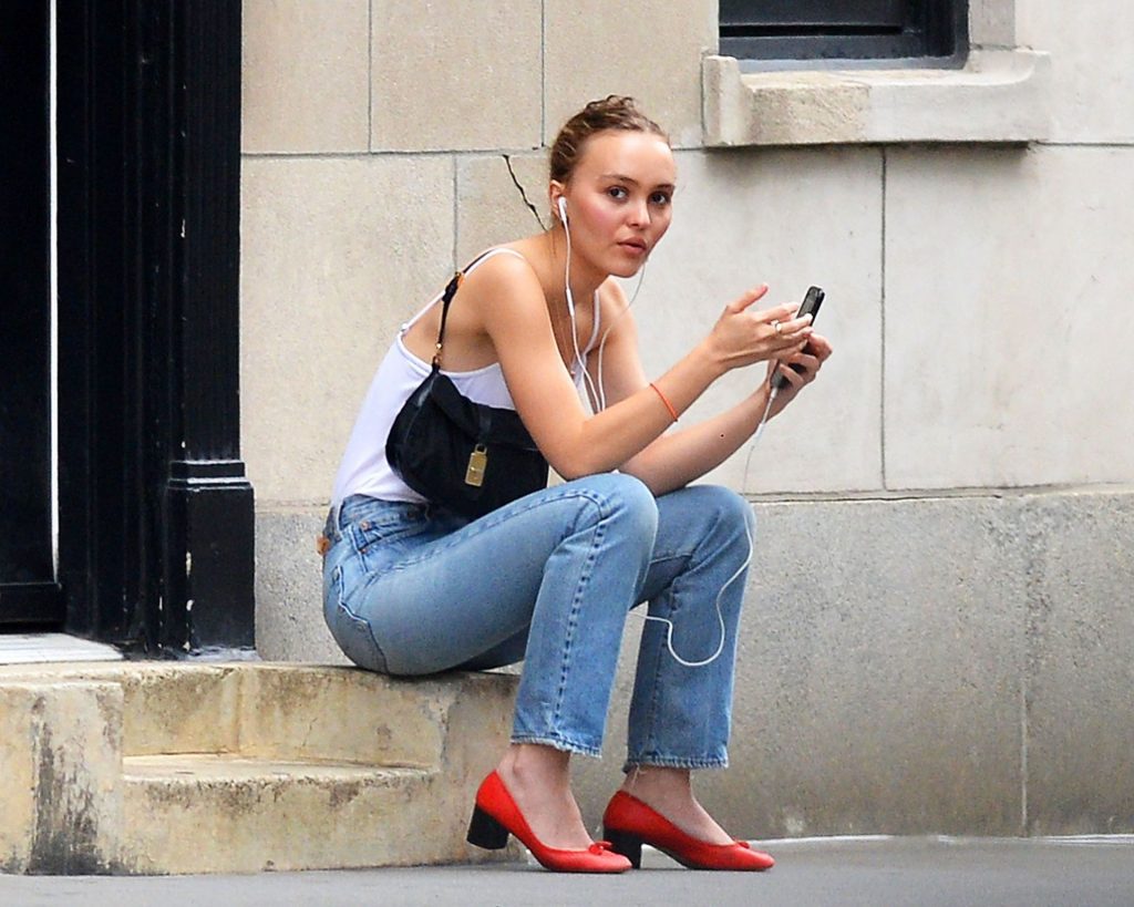 Lily-Rose Depp was spotted in New York City, 09/16/2019. The 20-year-old actress and model wore a white bodysuit without a bra, high waist jeans, and red heels.