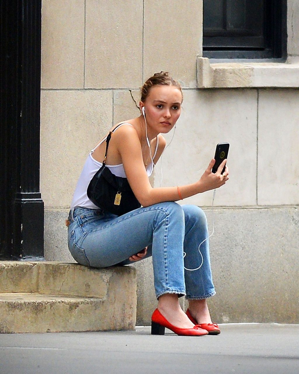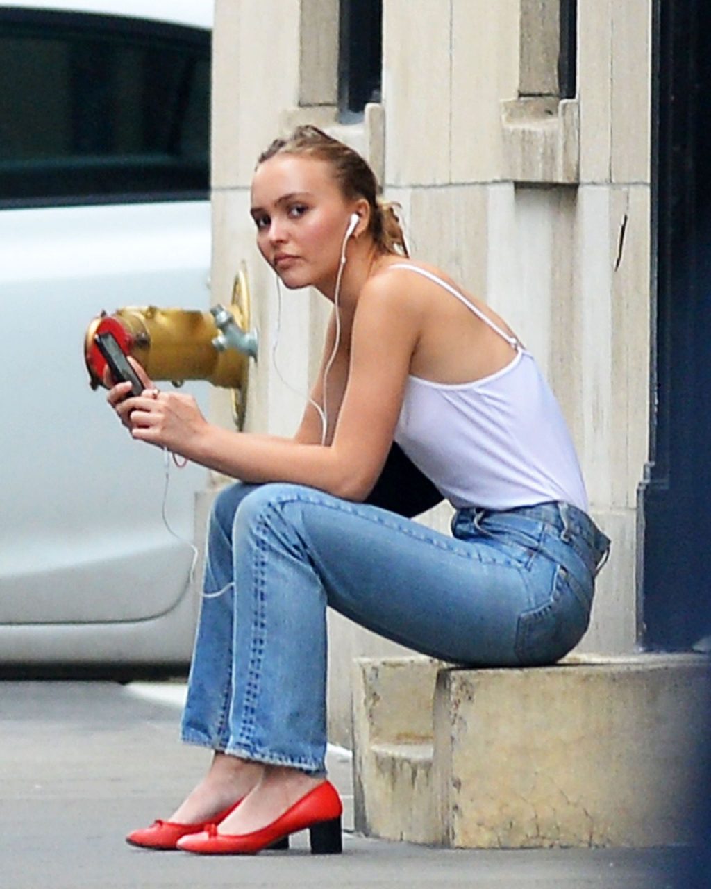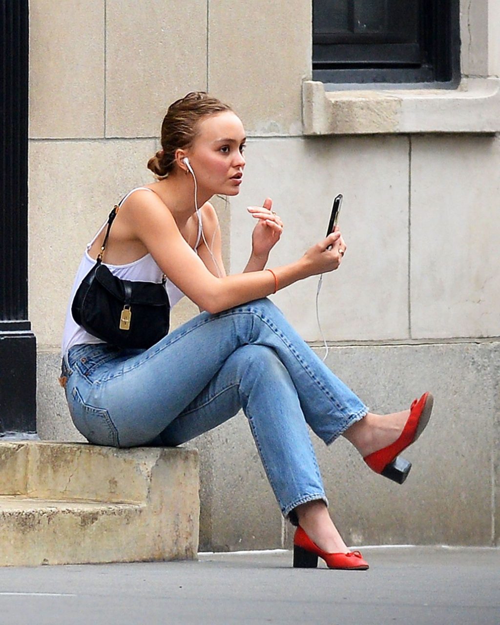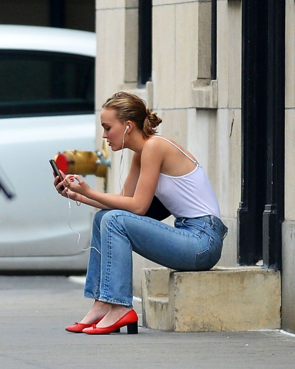 Lily-Rose Depp was spotted in New York City, 09/16/2019. The 20-year-old actress and model wore a white bodysuit without a bra, high waist jeans, and red heels.