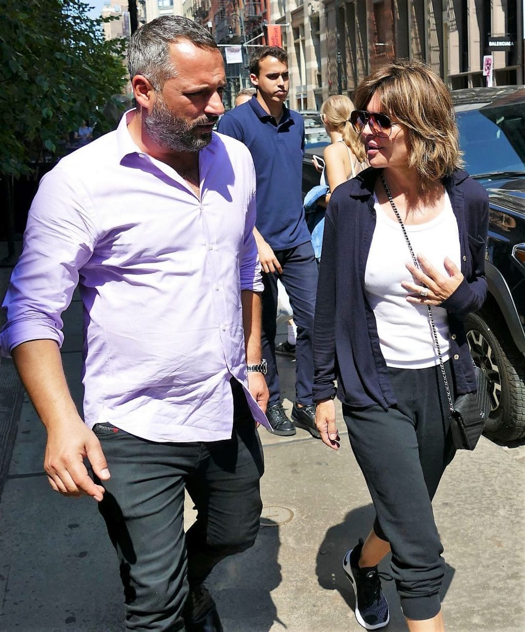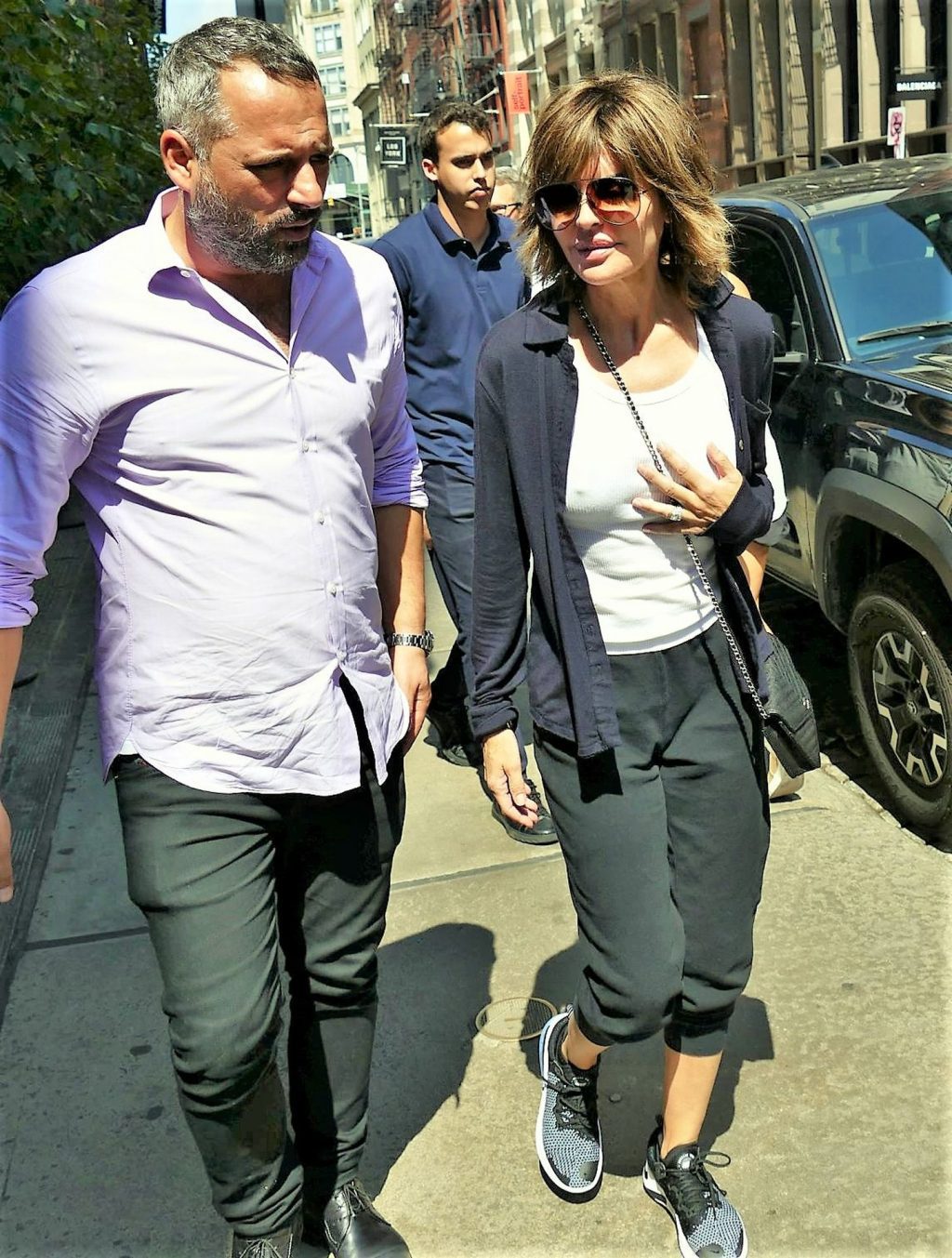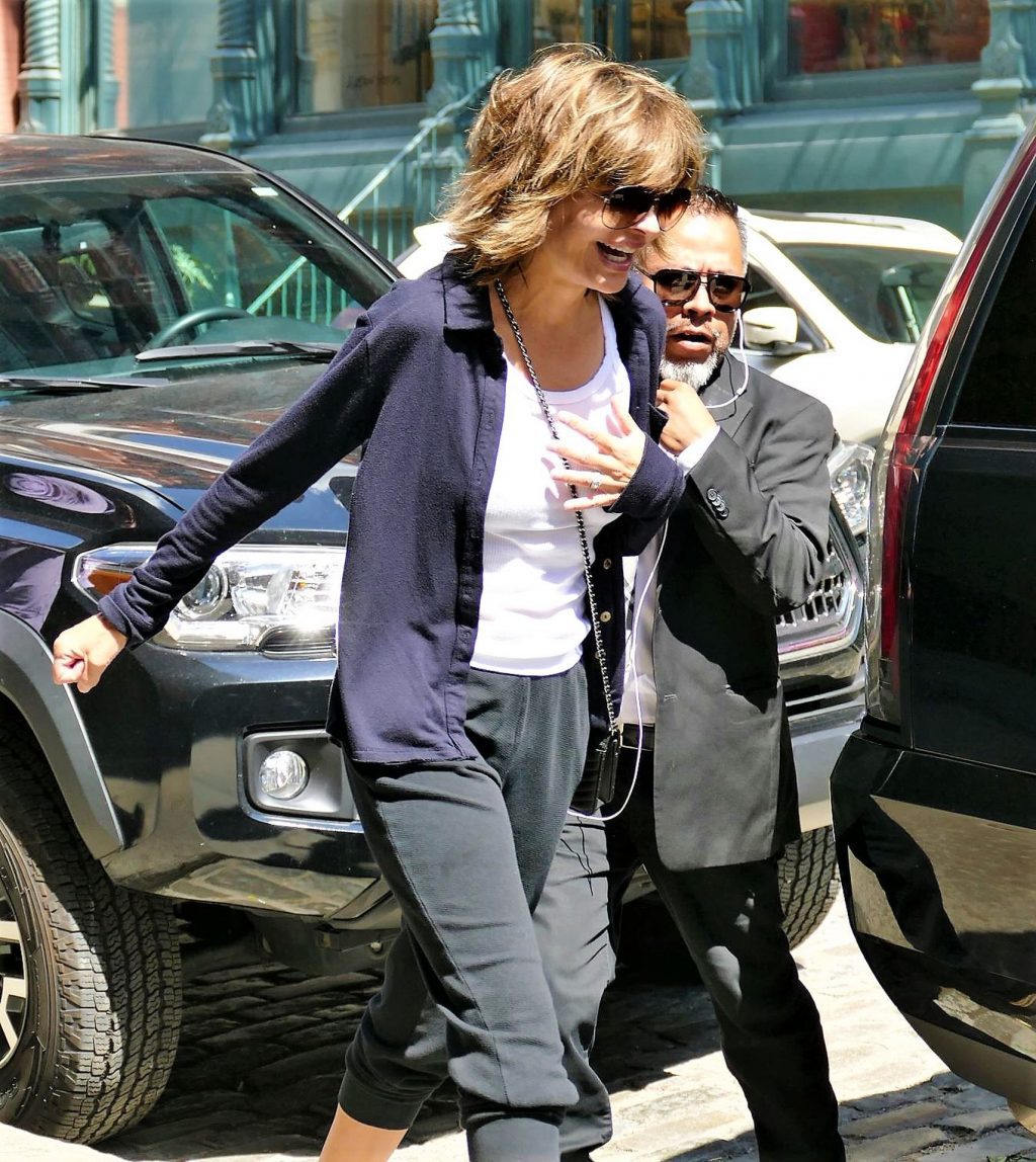 Lovely Lisa Rinna was seen braless under white top worn with jogging suit – New York, 08/17/2019.