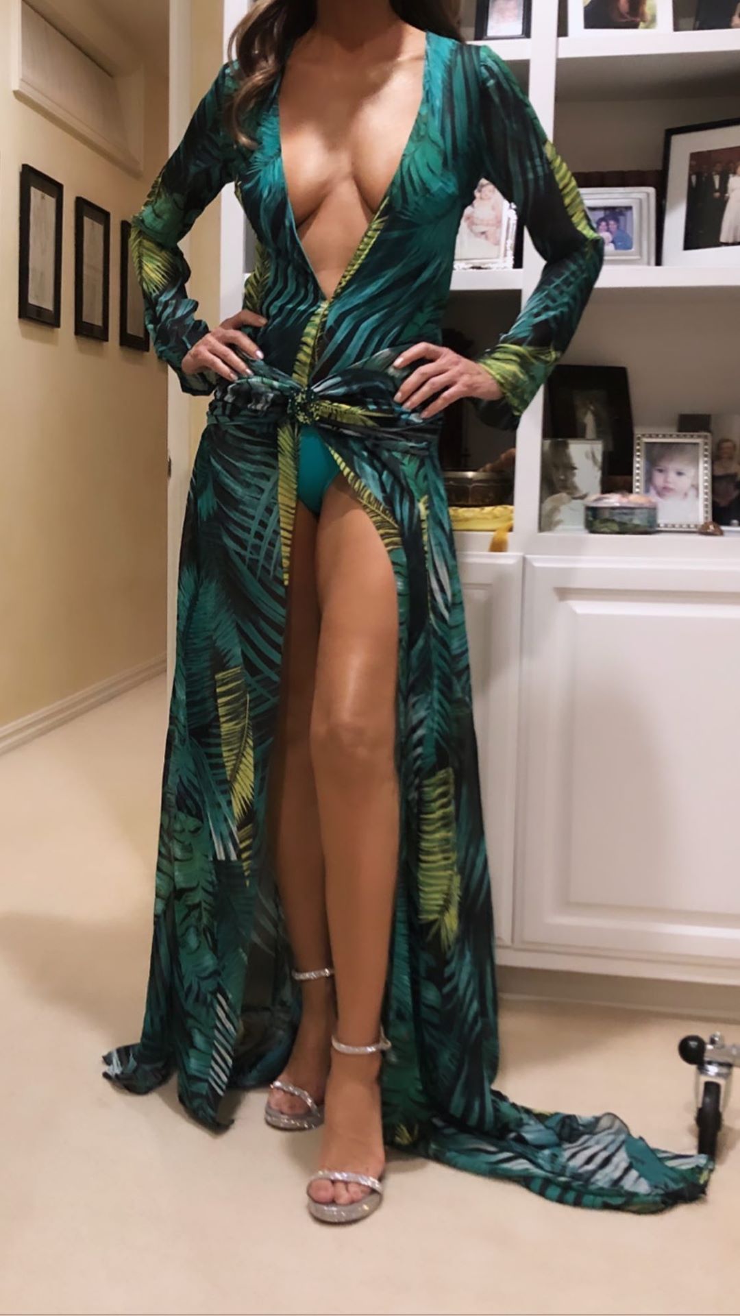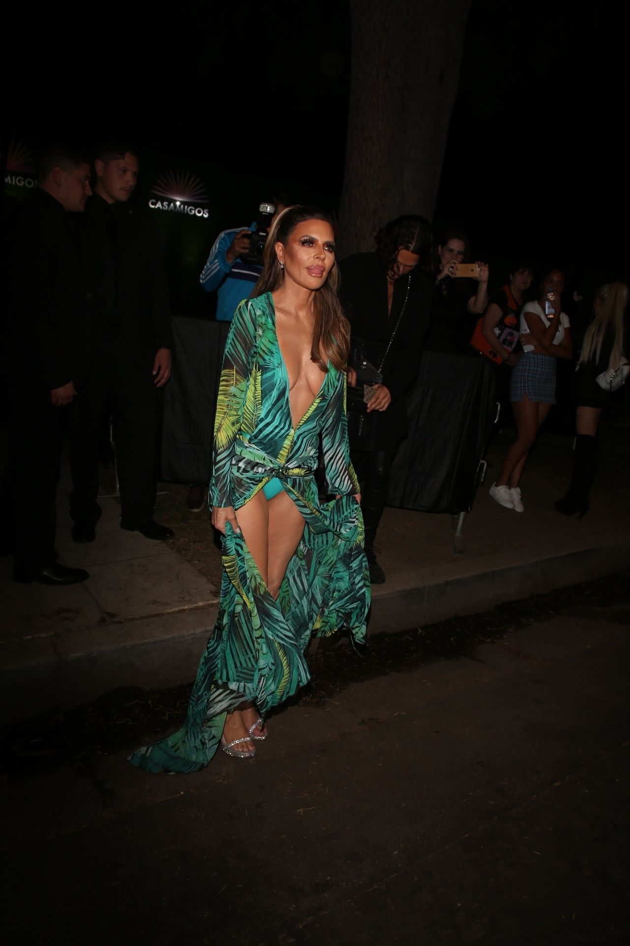 Leggy reality star Lisa Rinna goes as JLo, wearing a green dress with a deep cleavage, showing her panties for the Casamigos Halloween Party in Beverly Hills, 10/25/2019.