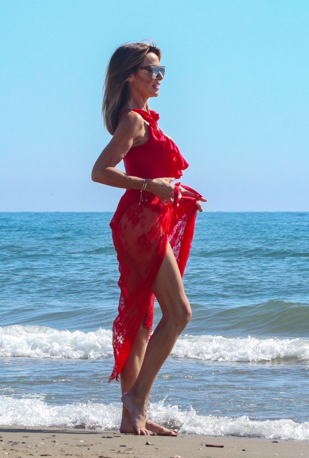 TV personality Lizzie Cundy was pictured showing off her beach body while having fun on the beach during a sunshine break in Marbella, 10/06/2019. The former Wag was seen looking relaxed as she channeled her inner Baywatch while pictured relaxing on the beach in a bright red swimsuit.