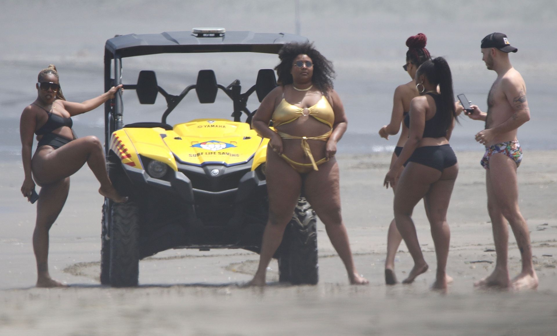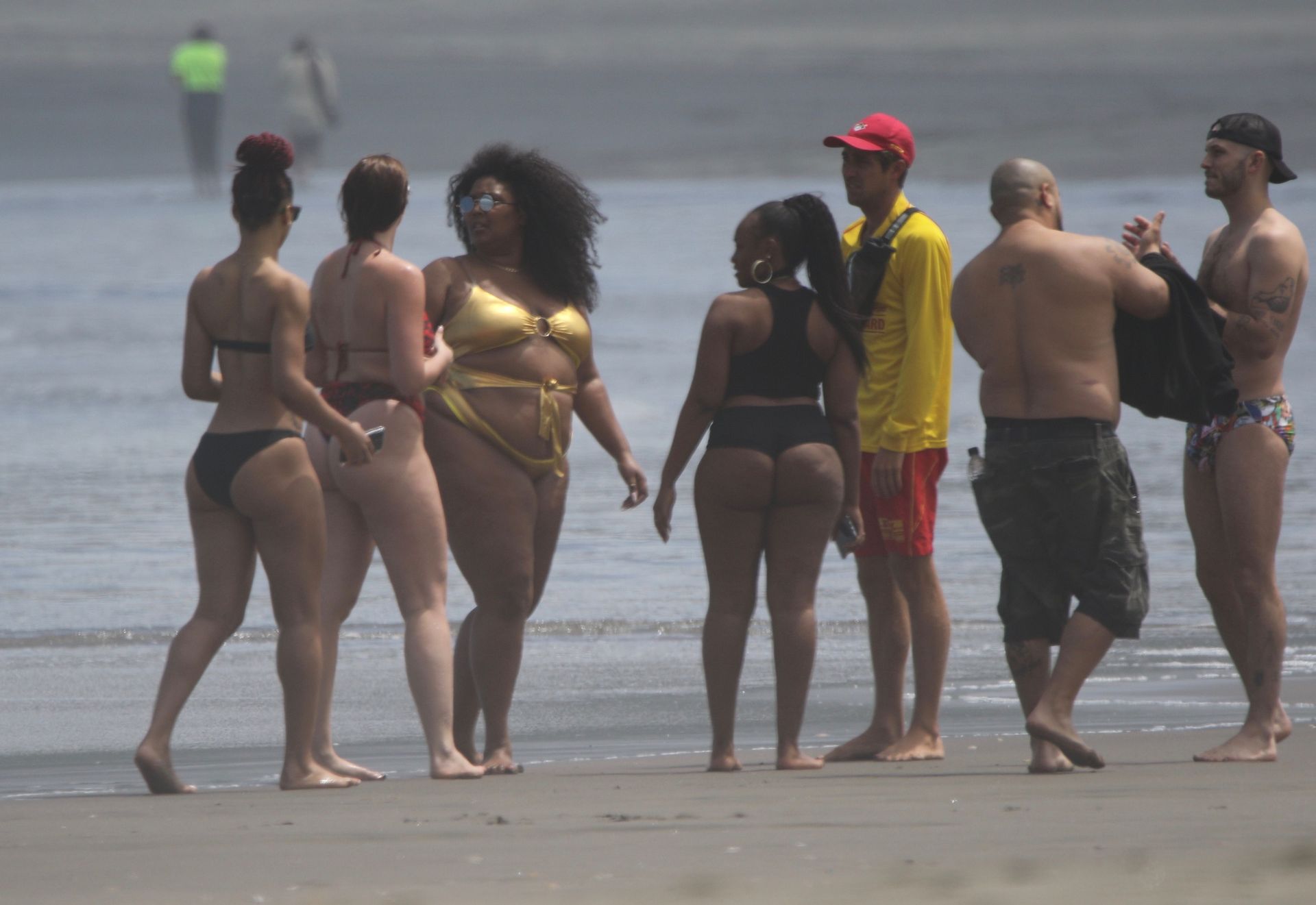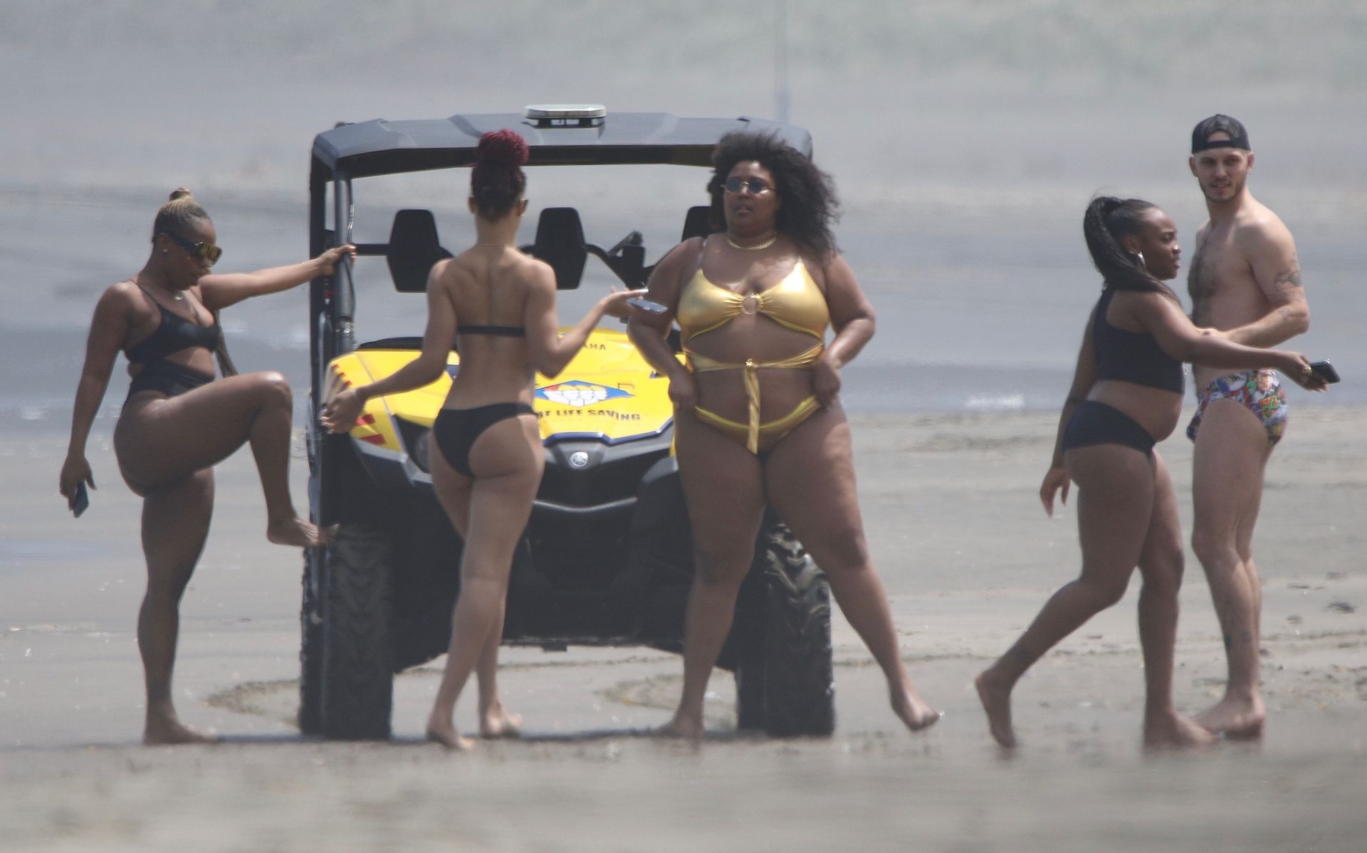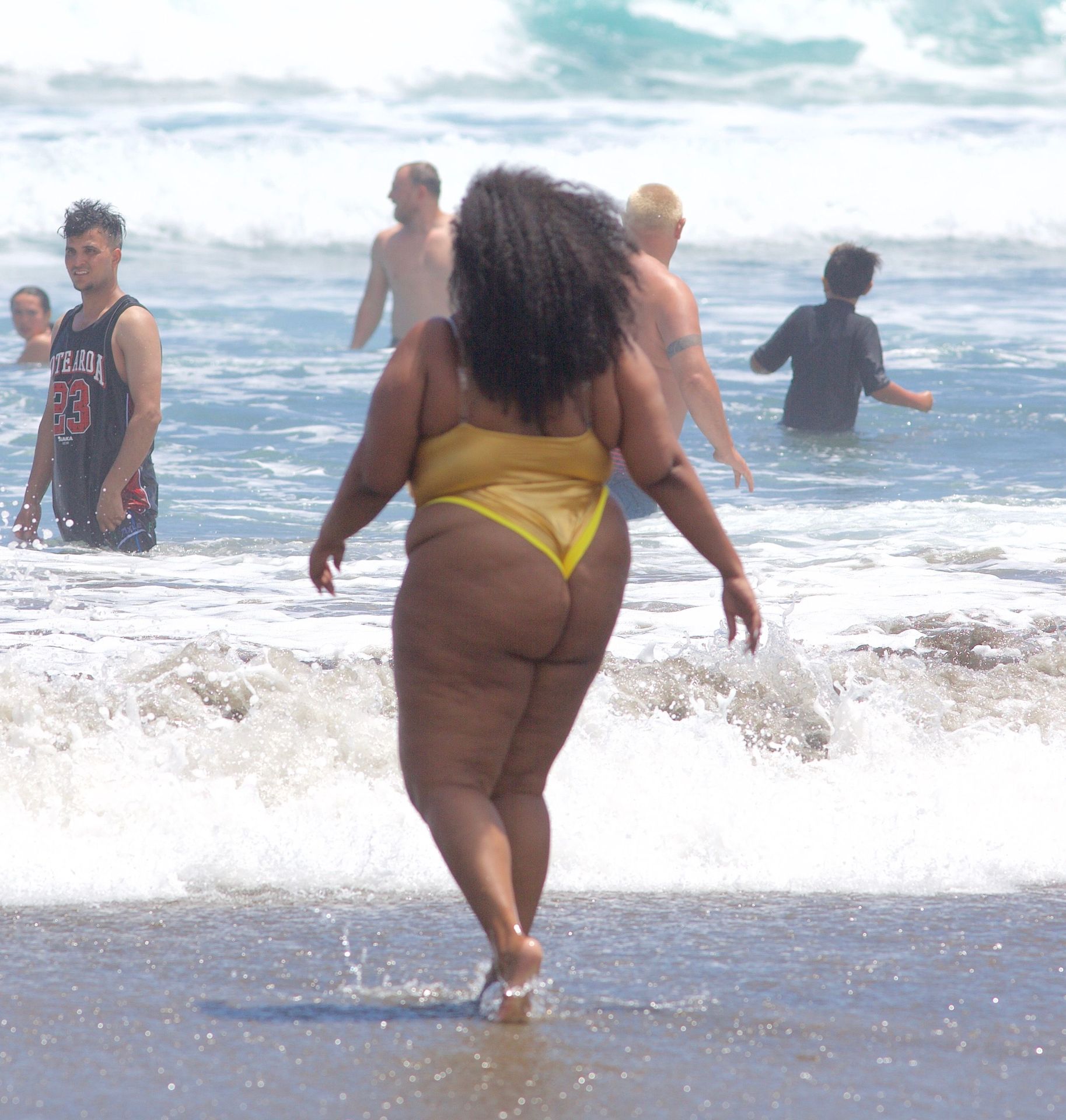 Lizzo shows off her bikini body in a tiny metallic gold one piece whilst with her entourage at Piha, a famous surf beach in Auckland, 01/15/2020.
