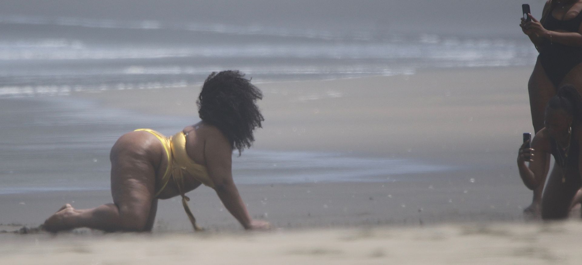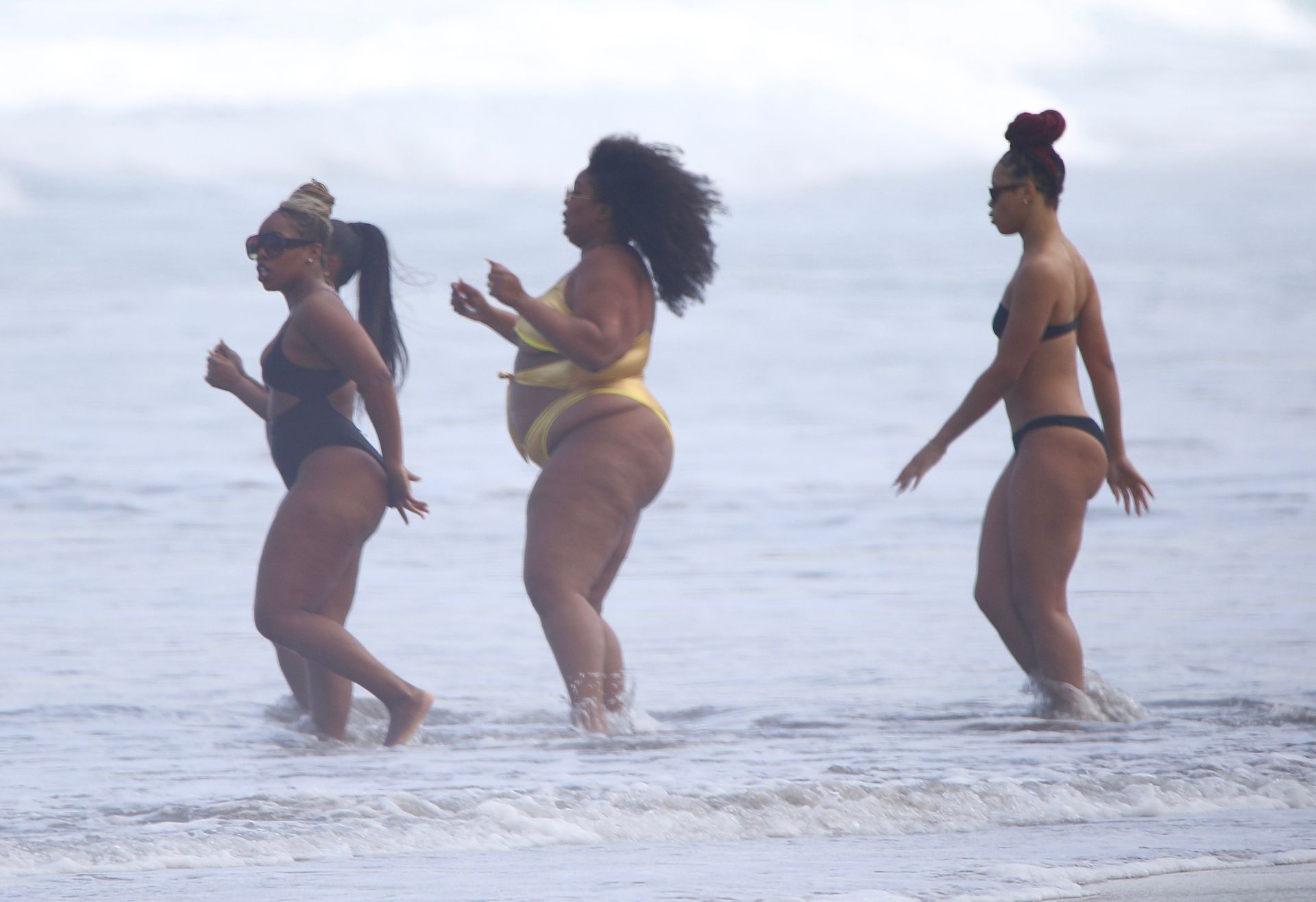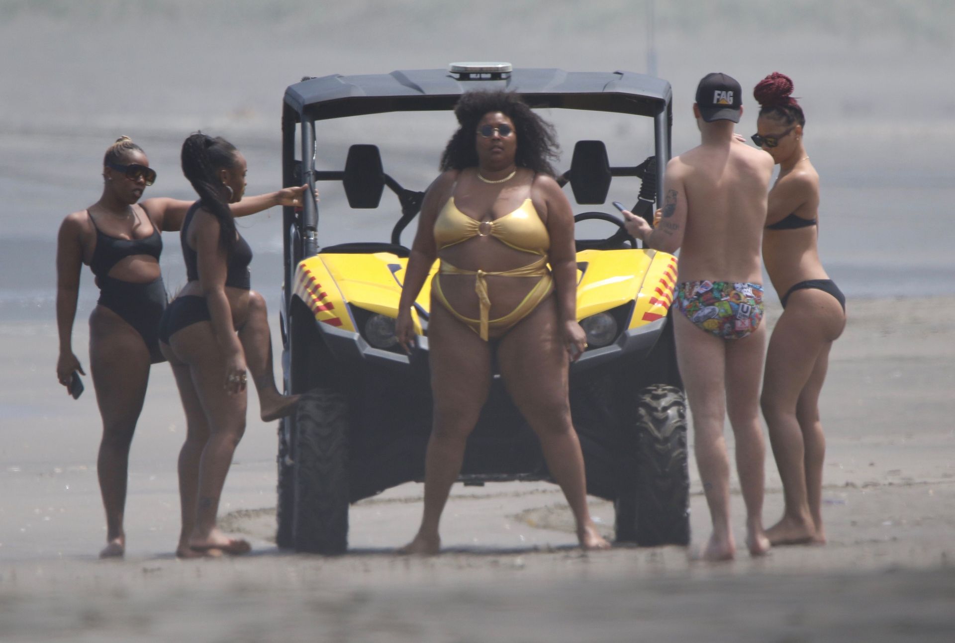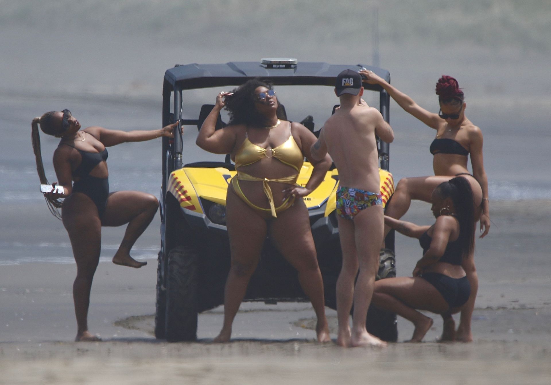 Lizzo shows off her bikini body in a tiny metallic gold one piece whilst with her entourage at Piha, a famous surf beach in Auckland, 01/15/2020.