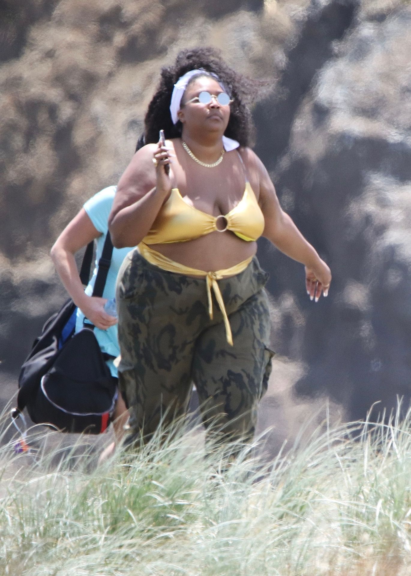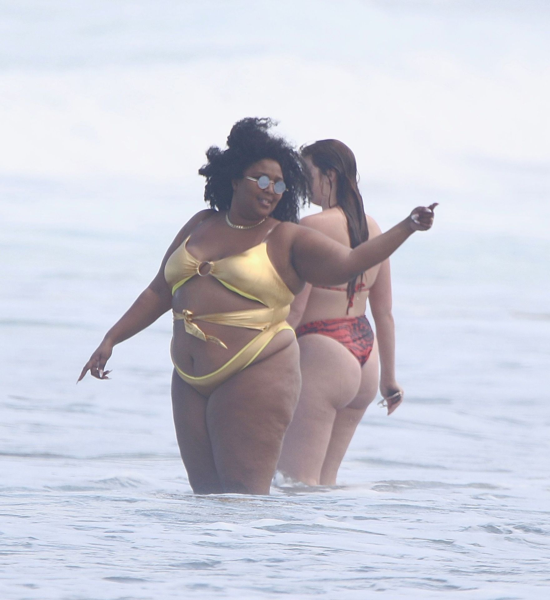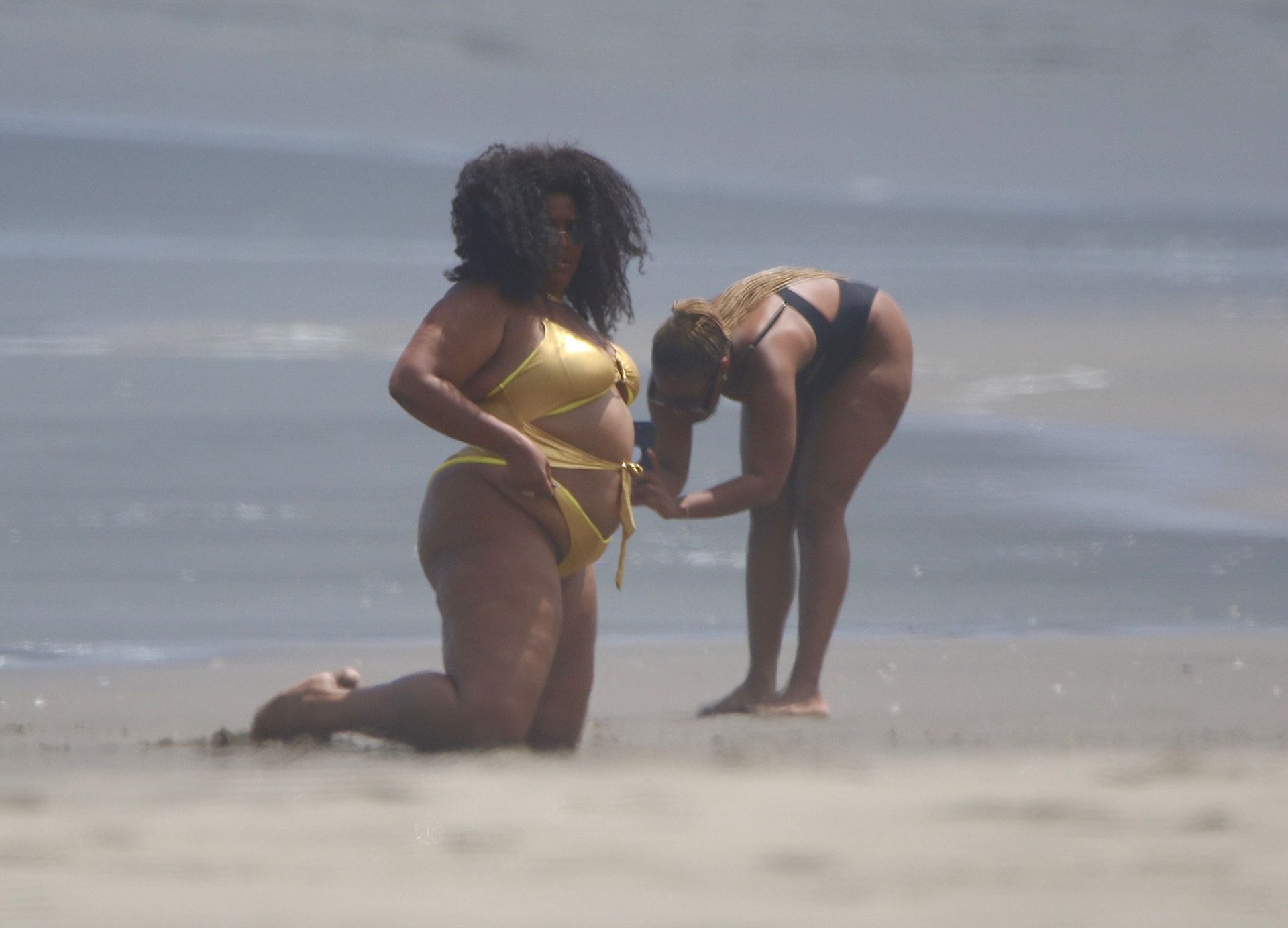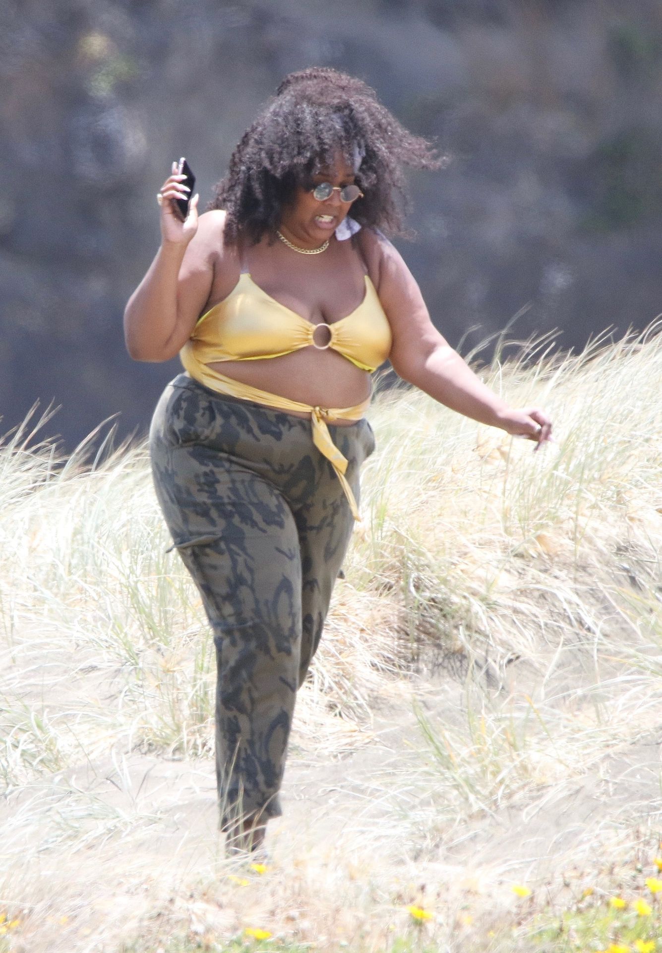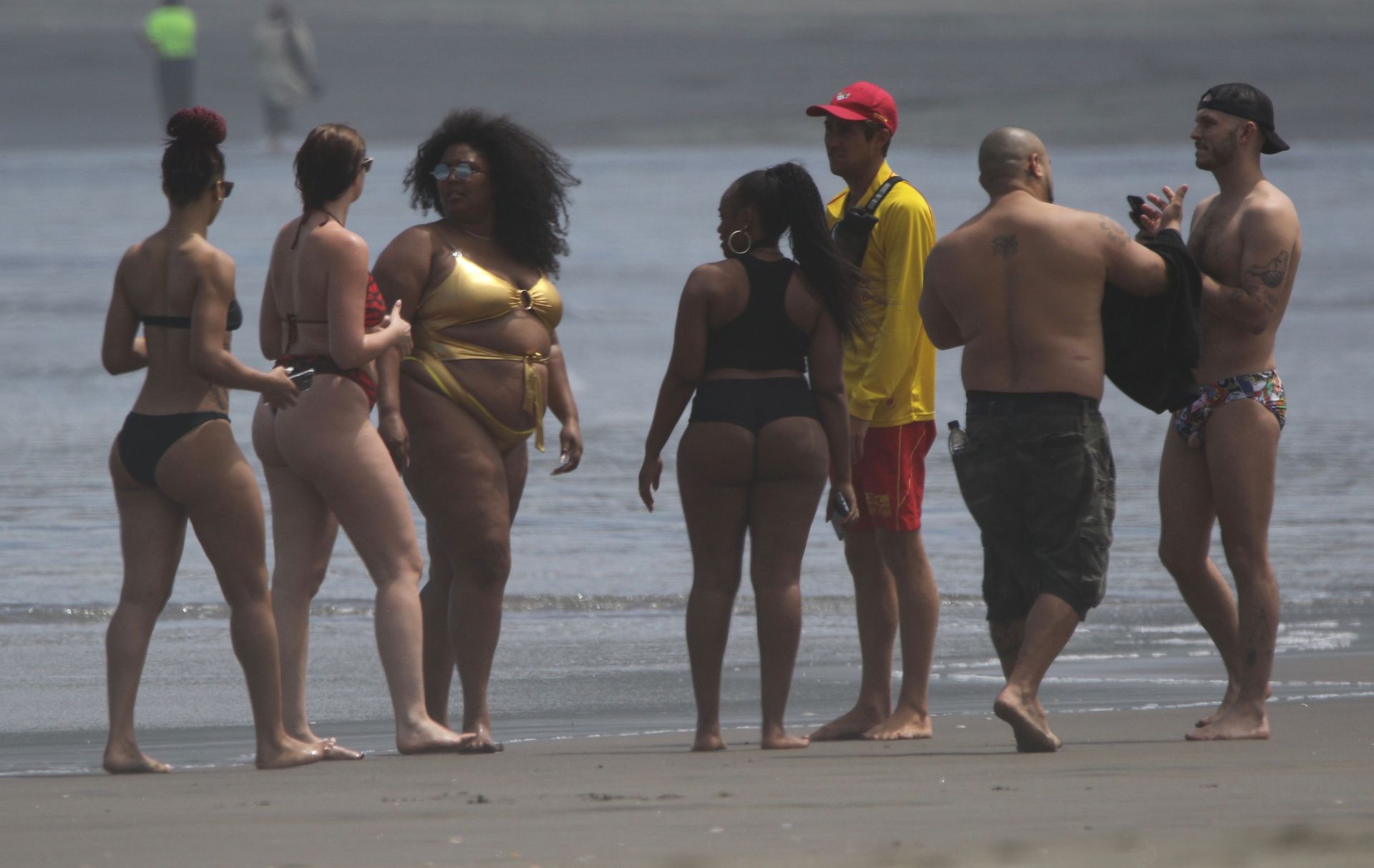 Lizzo shows off her bikini body in a tiny metallic gold one piece whilst with her entourage at Piha, a famous surf beach in Auckland, 01/15/2020.