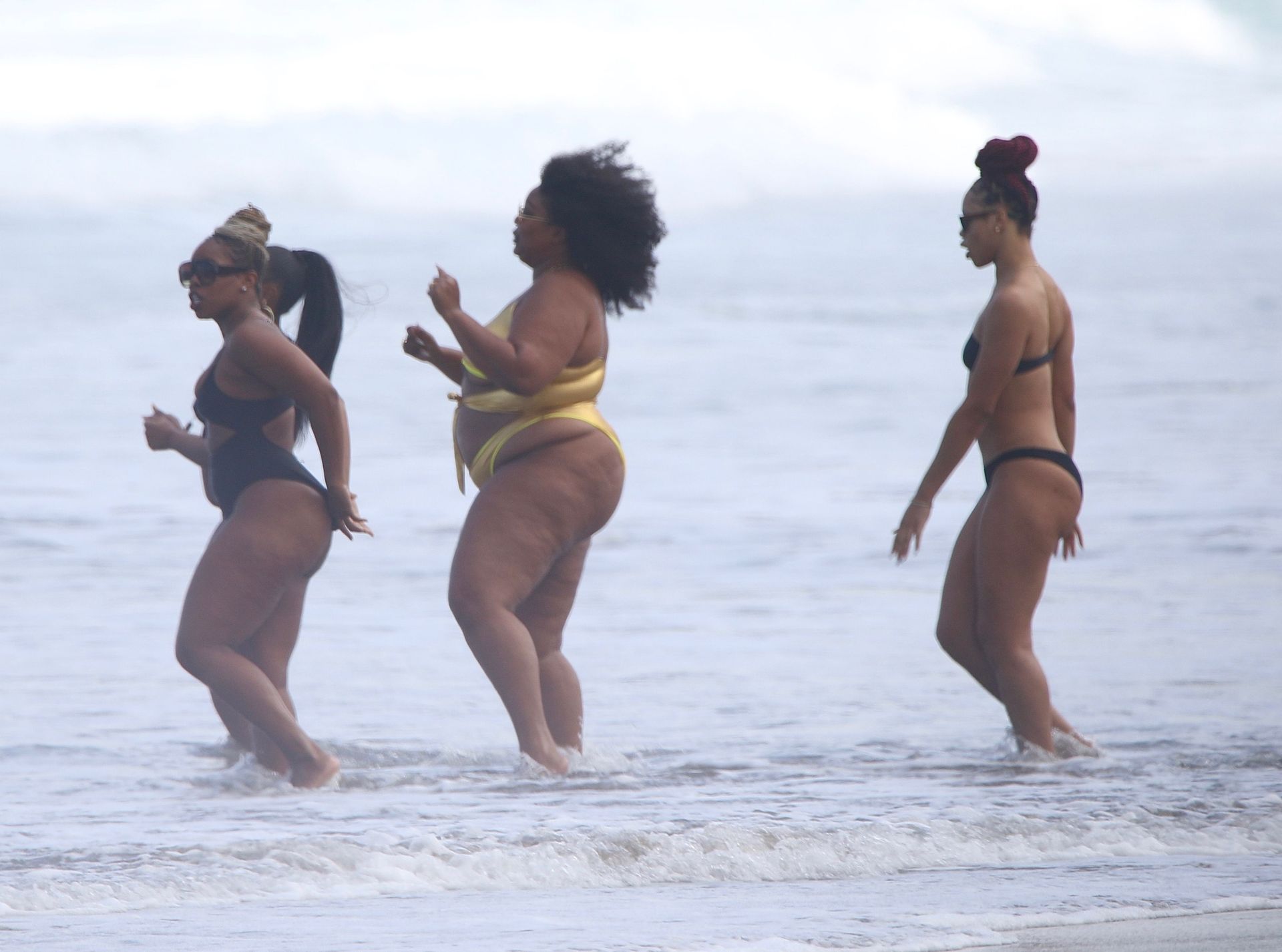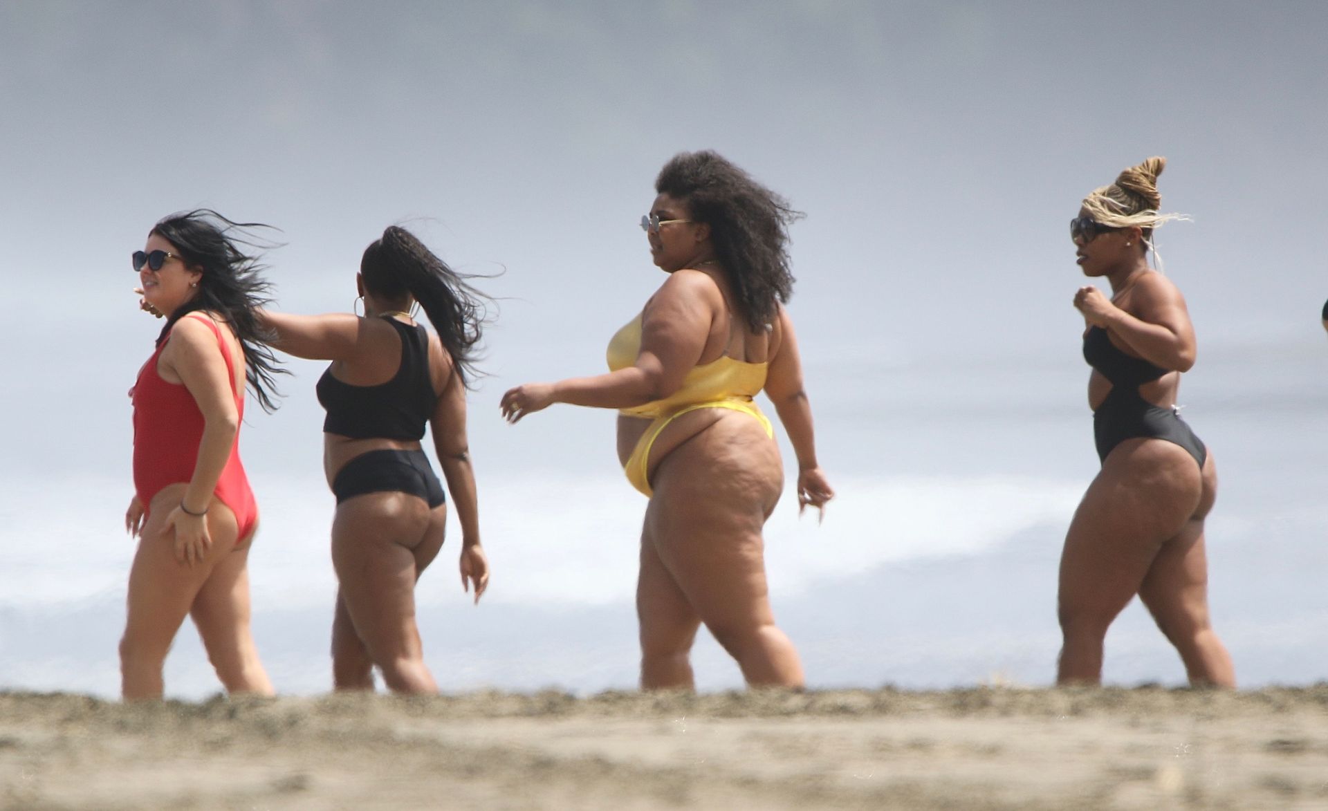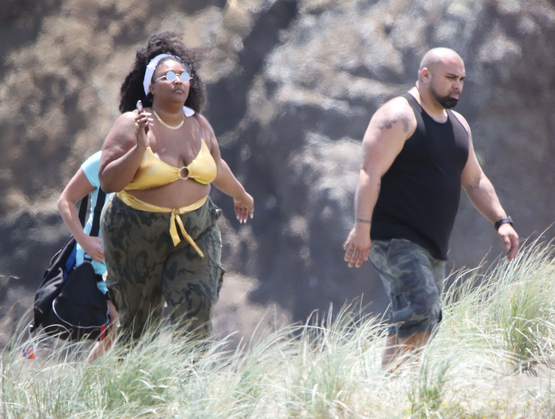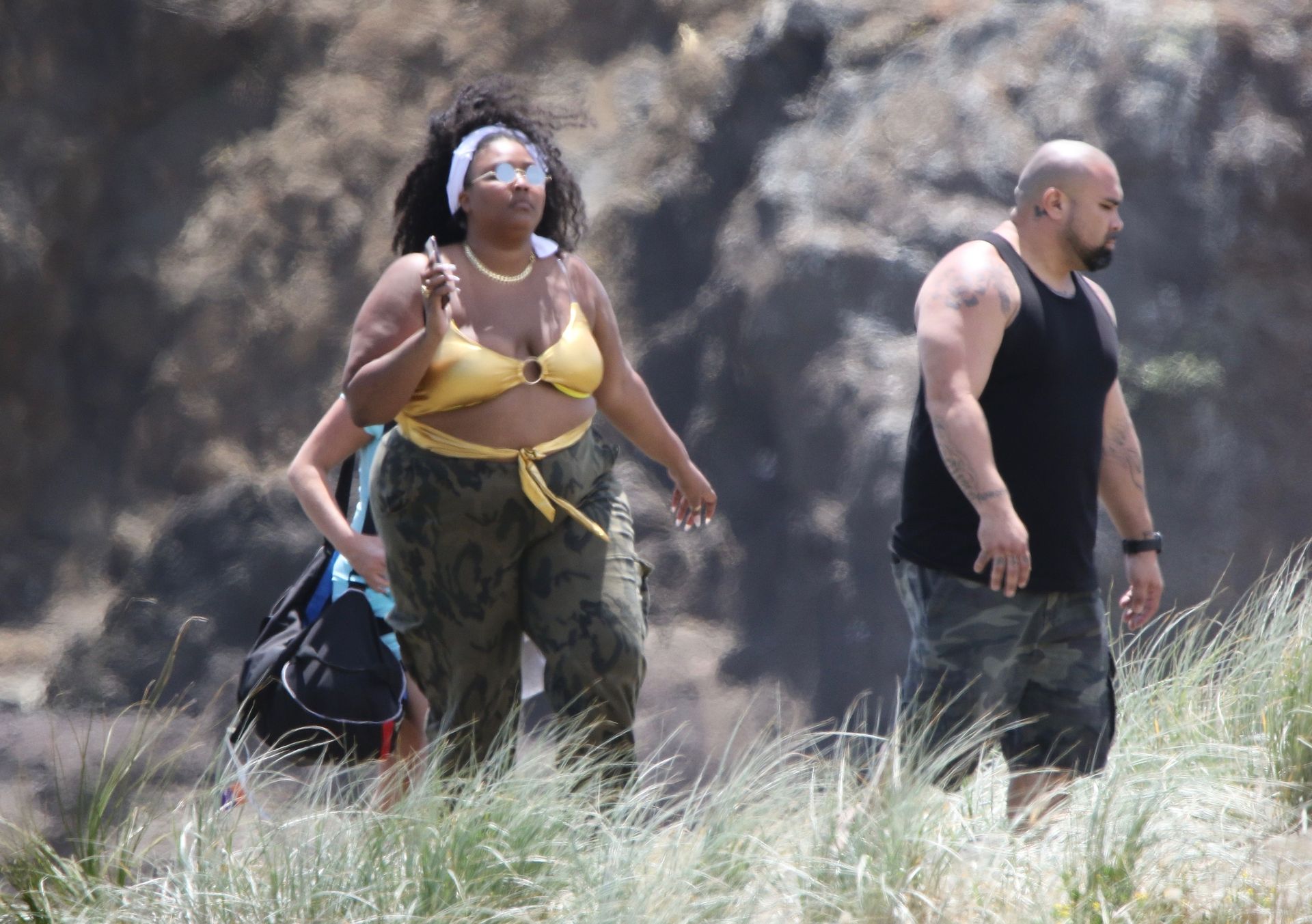 Lizzo shows off her bikini body in a tiny metallic gold one piece whilst with her entourage at Piha, a famous surf beach in Auckland, 01/15/2020.