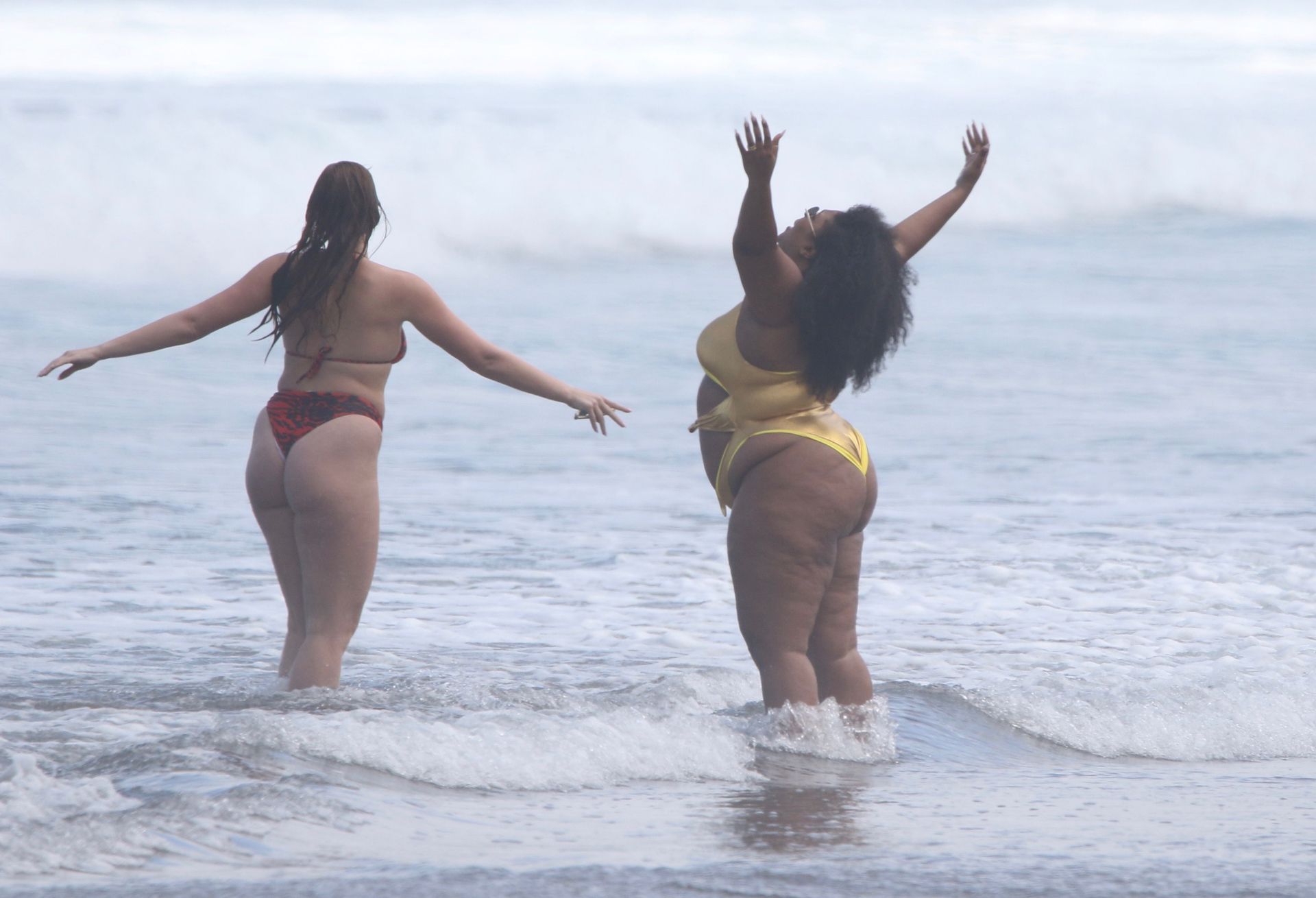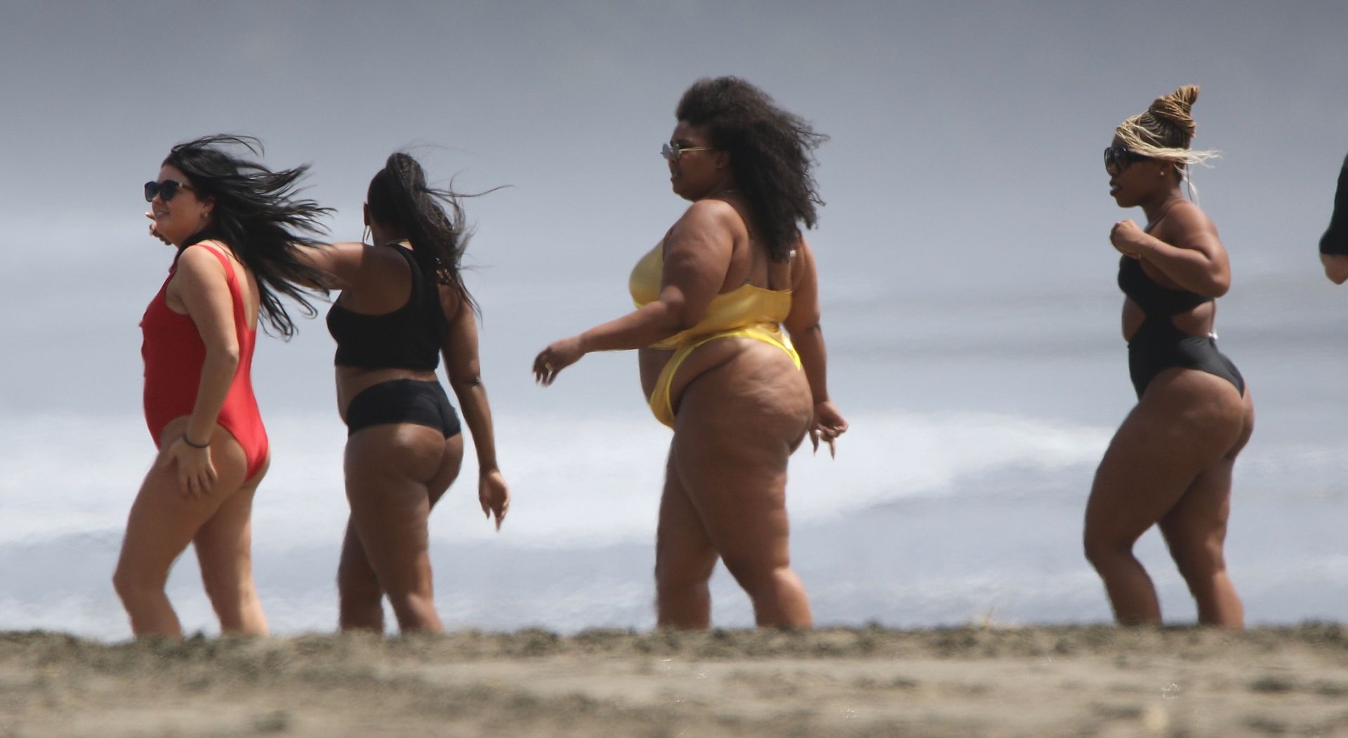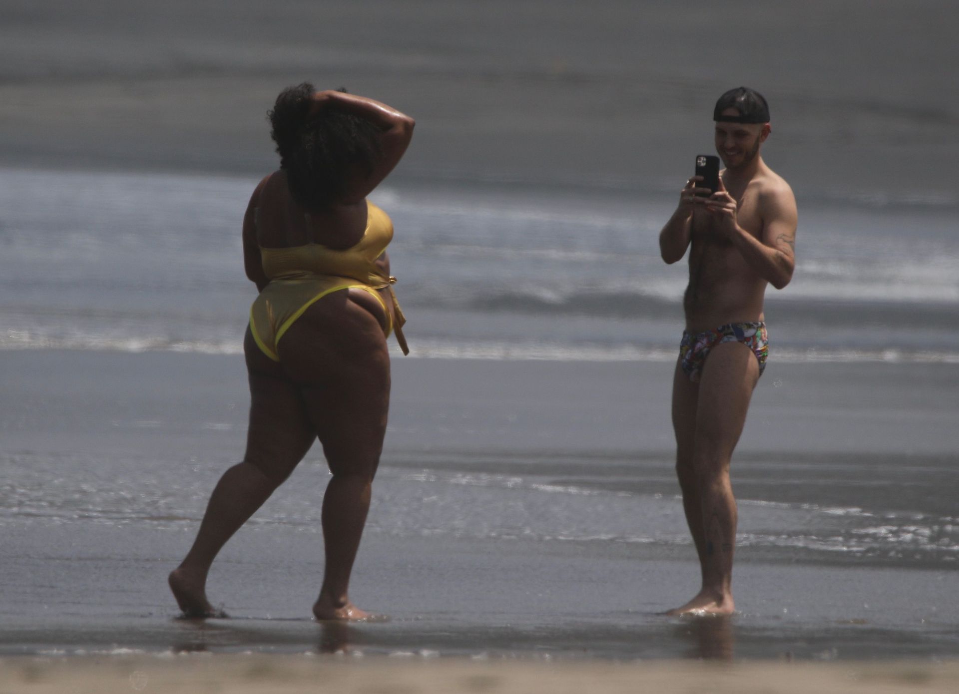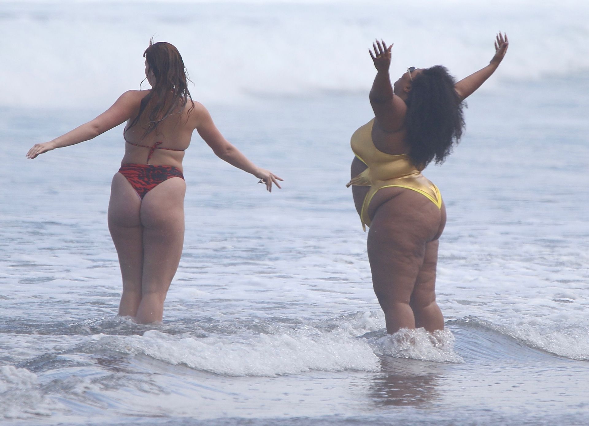 Lizzo shows off her bikini body in a tiny metallic gold one piece whilst with her entourage at Piha, a famous surf beach in Auckland, 01/15/2020.