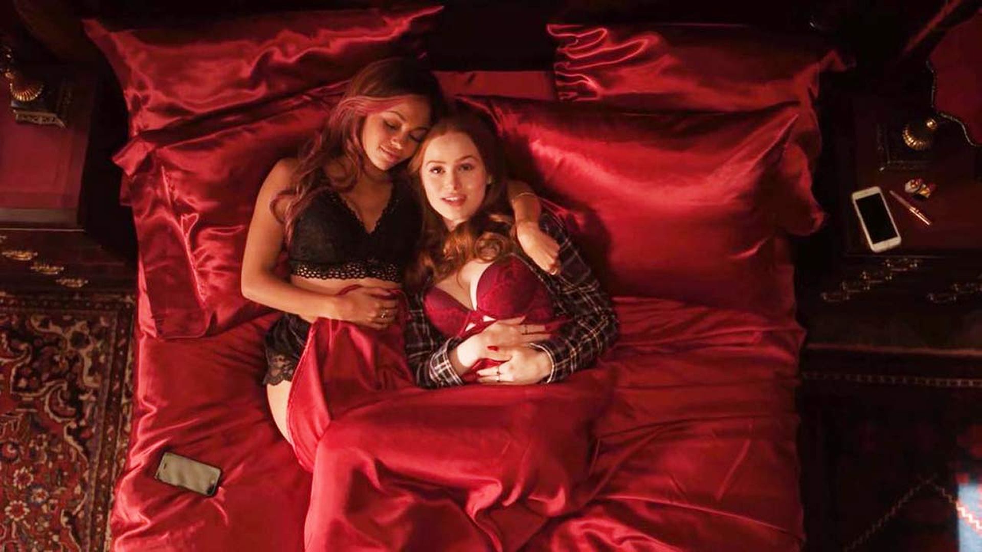 Watch the hot scene of two sexy actresses Madelaine Petsch and Ashleigh Murray lesbian kiss from “Riverdale” (2019) Season 3 Episode 12 (s03e12), where gorgeous redhead Madelaine Petsch is seen showing her cleavage in a red bra, and Ashleigh Murray wearing black lingerie in bed.