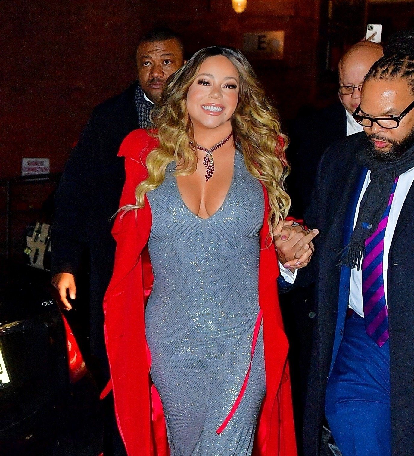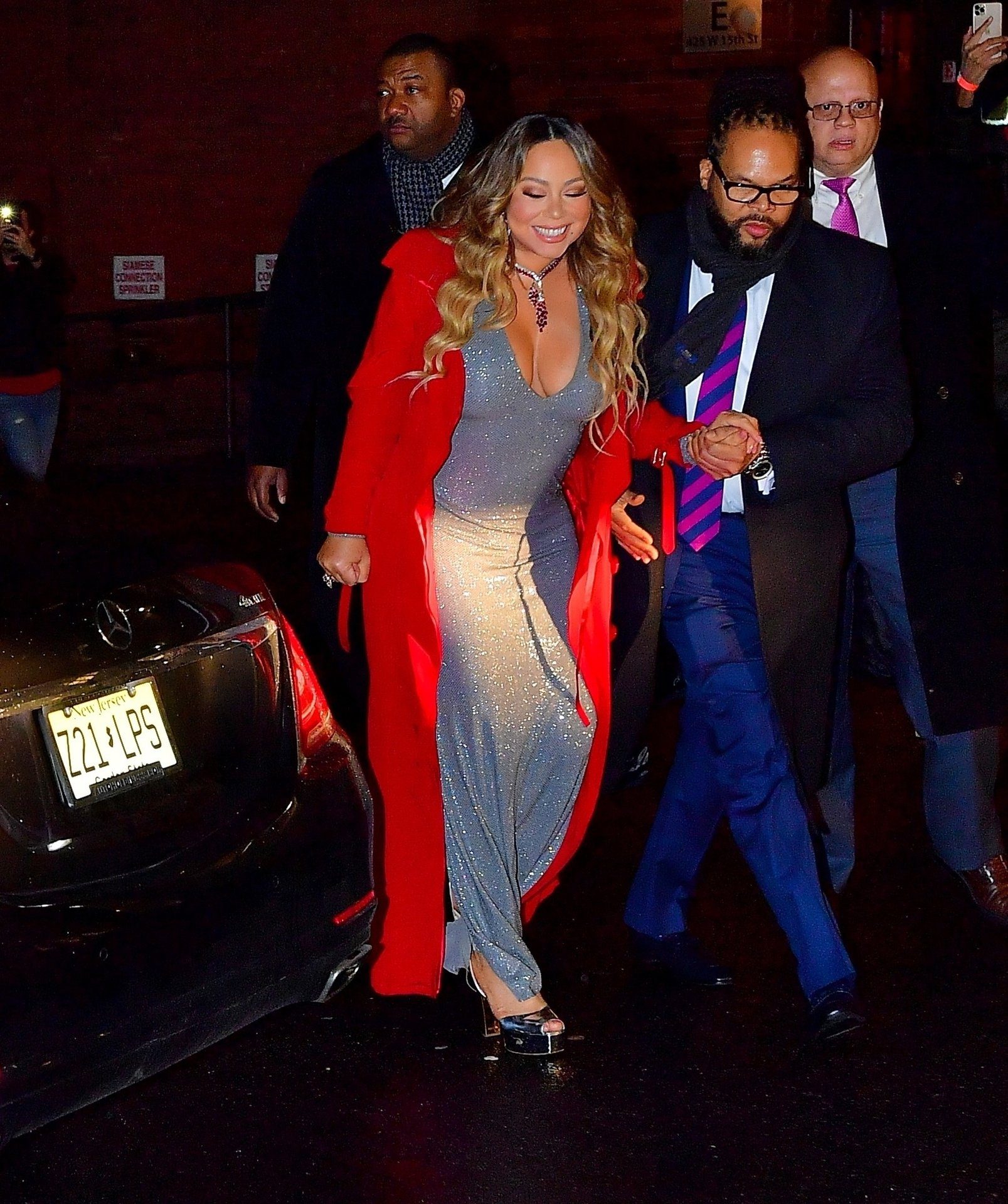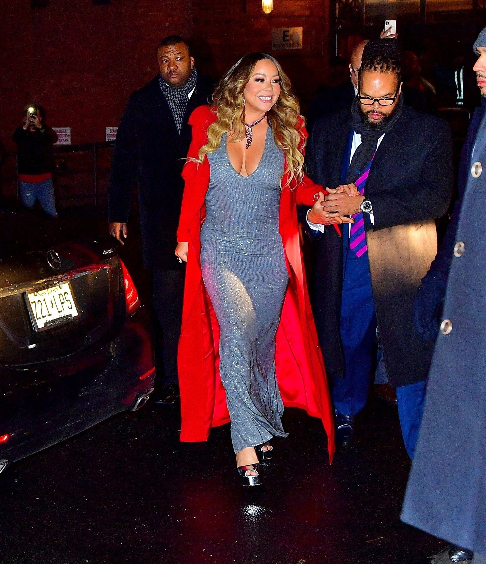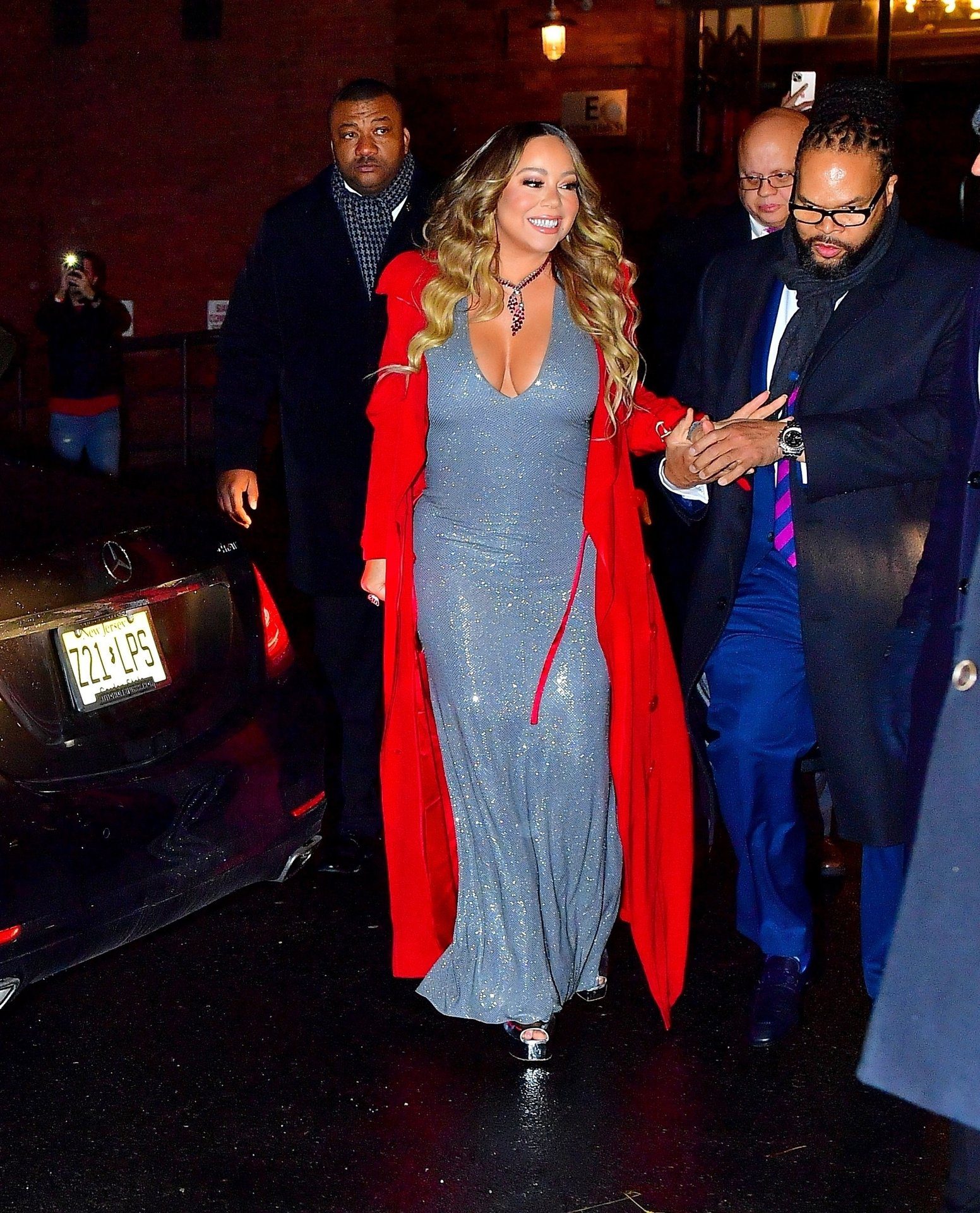 Festive Mariah Carey steps out in a silver gown and red overcoat to celebrate the 25th Anniversary of her hit holiday song “All I Want For Christmas Is You” in New York, 12/17/2019.