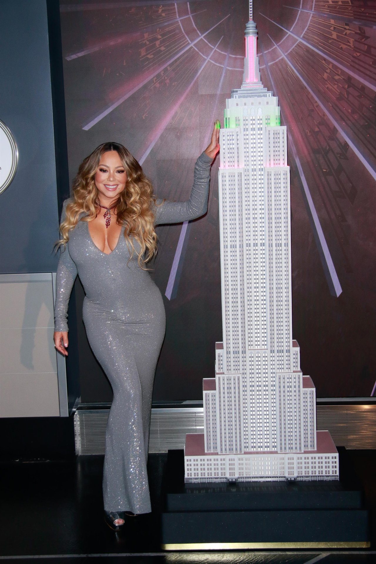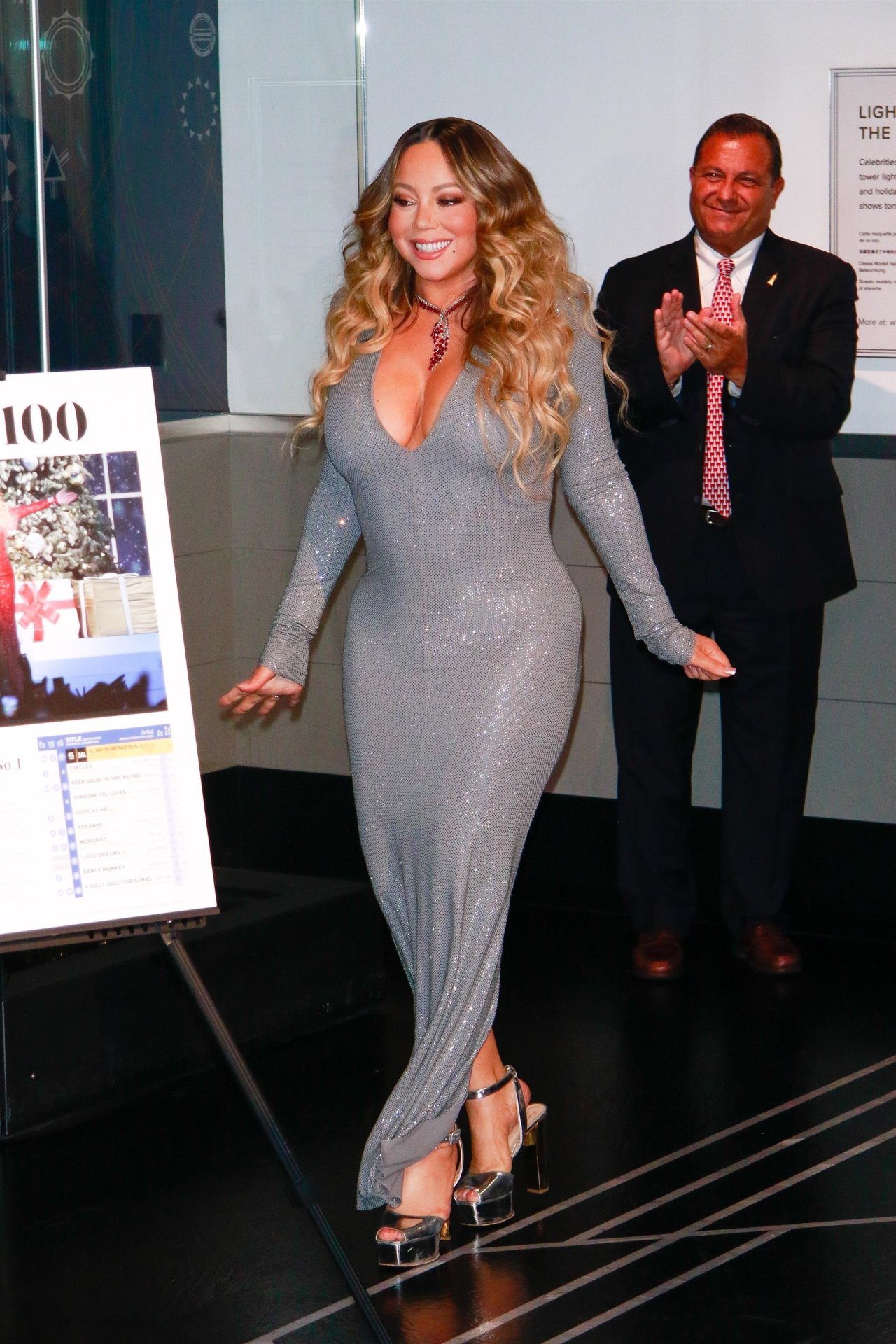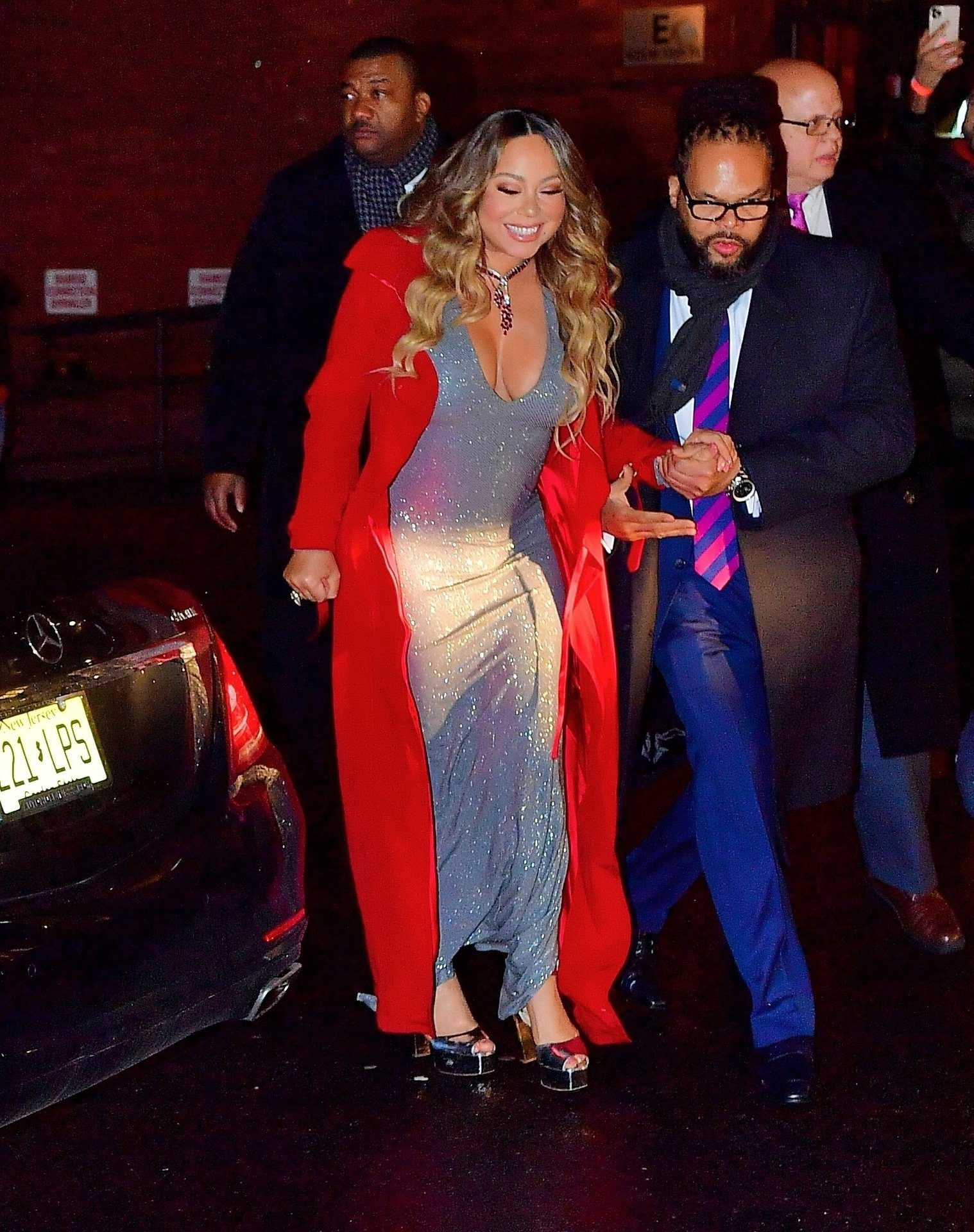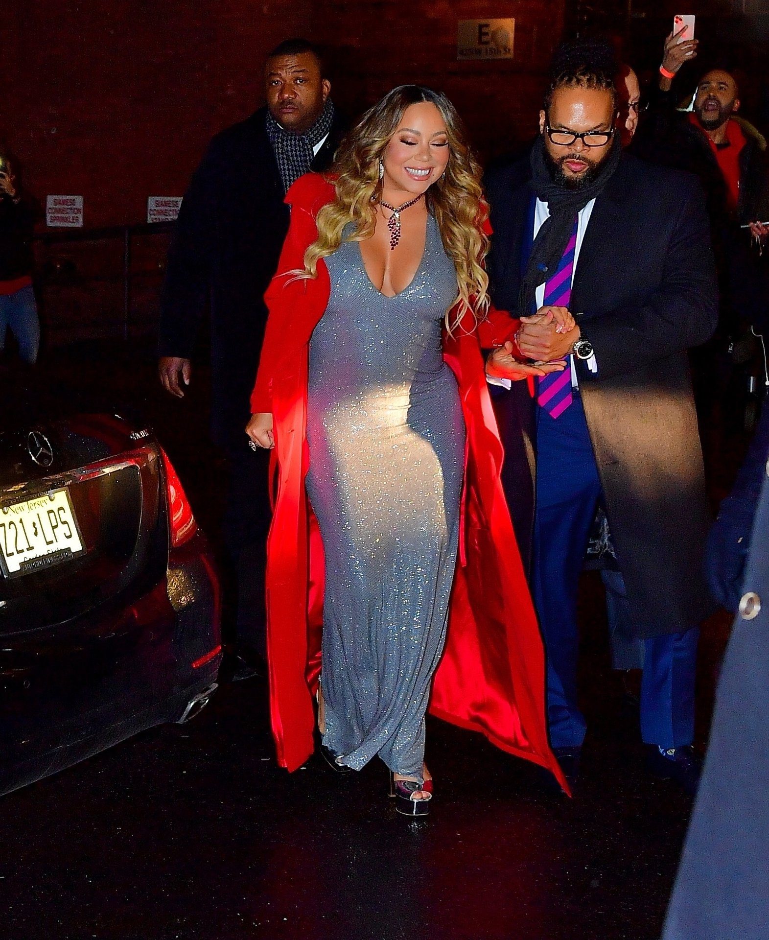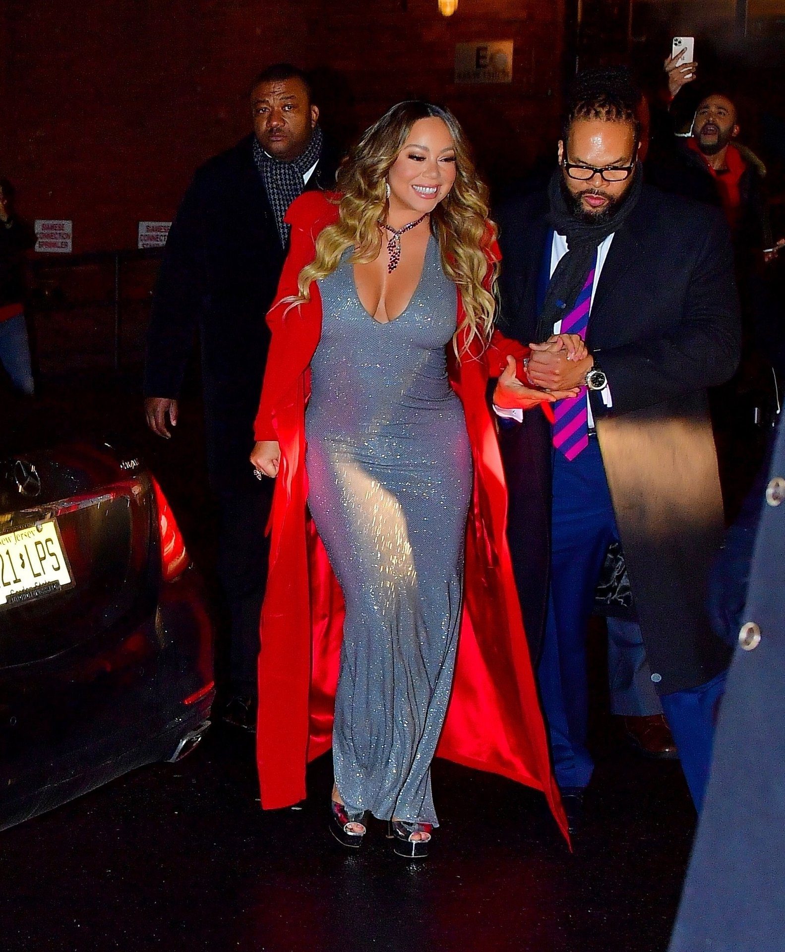 Festive Mariah Carey steps out in a silver gown and red overcoat to celebrate the 25th Anniversary of her hit holiday song “All I Want For Christmas Is You” in New York, 12/17/2019.