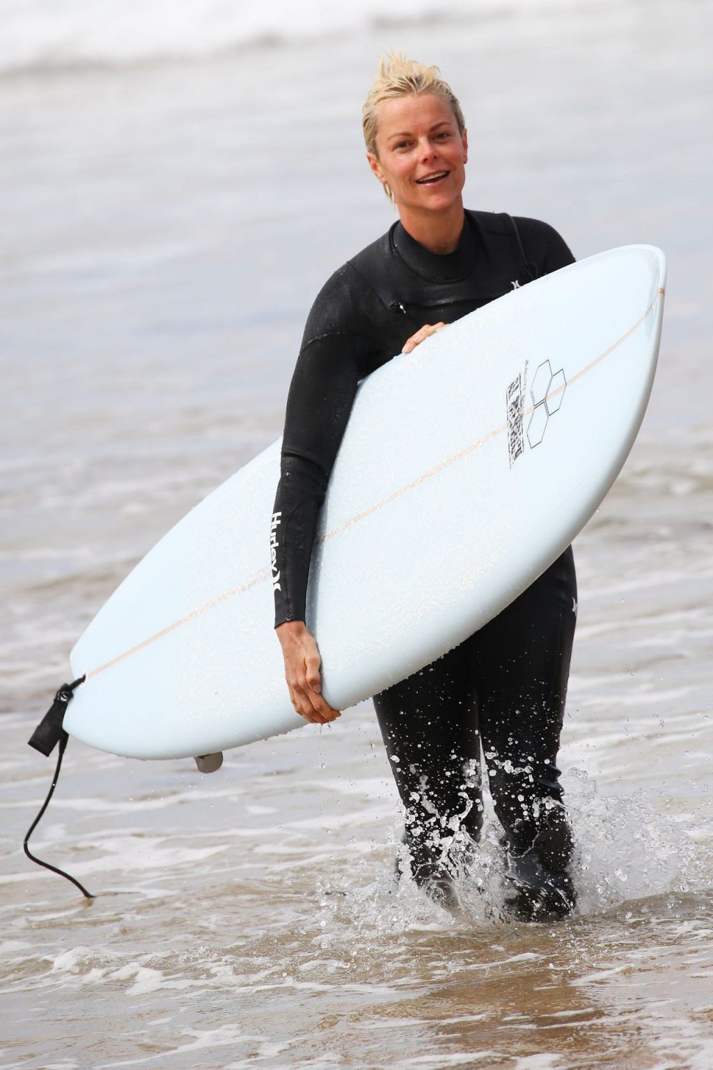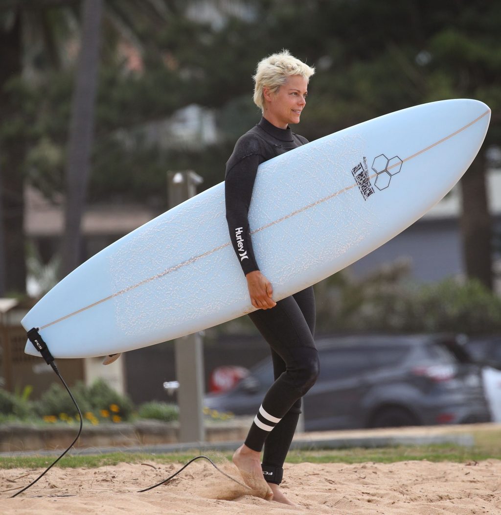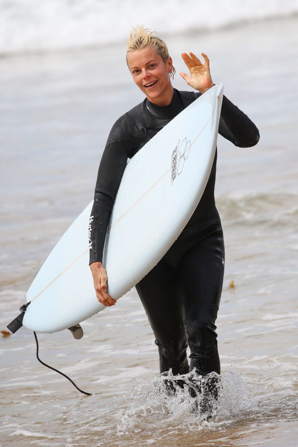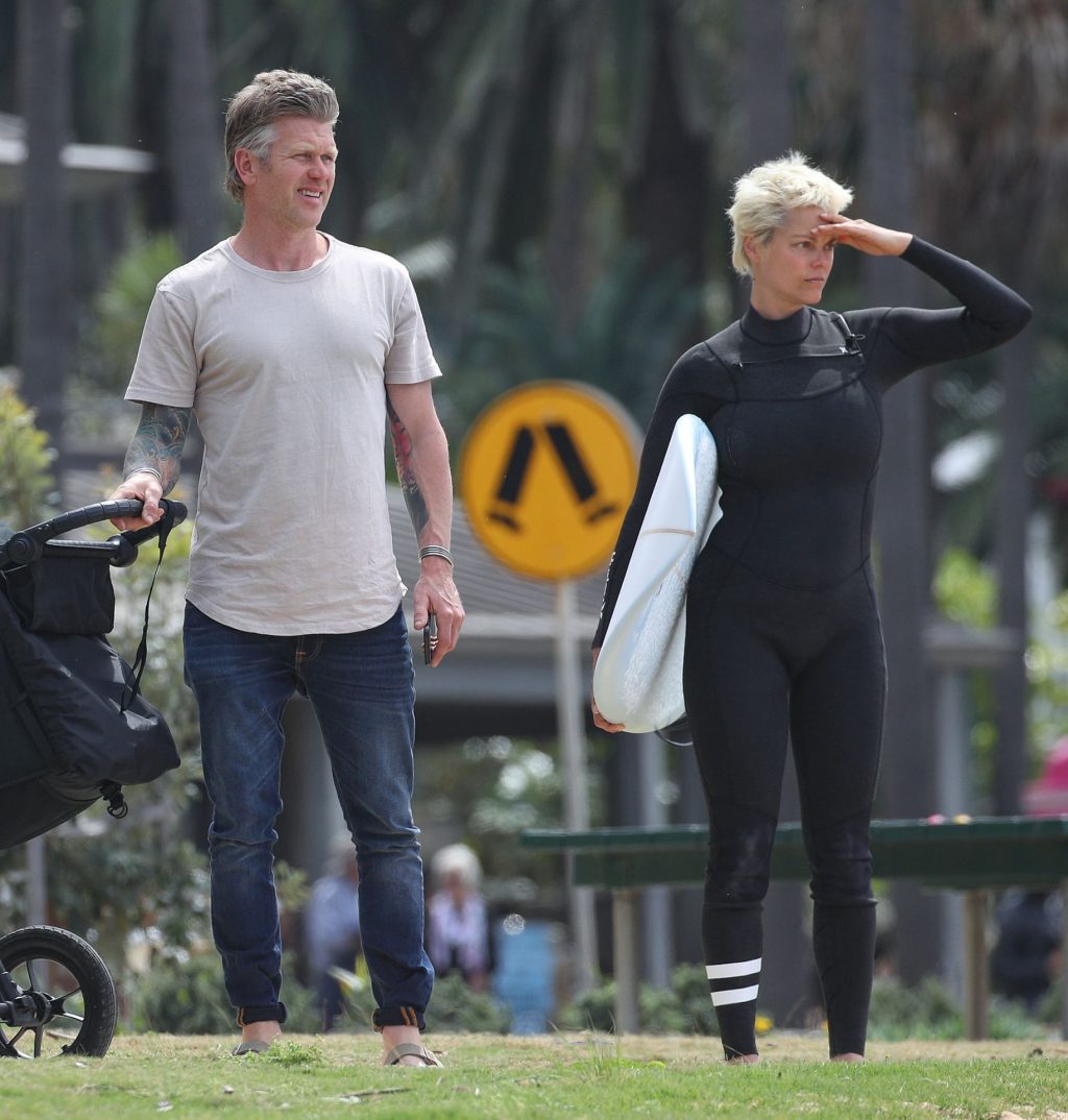 Former MKR contestant Scott Gooding and daughter of Bryan Brown and Rachel Ward, Matilda Brown is pictured surfing in Sydney, 09/27/2019.