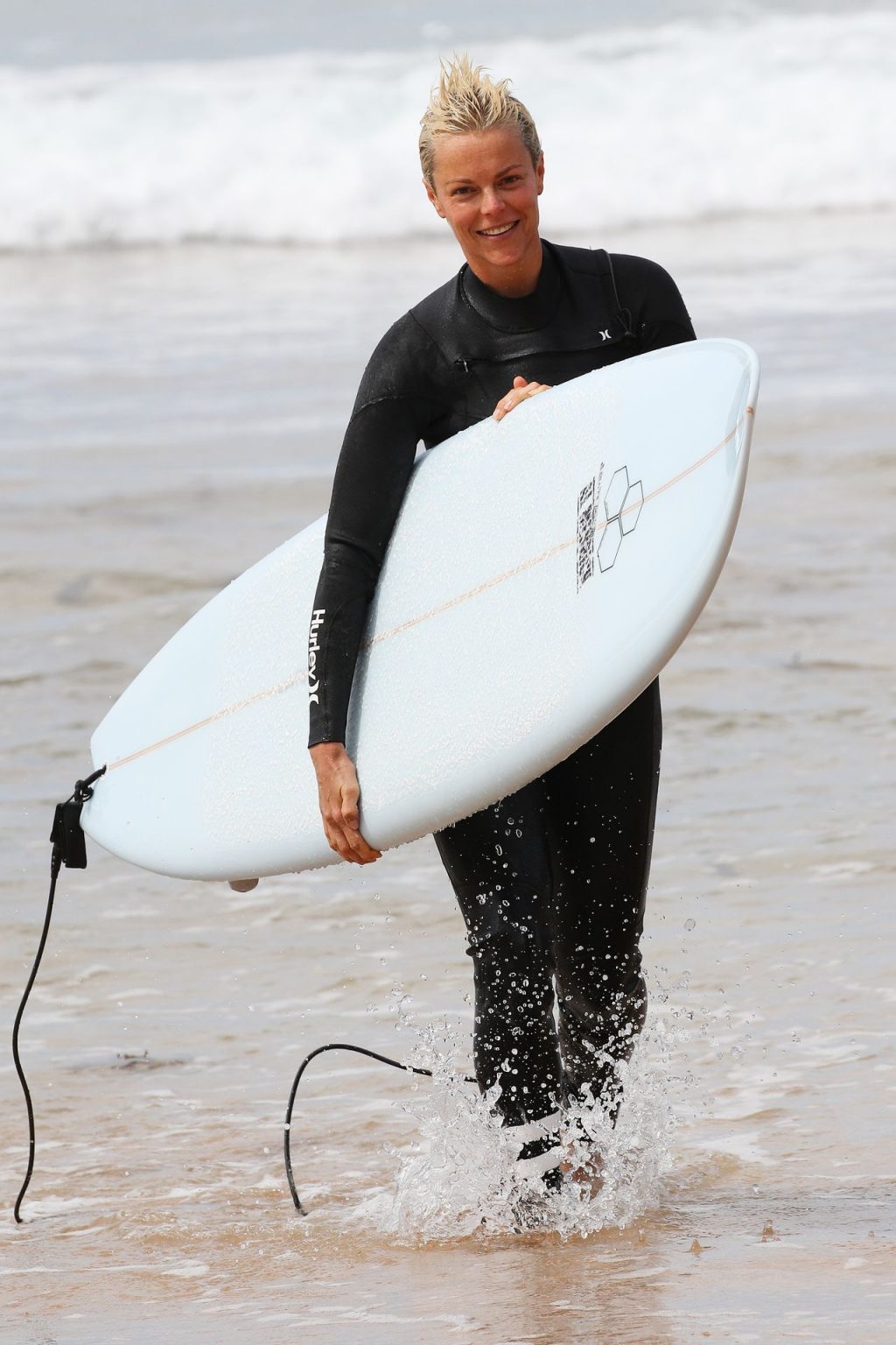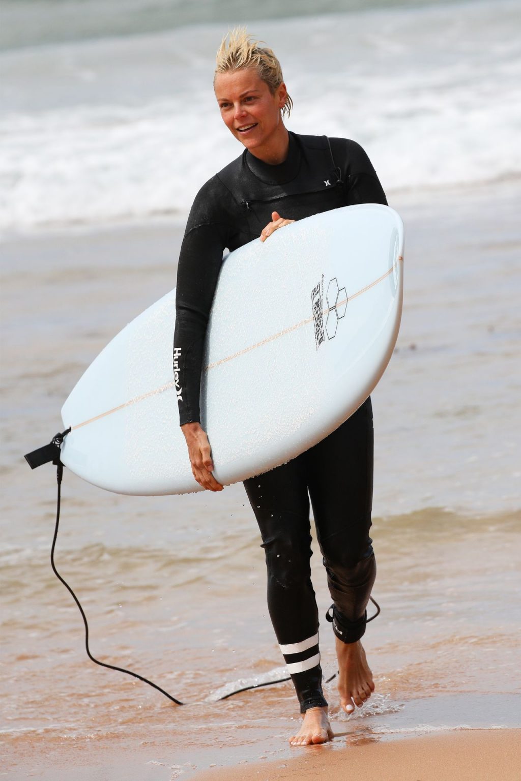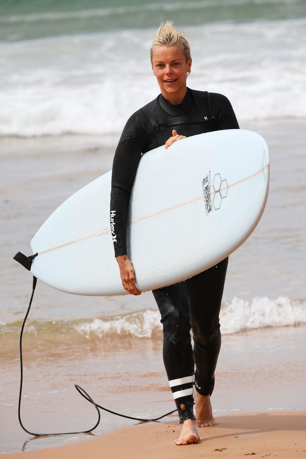 Former MKR contestant Scott Gooding and daughter of Bryan Brown and Rachel Ward, Matilda Brown is pictured surfing in Sydney, 09/27/2019.