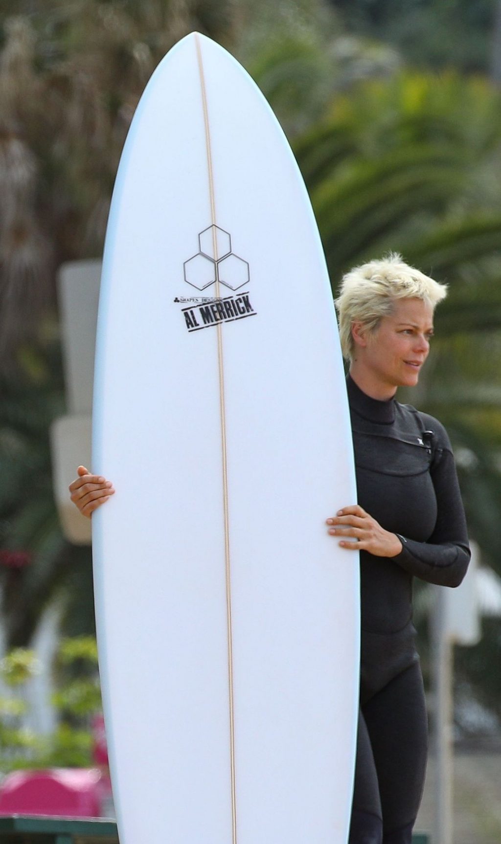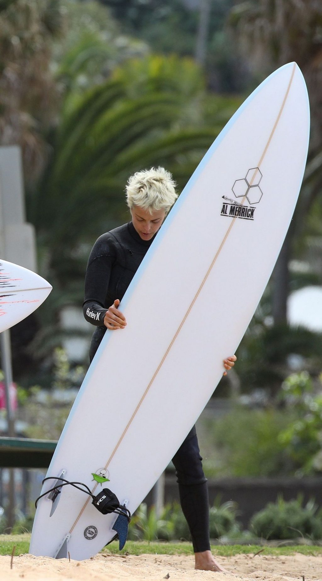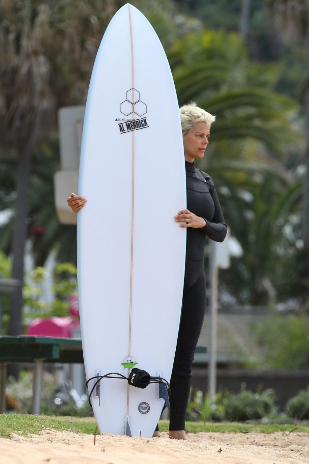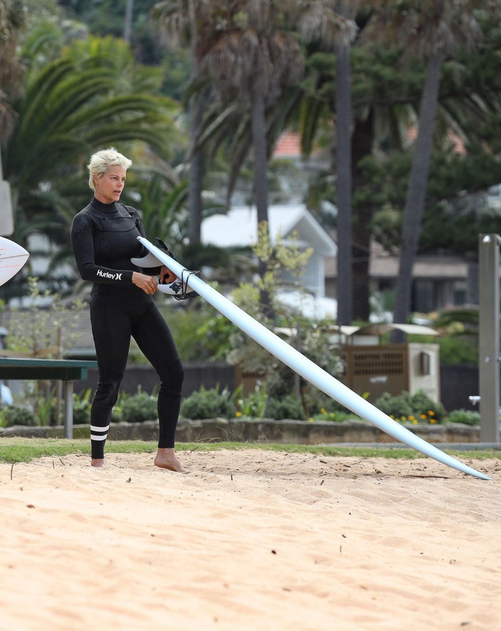 Former MKR contestant Scott Gooding and daughter of Bryan Brown and Rachel Ward, Matilda Brown is pictured surfing in Sydney, 09/27/2019.