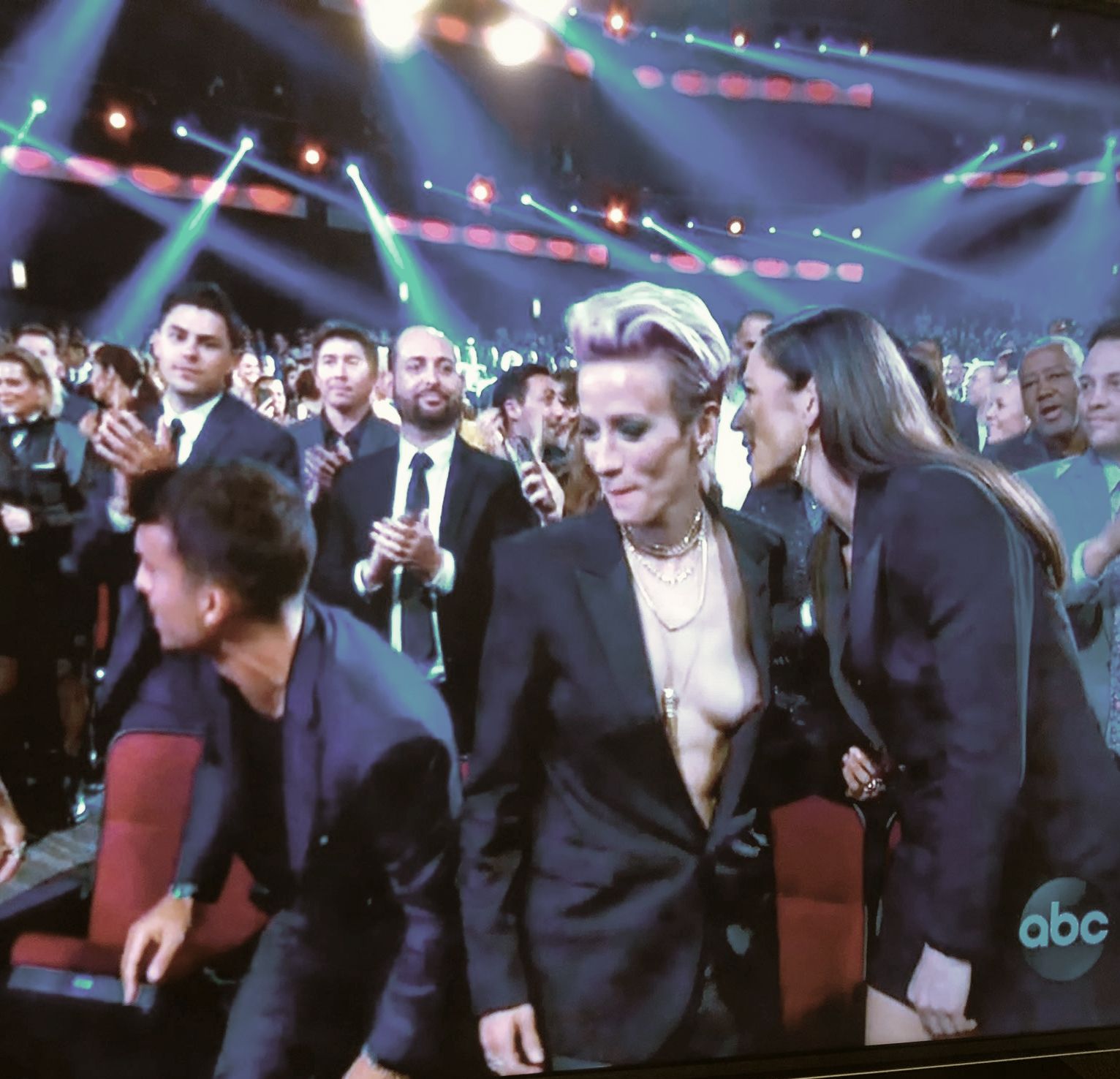 American soccer player Megan Rapinoe has a wardrobe malfunction (tit/nip slip) at the 2019 ESPY Awards, 07/11/2019. Her ball looks great!