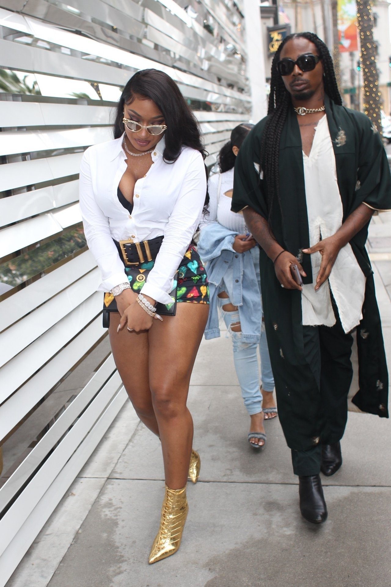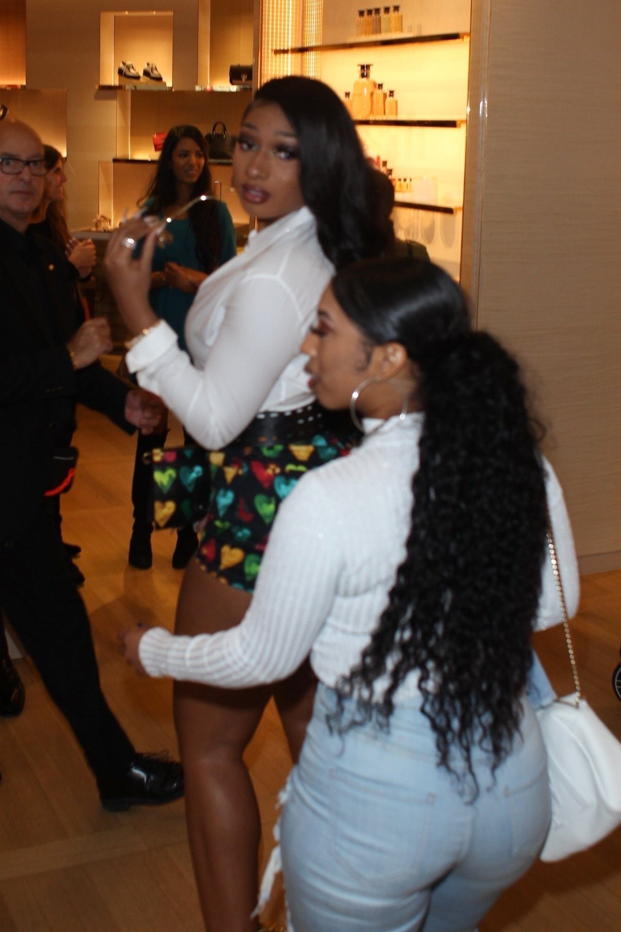 Rapper Megan Thee Stallion (24) and stylist EJ King shop with a friend at Louis Vuitton on Rodeo Drive in Beverly Hills, 12/07/2019.