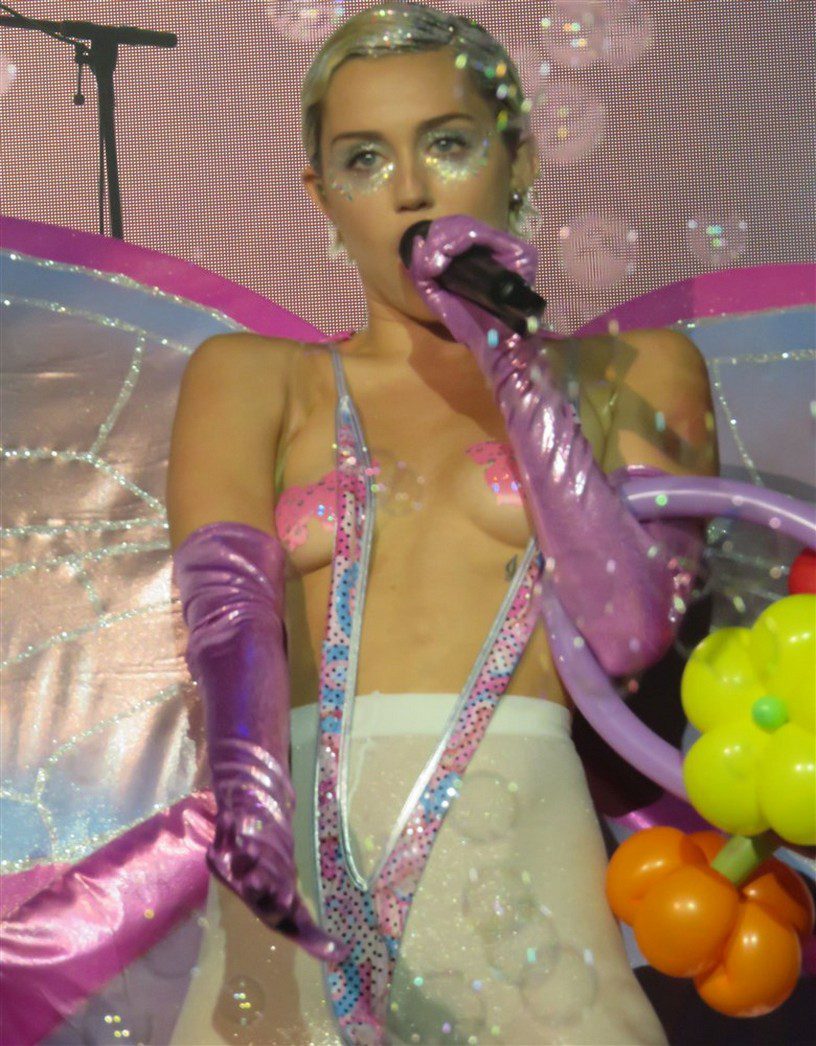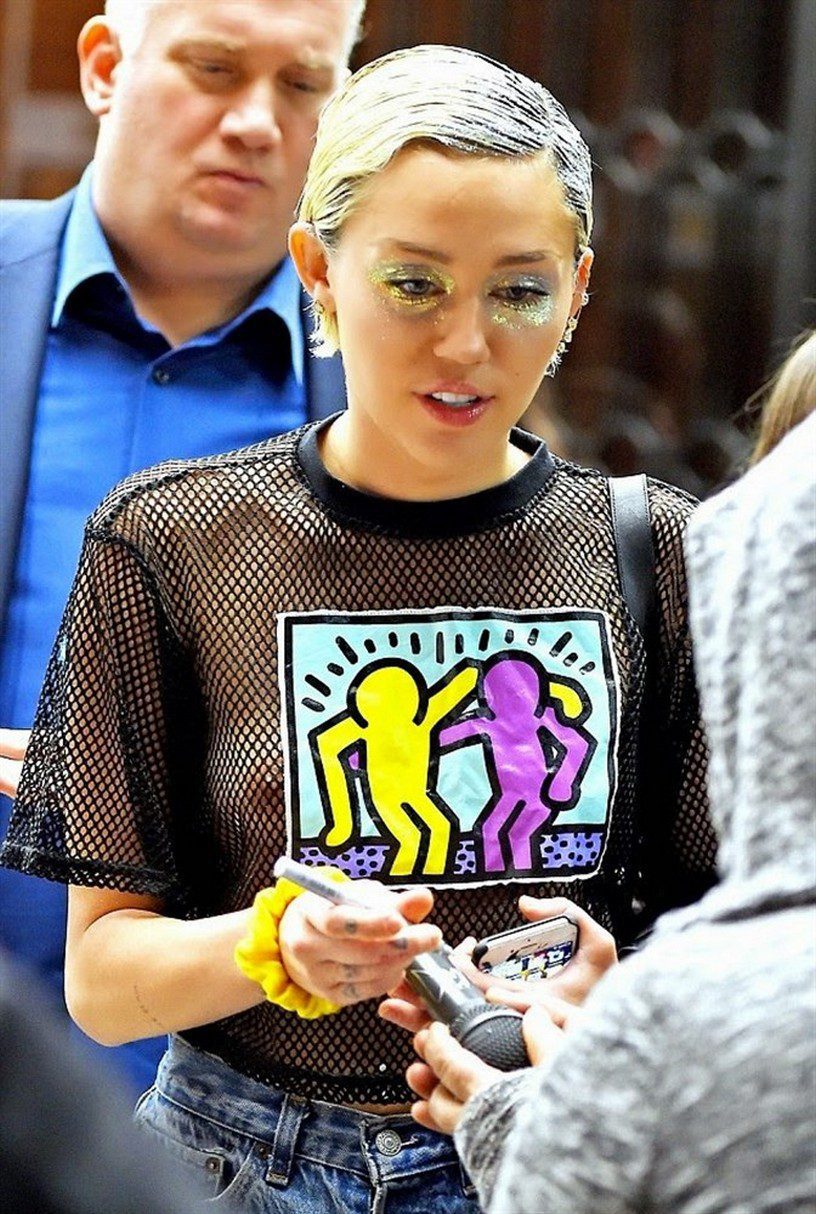 Miley Cyrus shows her breasts in a mesh top at the Adult Swim Upfront Party in the photos below.